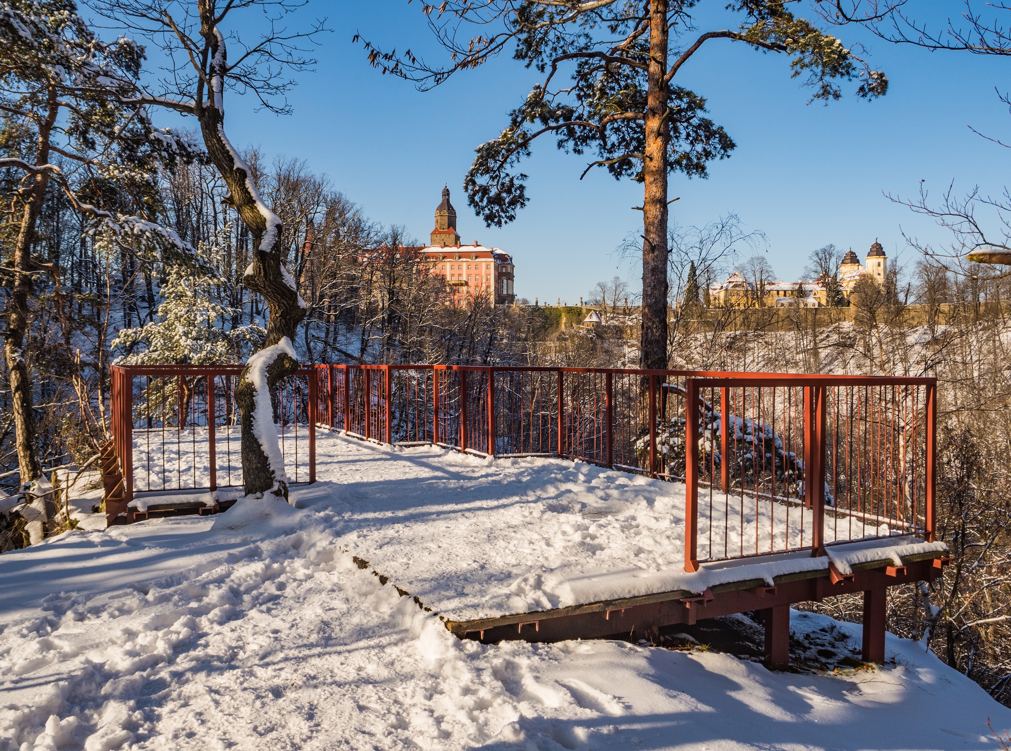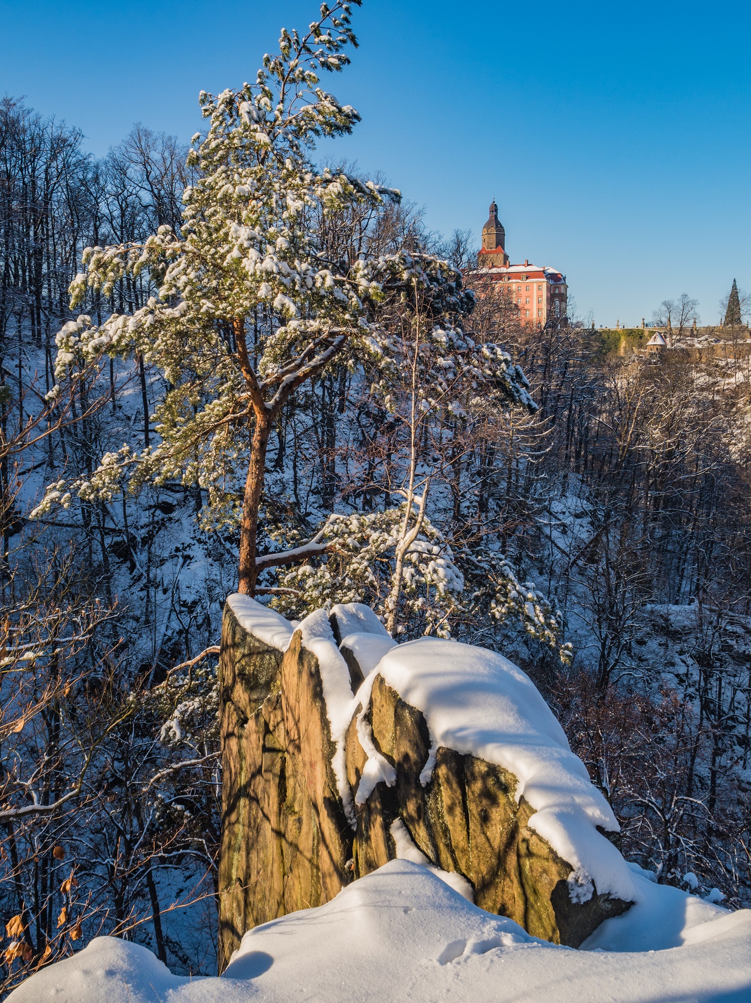 Zima daje doskonałą okazję by z Dziedzińca Honorowego Zamku rzucić okiem na okolicę i dojrzeć to co w miesiącach „liściastych” widoczne nie jest. Największe wrażenie robią po prostu… ściany wąwozu Pełcznicy, odsłonięte i pokazujące jak bardzo strome są. To naprawdę kawał górskiego landszaftu. Widziana z dziedzińca platforma na Grobie Olbrzyma oddalona jest o 15 minut spaceru. Przed ruszeniem na Ścieżkę Hochbergów podskoczyłem właśnie tam, ale z racji, że jest to najpopularniejszy punkt do fotografowania Zamku trzeba liczyć się z tym, że można chwilkę poczekać na swoją kolej do pofocenia. Grób Olbrzyma swa nazwę zawdzięcza legendzie, znaczy się wielu różnym podaniom. Ja podzielę się taką interpretacją jednej: