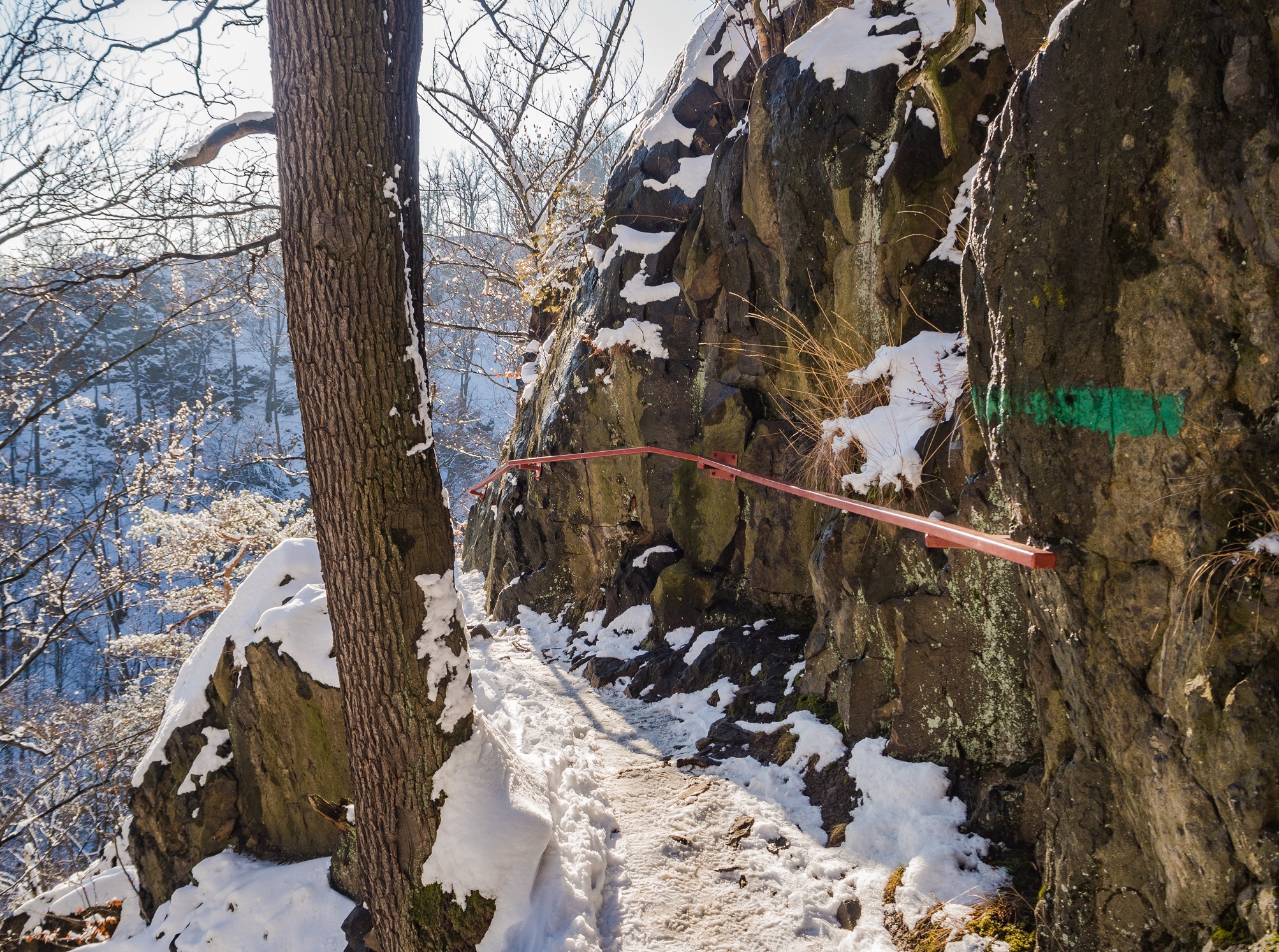 I zaraz potem rozpoczyna się najfajniejszy fragment szlaku. W każdym razie jest on klawy zimą kiedy to na drzewach brak liści i można podziwiać dość konkretną potęgę wąwozu Pełcznicy. Ścieżka na skraju przepaści robi wrażenie, adrenalina leciutko skacze w górę, nie było jednak momentu kiedy poczułbym, że szlak robi się niebezpieczny. Tam gdzie człowiek sam nie dałby sobie rady wybudowane są mostki i kładki – najbardziej znany Diabelski Mostek swoją pierwszą wariacją mógł poszczycić się już dobre kilkadziesiąt lat temu i powiem wam, spoglądając na starsze zdjęcia zastanawiam się czy miałbym odwagę wtedy ścieżką wędrować. W każdym razie warto się na nim zatrzymać bo to też świetne miejsce na zrobienie kilku kolejnych fotografii.