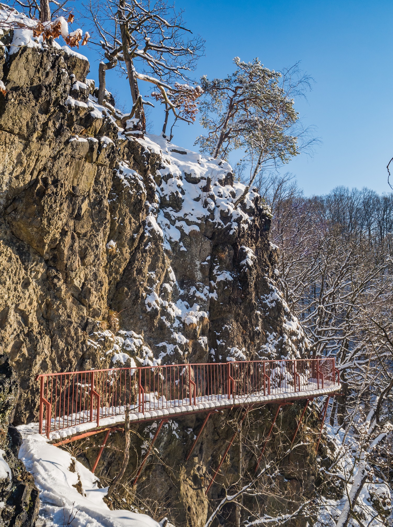 Tym jednak co najbardziej przyciągało mój wzrok były odkryte przez brak liści skalne ściany, imponujące, strome. Szybko zrodziło się pytanie: ciekawe czy w okolicach znajdę jakieś skałki do wspinaczki? Albo inaczej: raczej nie czy, tylko ile i gdzie? Szybki risercz i okazuje się, że całkiem niemało więc jeśli ktoś lubi się powspinać to i tu znajdzie coś dla siebie – Wałbrzyski Klub Górski i Jaskiniowy przygotował ściągę.