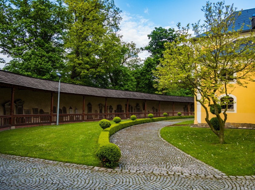 A odnośnie sąsiadów to warto zwrócić uwagę na kościół pw. Św. Marcina. Otoczony murem jest jednym z kilku na Ziemi Kłodzkiej, które pierwotnie pełniły również funkcje obronne – dziś po otworach strzelniczych w murach nie ma już jednak śladu. Tym co mocno mnie zaskoczyło były za to biegnące wzdłuż murów krużganki i PRZEDE WSZYSTKIM wmurowane weń płyty nagrobne dawnych mieszkańców wsi. Naprawdę dawnych, najstarsze płyty pochodzą z XVIII wieku. W takich miejscach zawsze zwalniam i zatapiam się w historii…