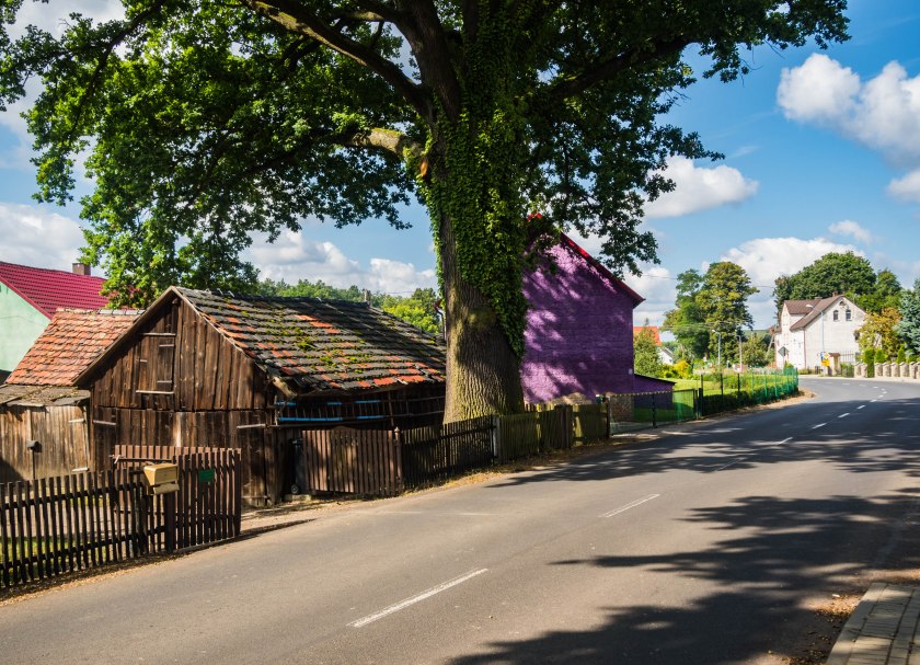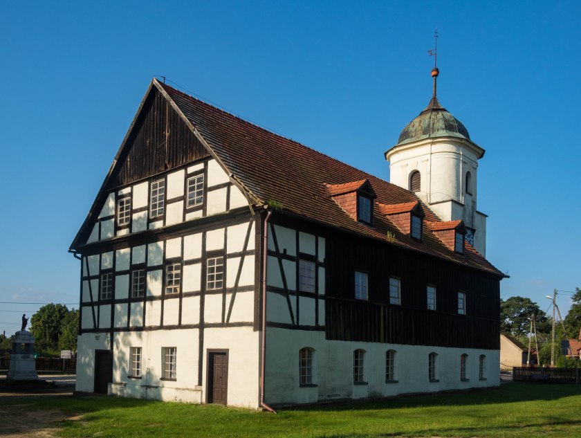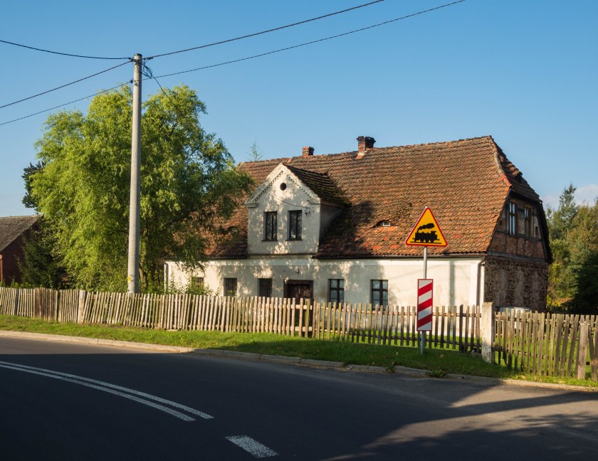 Poranny spacer po wsi to piękne połączenie ciszy, spokoju i pustki. Słońce przyjemnie grzało, ładnie oświetlając wiekowe budynki. Szachulec, mur pruski, czerwona cegła z delikatnym detalem – piękny przegląd dawnej zabudowy.