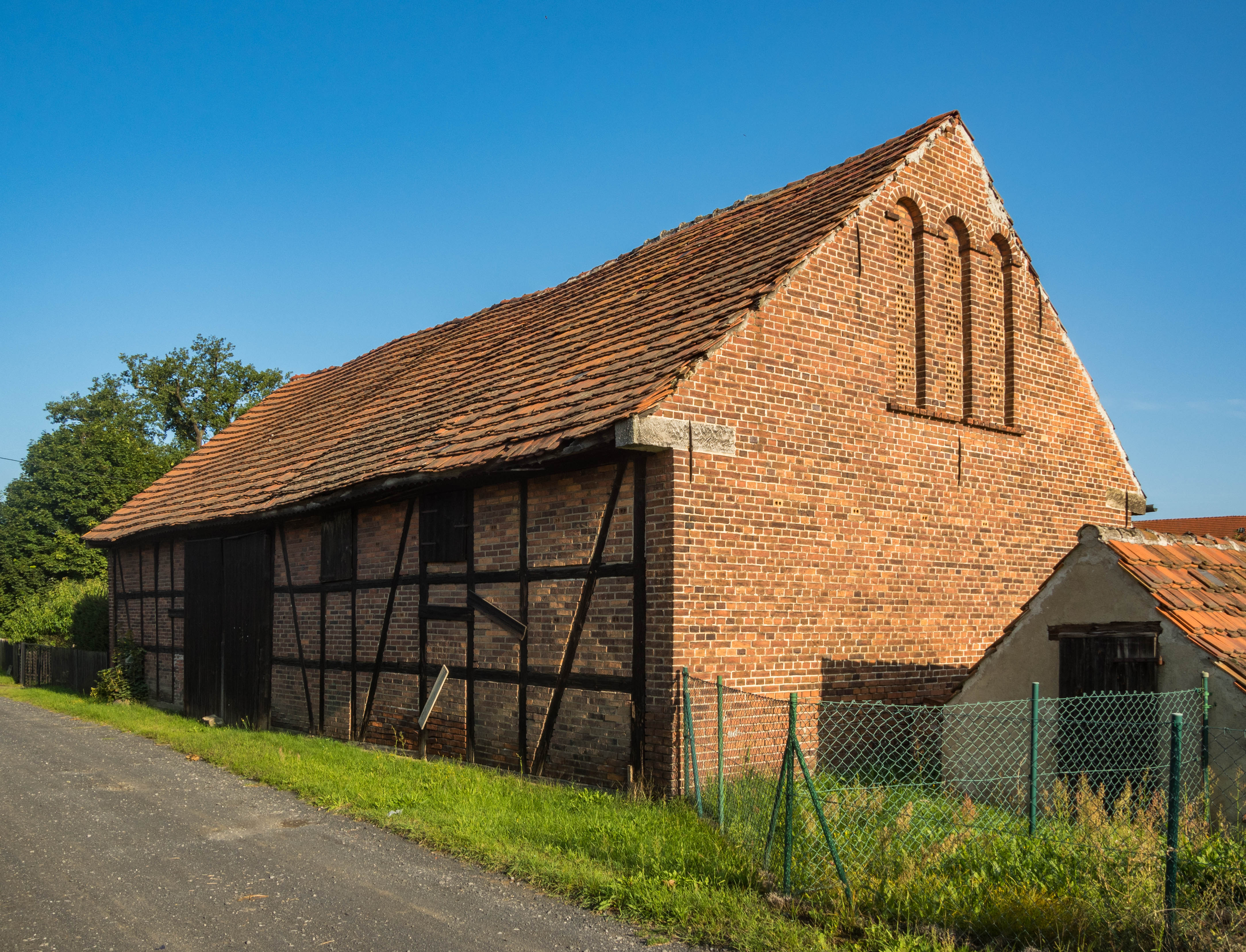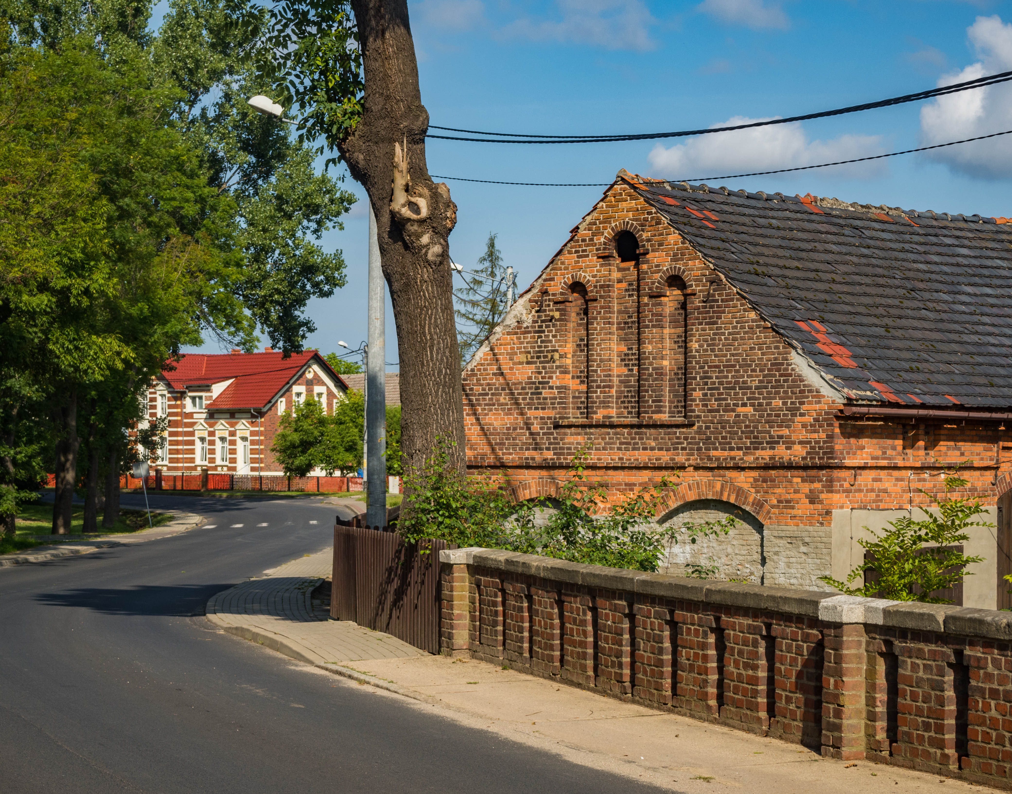 Poranny spacer po wsi to piękne połączenie ciszy, spokoju i pustki. Słońce przyjemnie grzało, ładnie oświetlając wiekowe budynki. Szachulec, mur pruski, czerwona cegła z delikatnym detalem – piękny przegląd dawnej zabudowy.