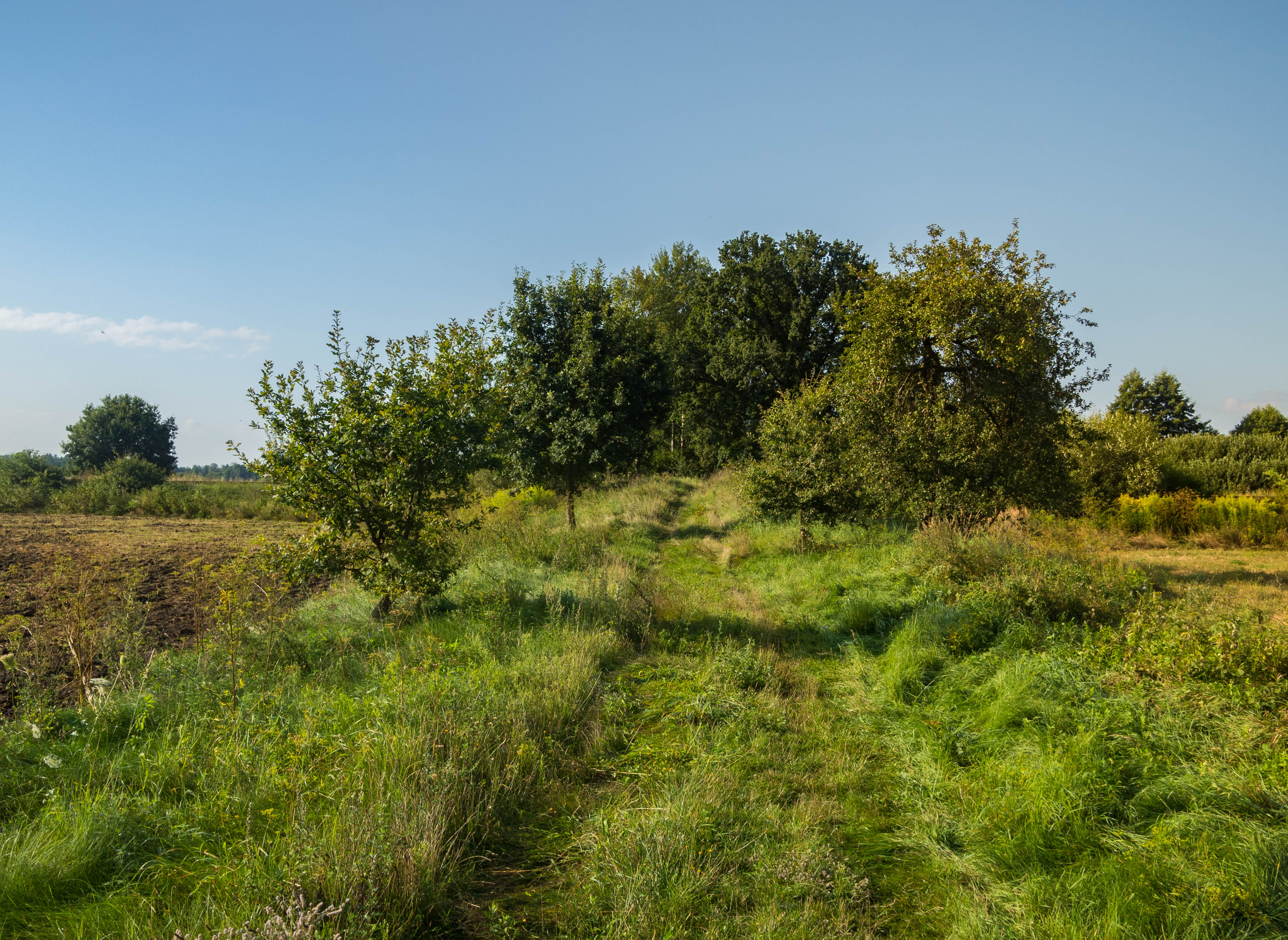 Dalej szlak biegnie polami, skrajem lasu, alejami starszych i młodszych drzew, znowu polami. Co i rusz ciszę przerywał tylko klangor żurawi, w oddali kółka wykręcał myszołów – w pełnym majestacie z rozpiętymi skrzydłami robi wrażenie, oj robi. Przy Siekiernej (dopływie Czarnej Wody, która z kolei jest dopływem Kaczawy) oraz na okolicznych polach rozlała się nawłoć, dla której przełom sierpnia i września jest idealną porą na kwitnienie. No pięknie się szło, choć szlak strasznie miejscami był rozjeżdżony przez traktory czy inne cięższe pojazdy.