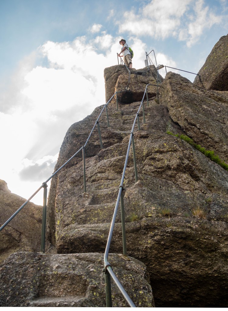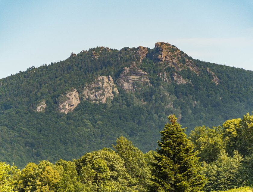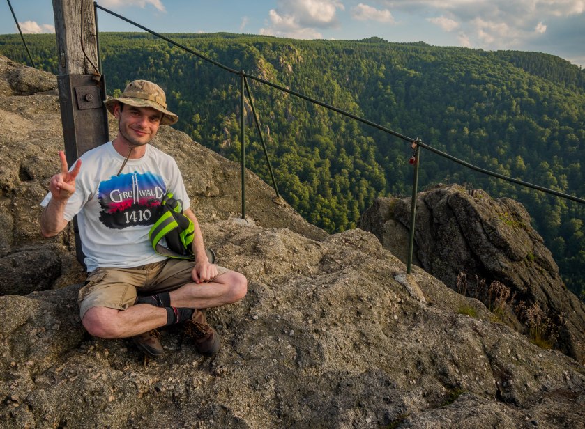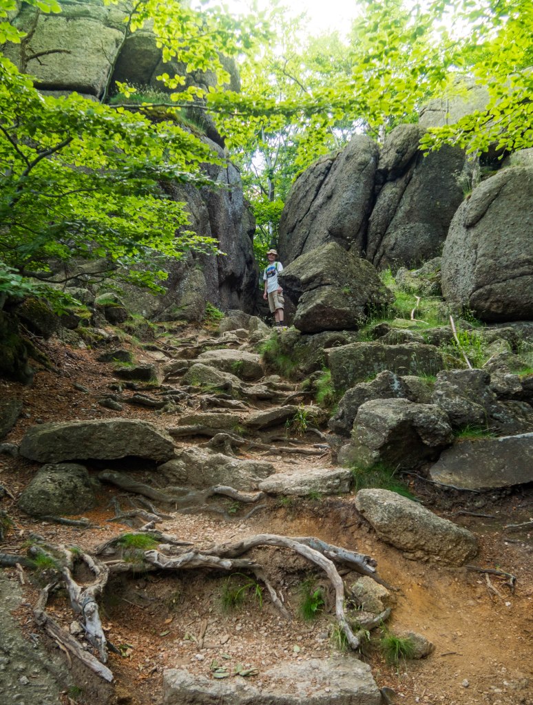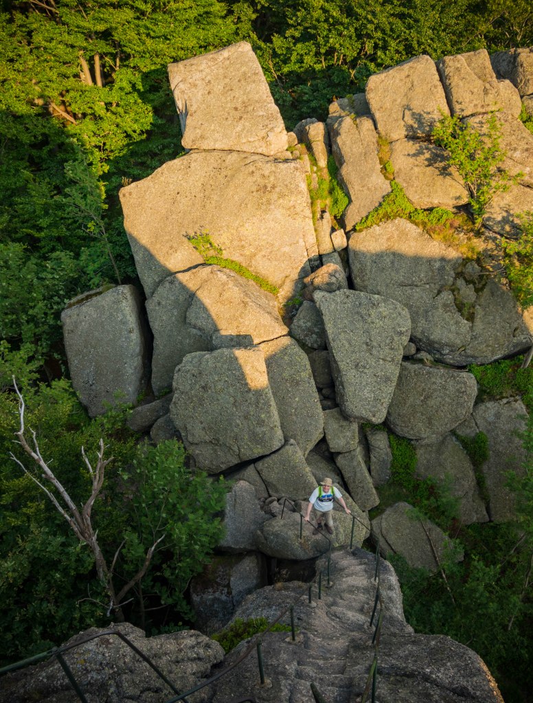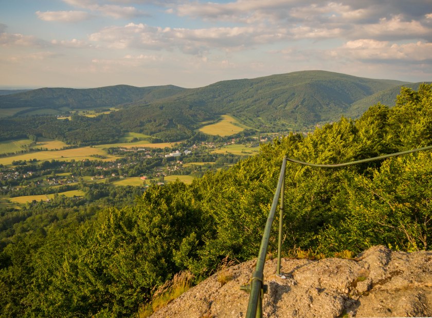 Ostatnie fragmenty szlaku to piękna wizytówka czeskiej strony Gór Izerskich, właśnie z ostrzejszymi podejściami, mnóstwem skał po drodze i na absolutnie końcowym fragmencie wspinaczką na punkt widokowy, wielce odlotowy. Wyciosane w skalnych blokach schodki i metalowe wspomagacze pomogą wejść nawet osobom z lękiem wysokości (mój brat przykładem), choć nie powiem ekspozycja potrafi przyśpieszyć bicie serca.