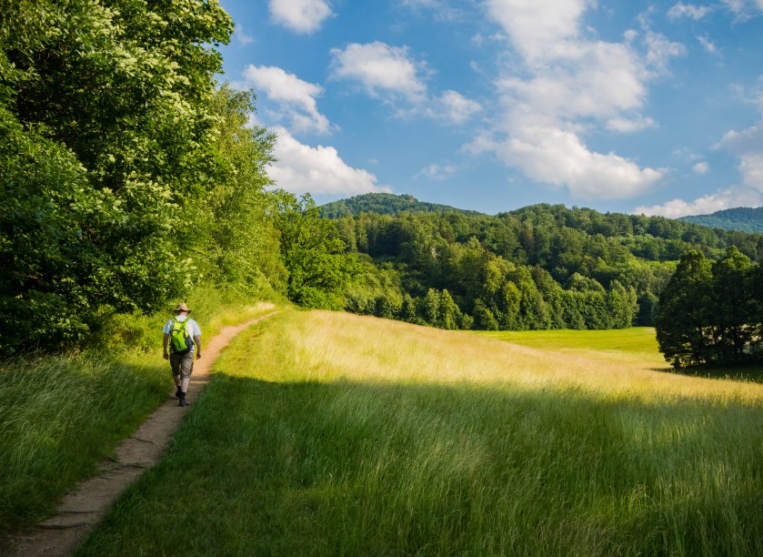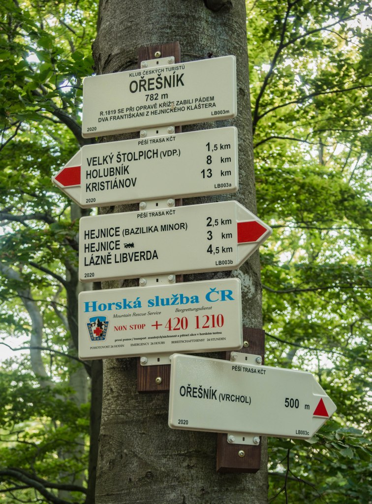 Tym razem naszym celem został Ořešník, ten jeden pagór idealnie komponujący się z hejnicką bazyliką. Szlak z Hejnic w suchych liczbach 430 metrów w górę, które pokonuje się na dystansie 3 kilometrów w czasie do 90 minut. To spacer diablo ciekawy: pierw uliczkami, potem łagodnym i urokliwym bukowo-dębowym lasem aż w końcu solidniejszym podejściem, któremu im bliżej szczytu towarzyszy coraz więcej skał.