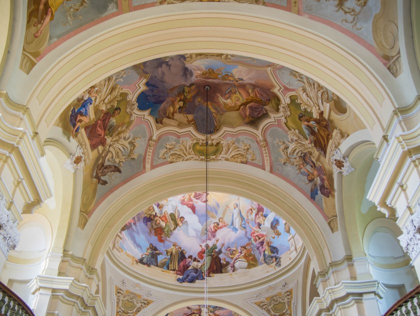 Tym chyba co robi największe wrażenie i uznajmy to za primo ultimo są wnętrza. Przepastne, barokowo hipnotyzująco-iluzjonistyczne, mające doprowadzić do spotkania szczęki z podłogą. Przepiękne freski z nowotestamentowymi motywami pokrywające olbrzymią część sufitu to dzieła Andreassa Grolla z Wiednia. Robią kolosalne wrażenie.