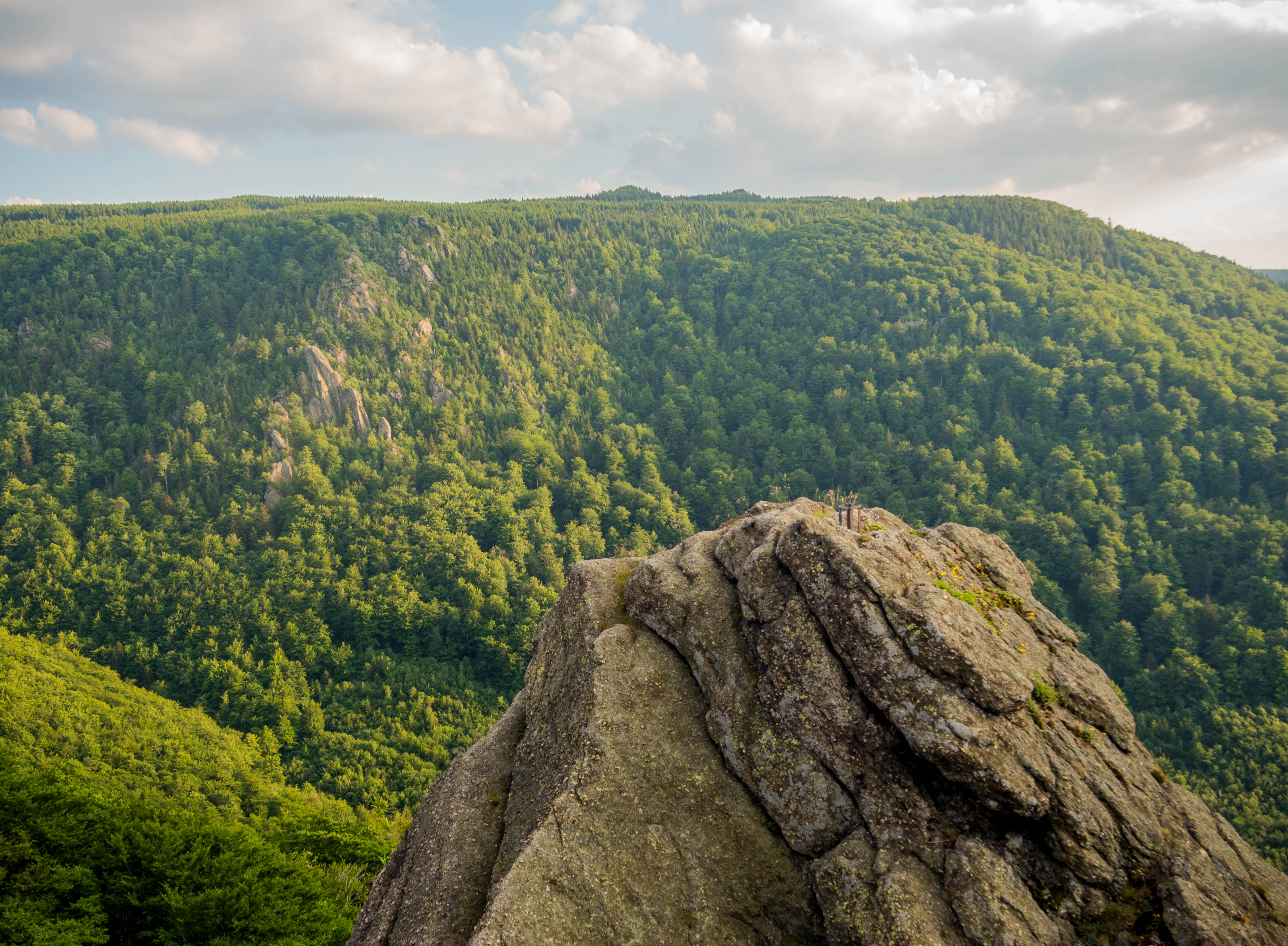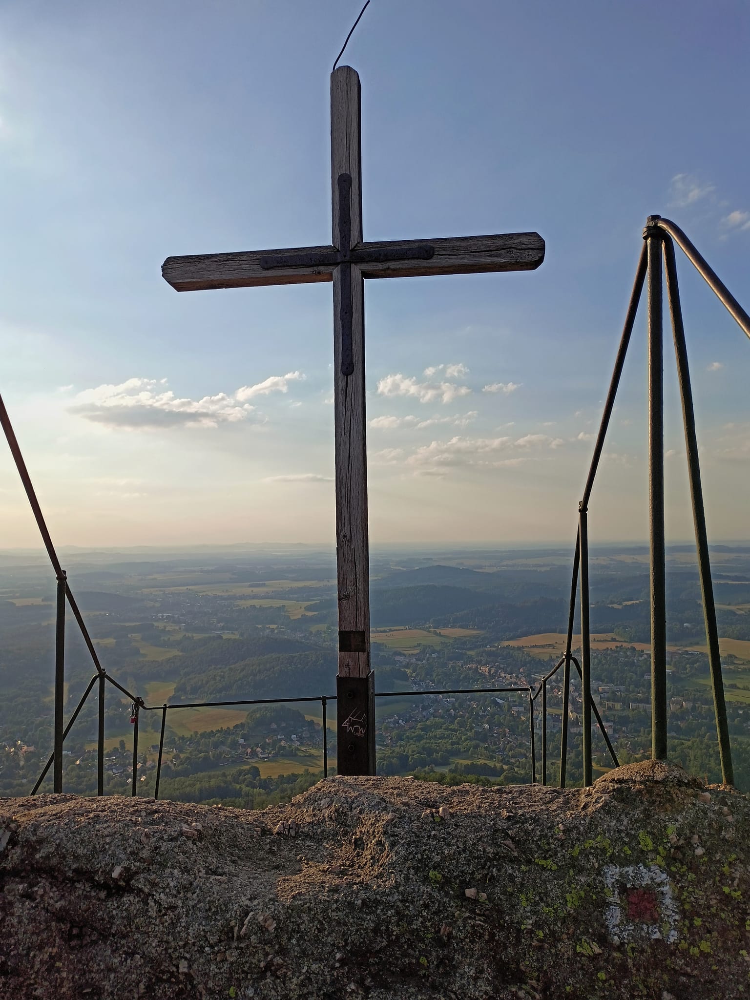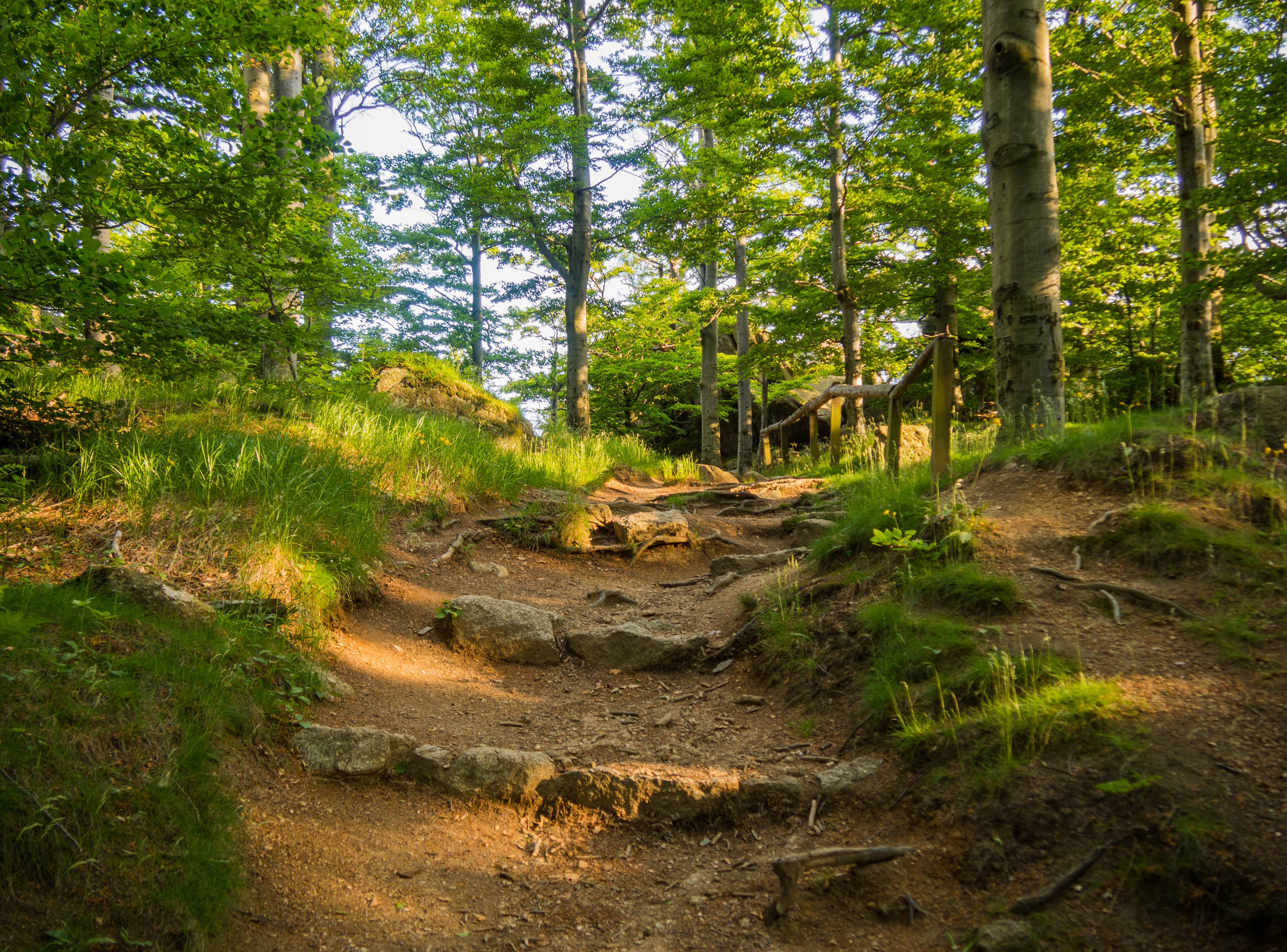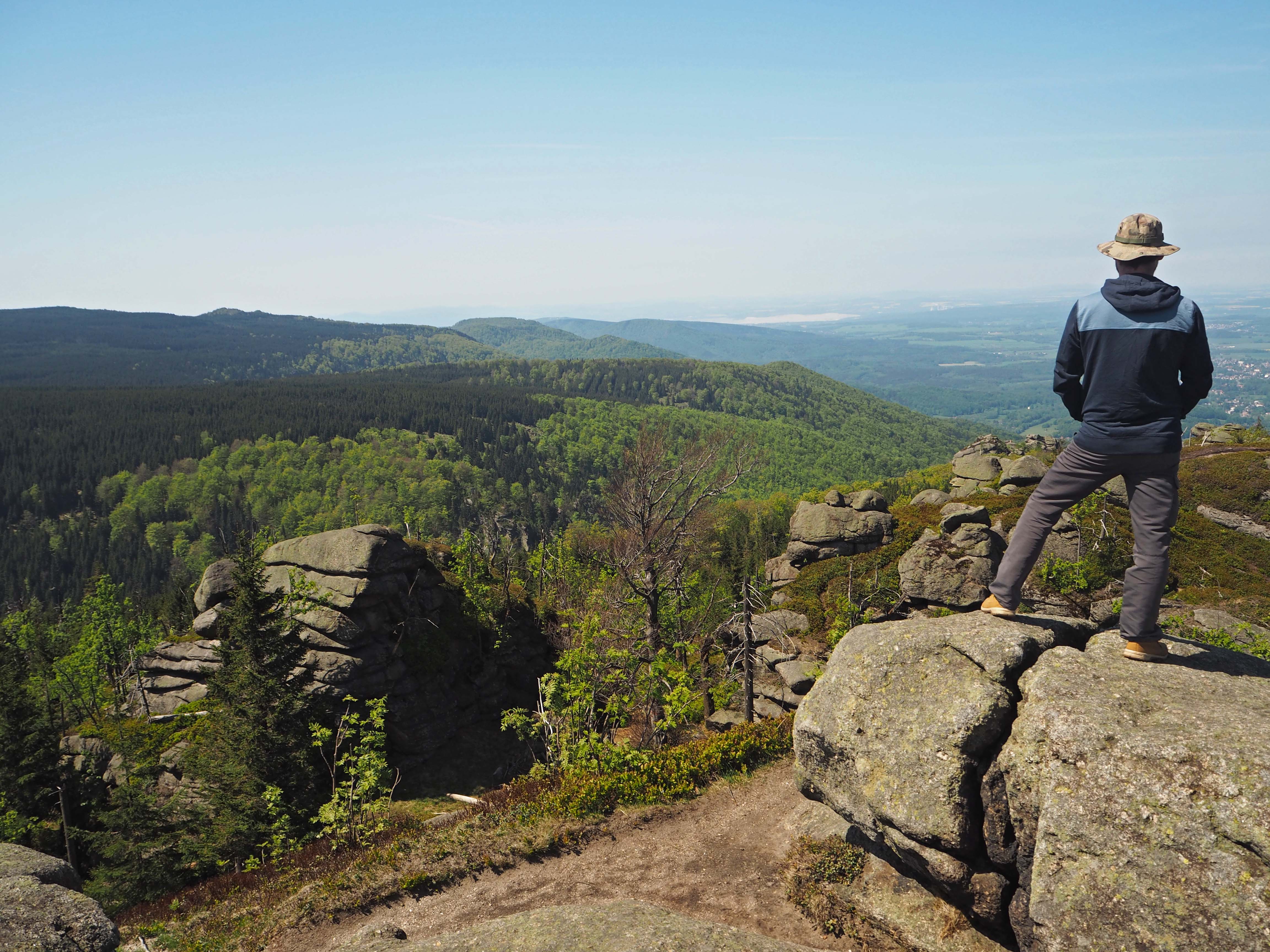 Ostatnie fragmenty szlaku to piękna wizytówka czeskiej strony Gór Izerskich, właśnie z ostrzejszymi podejściami, mnóstwem skał po drodze i na absolutnie końcowym fragmencie wspinaczką na punkt widokowy, wielce odlotowy. Wyciosane w skalnych blokach schodki i metalowe wspomagacze pomogą wejść nawet osobom z lękiem wysokości (mój brat przykładem), choć nie powiem ekspozycja potrafi przyśpieszyć bicie serca.
