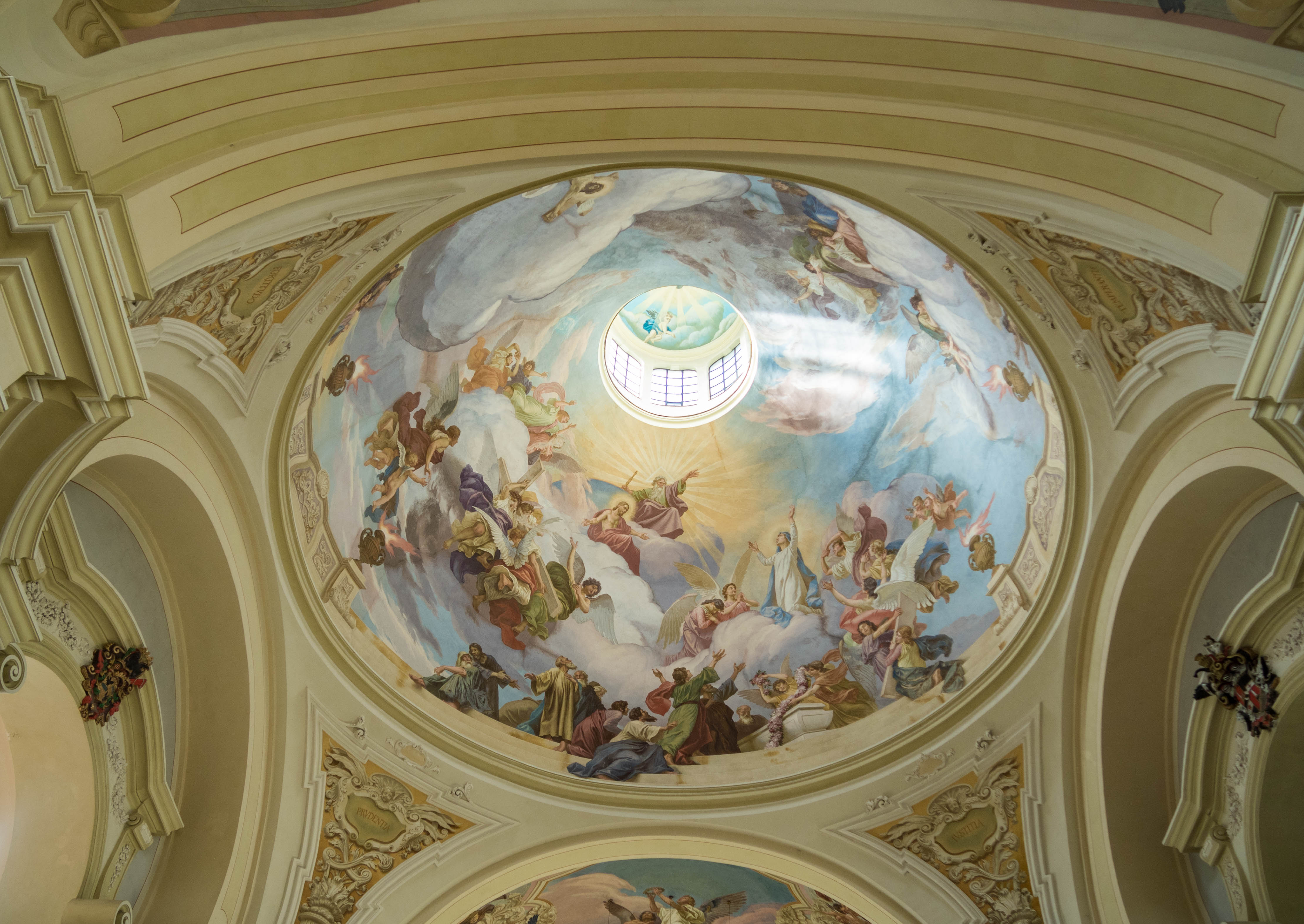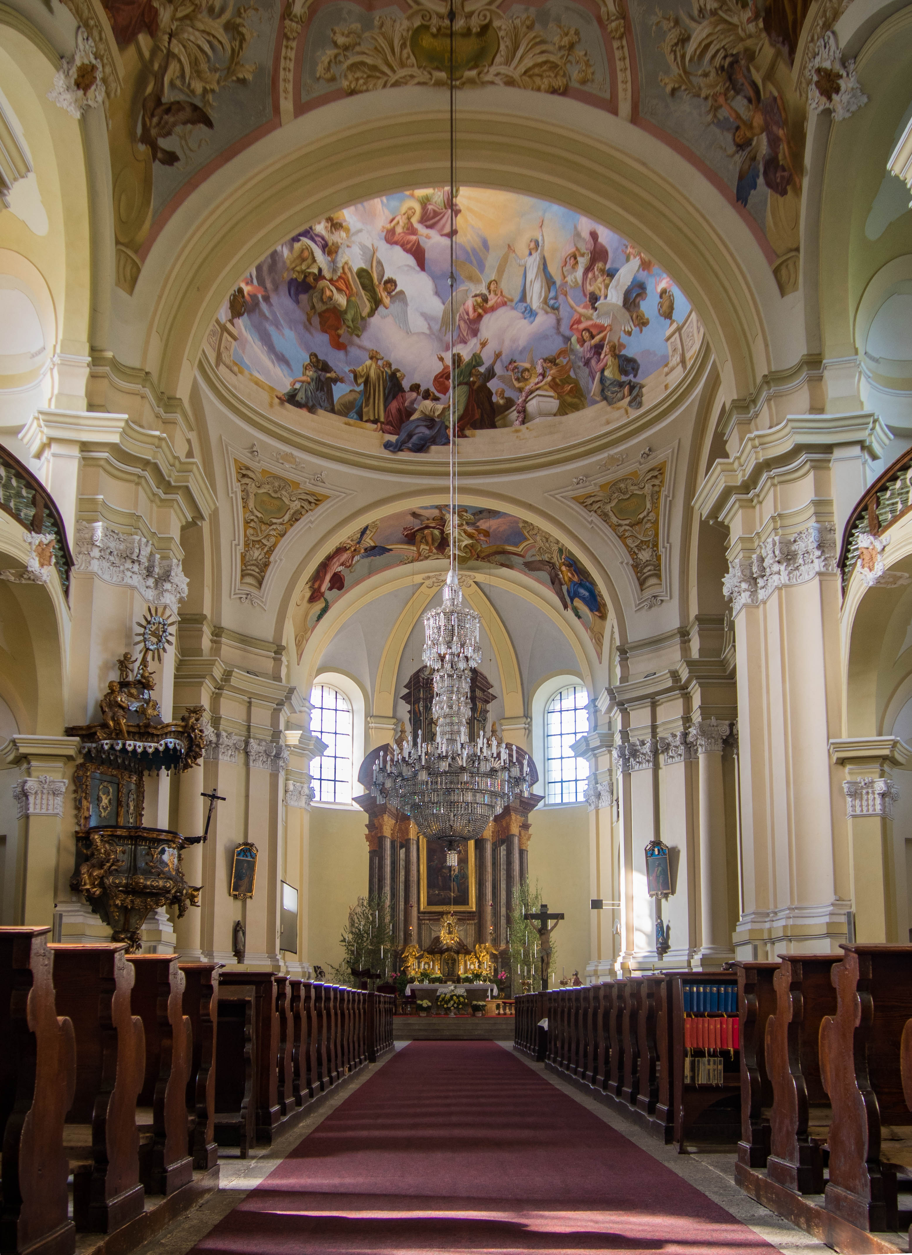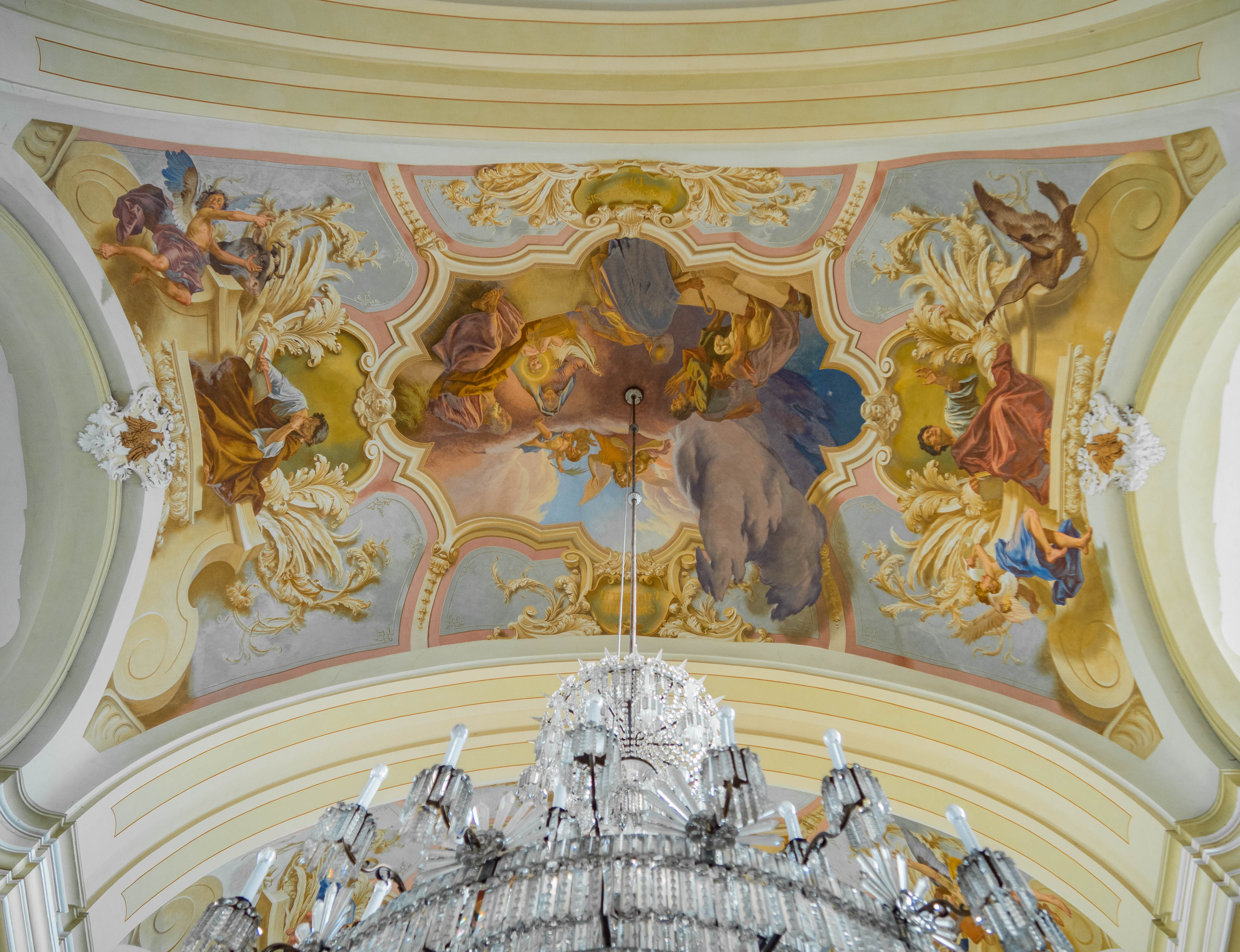 Tym chyba co robi największe wrażenie i uznajmy to za primo ultimo są wnętrza. Przepastne, barokowo hipnotyzująco-iluzjonistyczne, mające doprowadzić do spotkania szczęki z podłogą. Przepiękne freski z nowotestamentowymi motywami pokrywające olbrzymią część sufitu to dzieła Andreassa Grolla z Wiednia. Robią kolosalne wrażenie.