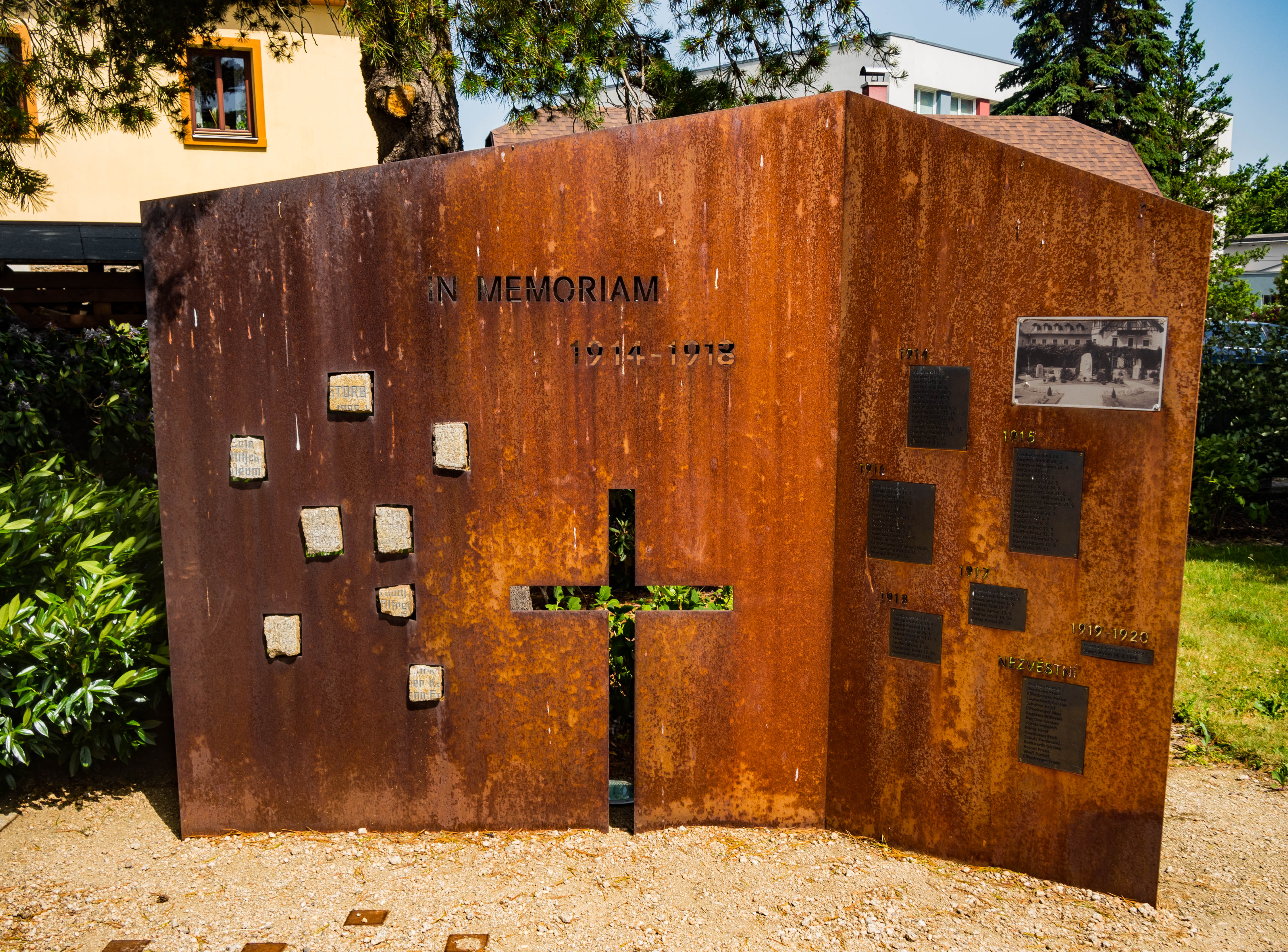Tuż obok na niewielkim placu zwróćcie uwagę na instalację z blachy, w którą wkomponowano kilka kostek brukowych. To jedyne pozostałości po dawnym pomniku pamięci poległych w I Wojnie Światowej. Niegdysiejsza postać kobiety rozpaczającej nad zmarłym bliskim, otoczona granitowymi płytami z nazwiskami została po 1945 roku zniszczona a płyty przerobiono na kostkę brukową, która przez lata znajdowała się w miejscowych chodnikach prowadzących do szkoły. Dopiero kilka lat temu, ktoś się zorientował, kostki pozbierał i tak powstała dzisiejsza instalacja, rzeźba. Liczba niegdysiejszych mieszkańców, którzy polegli na frontach IWŚ robi wrażenie.