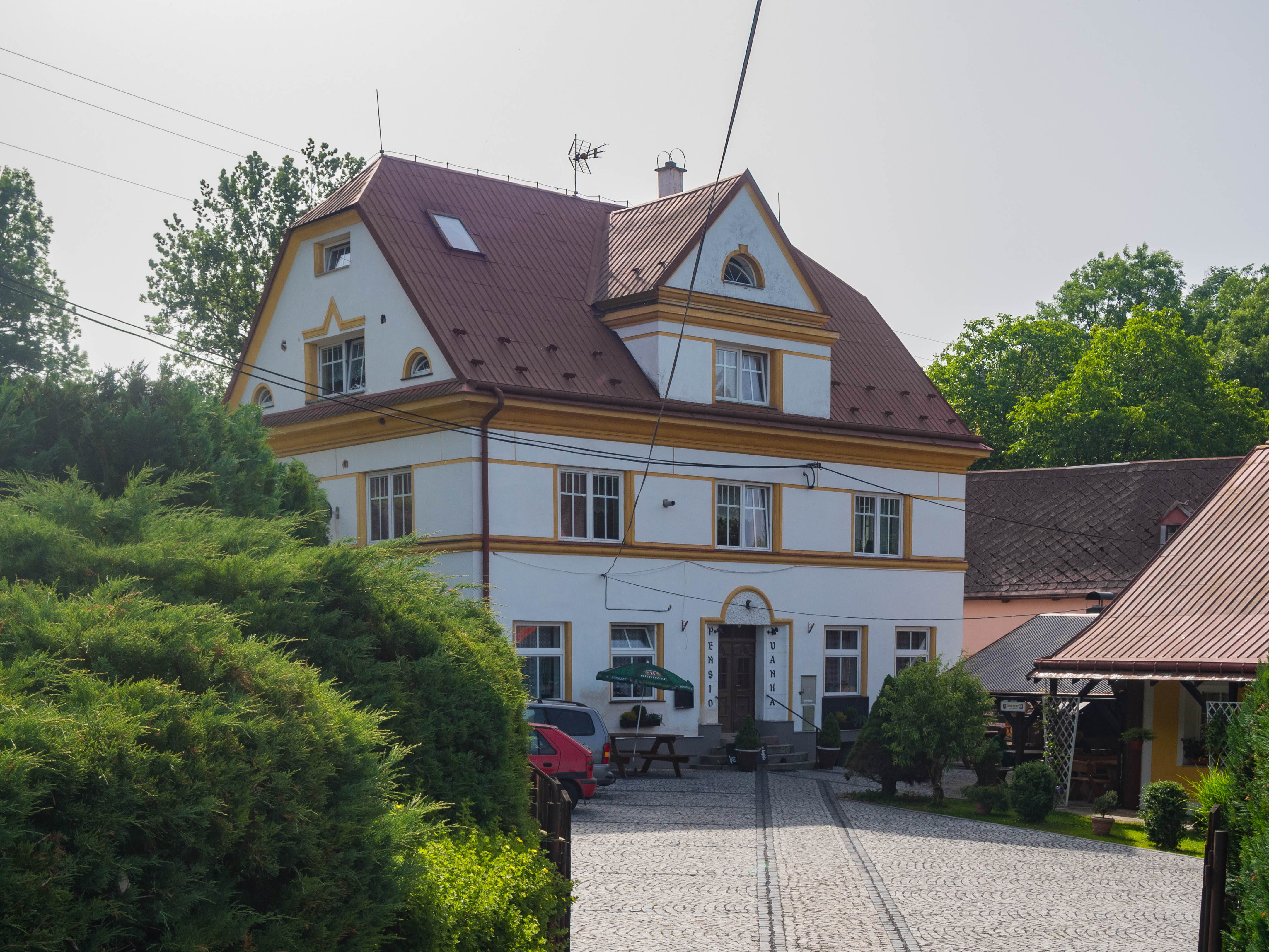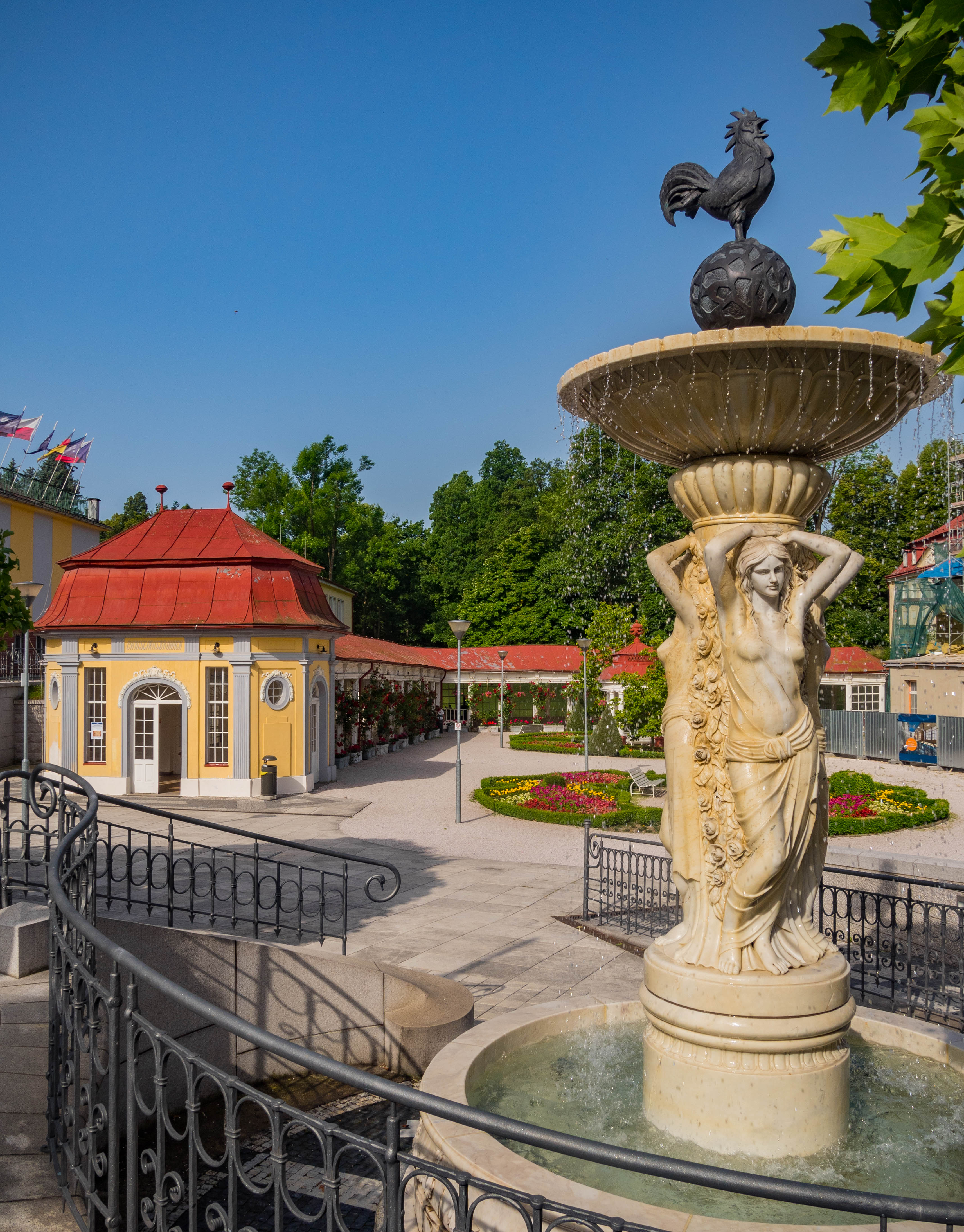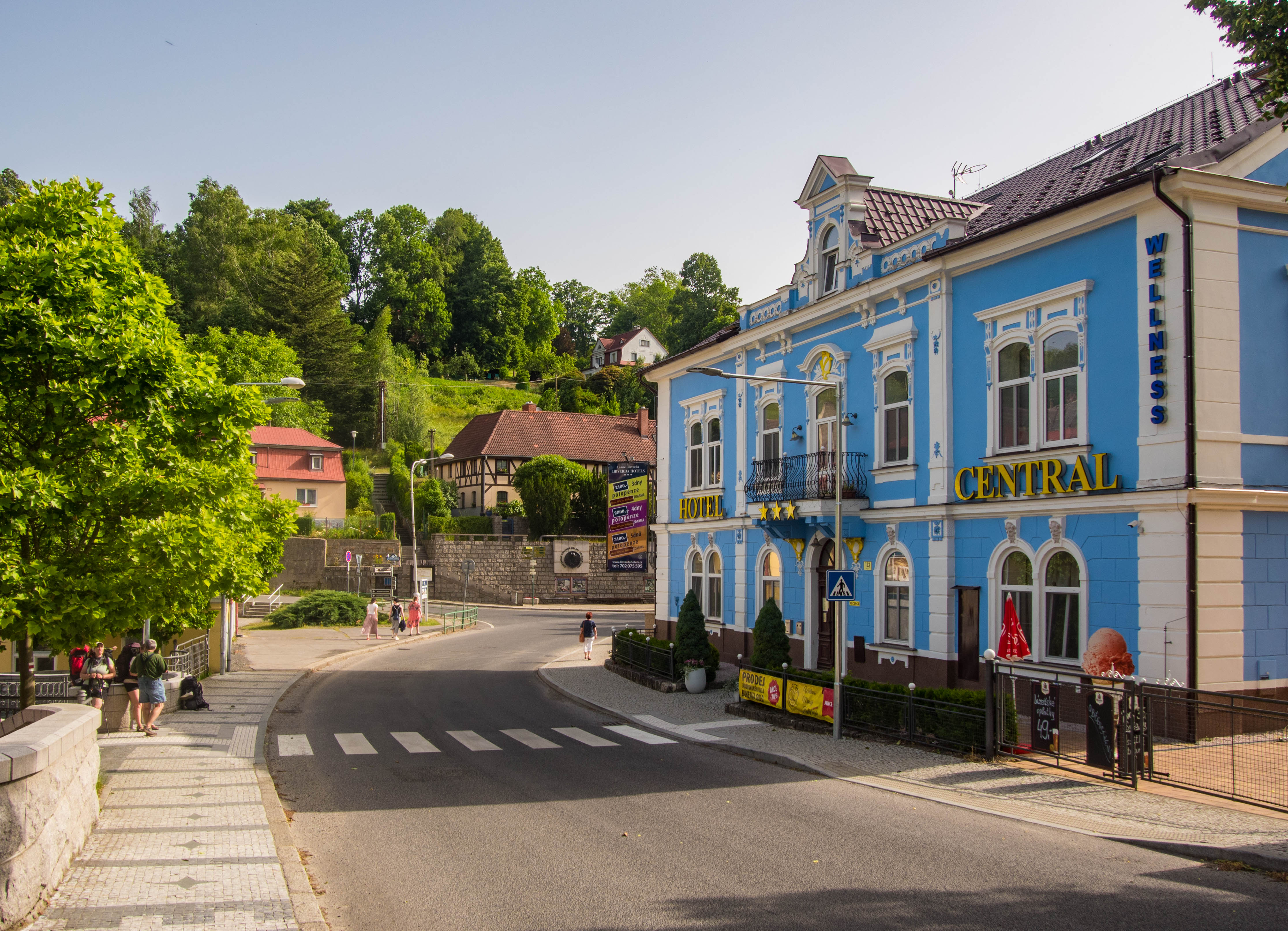 Centrum miejscowości to zarazem serce uzdrowiska. Z jednej strony mamy rzucający się w oczy Hotel Central o krzykliwej dość, niebieskiej elewacji. Z drugiej to wszystko to co stanowi o uroku historycznej, klasycystycznej części Libverdy. Dom zdrojowy, niewielka ale urokliwa kolumnada, sporo kwiatów, fontanna. której częścią jest nie kto inny jak kogut. Ładnie, ale skromnie i kameralnie, zdecydowanie nie są to Karlove Wary czy Mariánské Lázně 😉