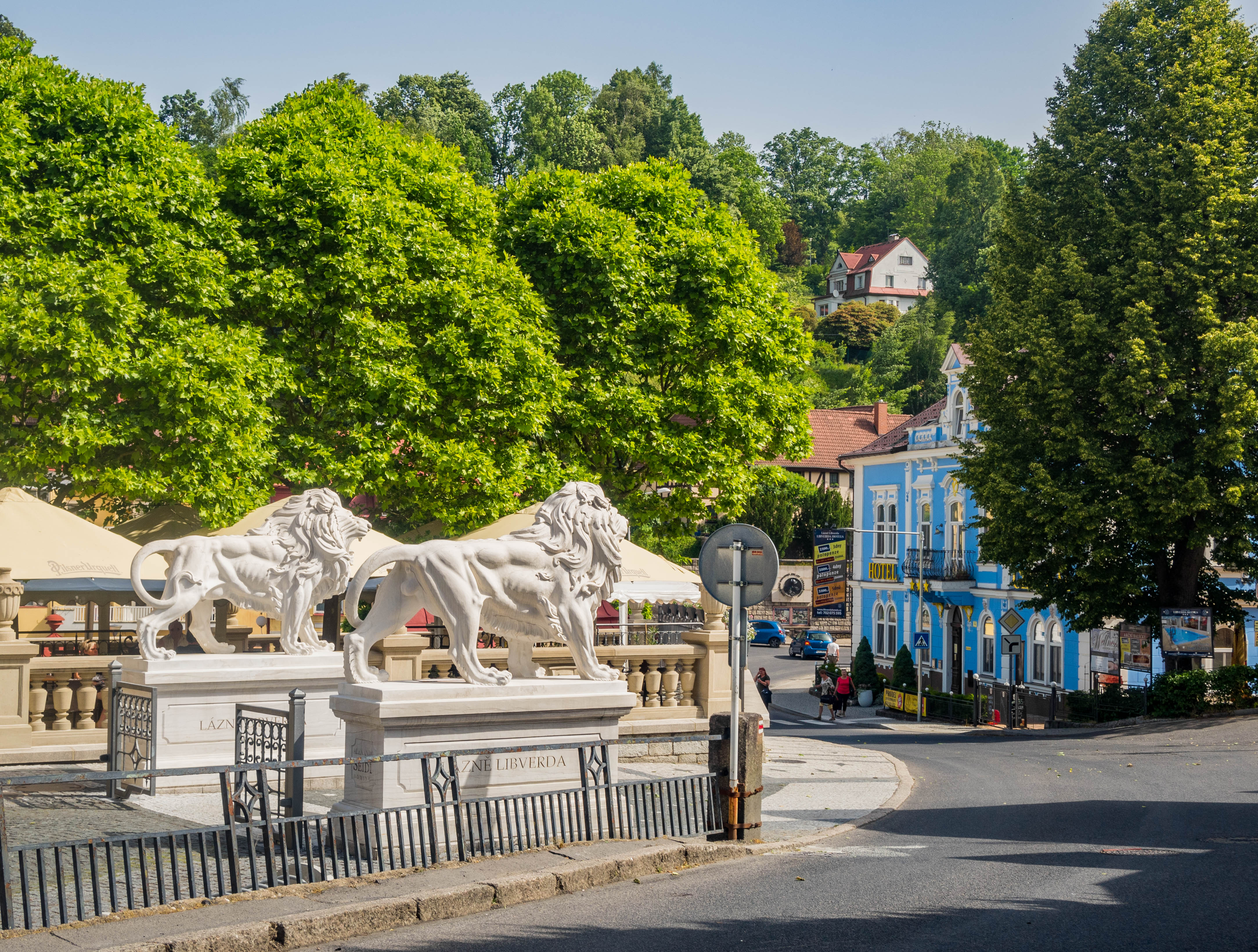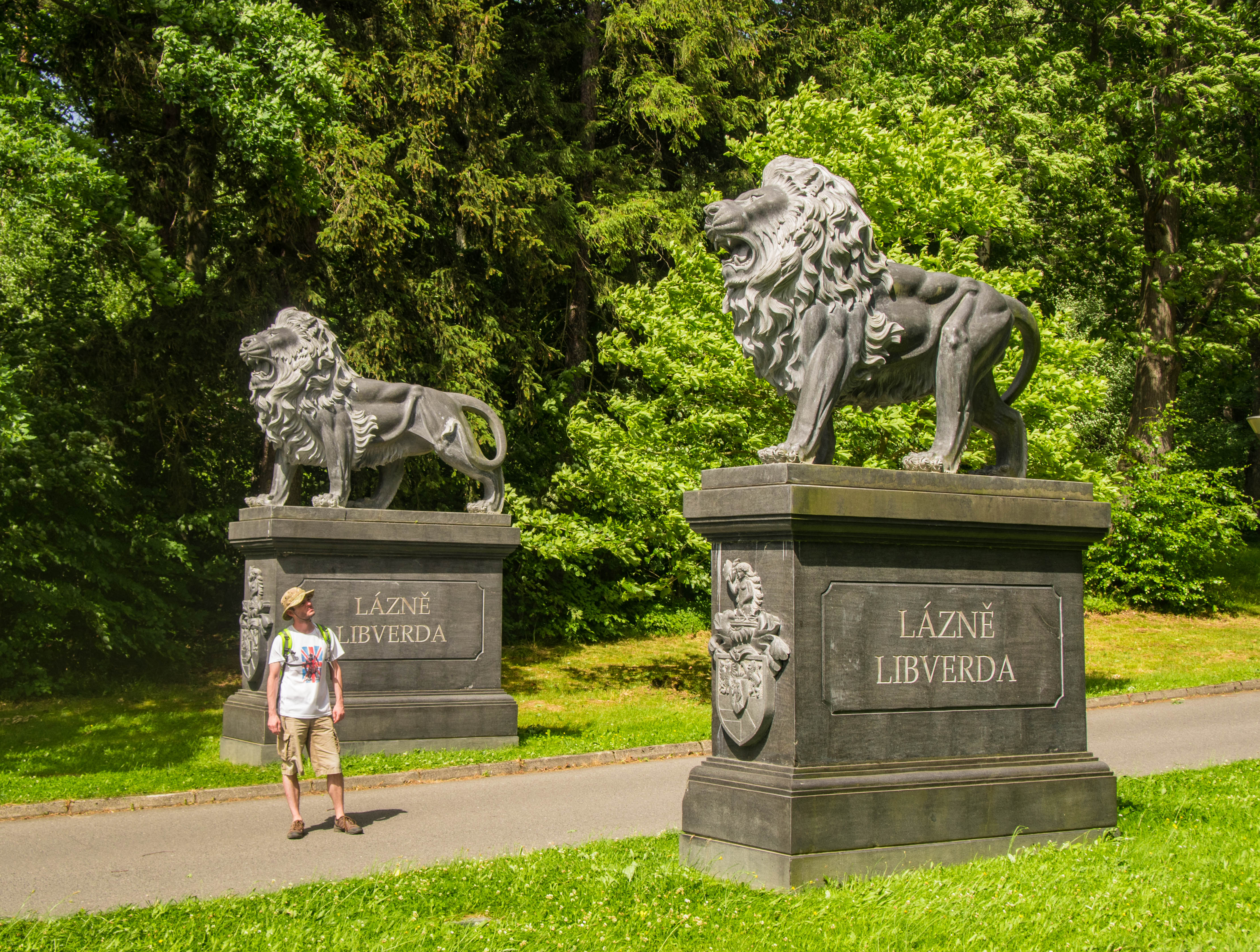 Do uzdrowiska proponuję wejść przez park, którego wejścia strzegą dwa wielgaśne lwy. Stoją sobie one na wysokich cokołach ozdobionych herbami Clam-Gallasów. No majestatyczną, ale i groźną aurę roztaczają. Nie będzie to jedyne z nimi spotkanie.