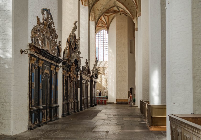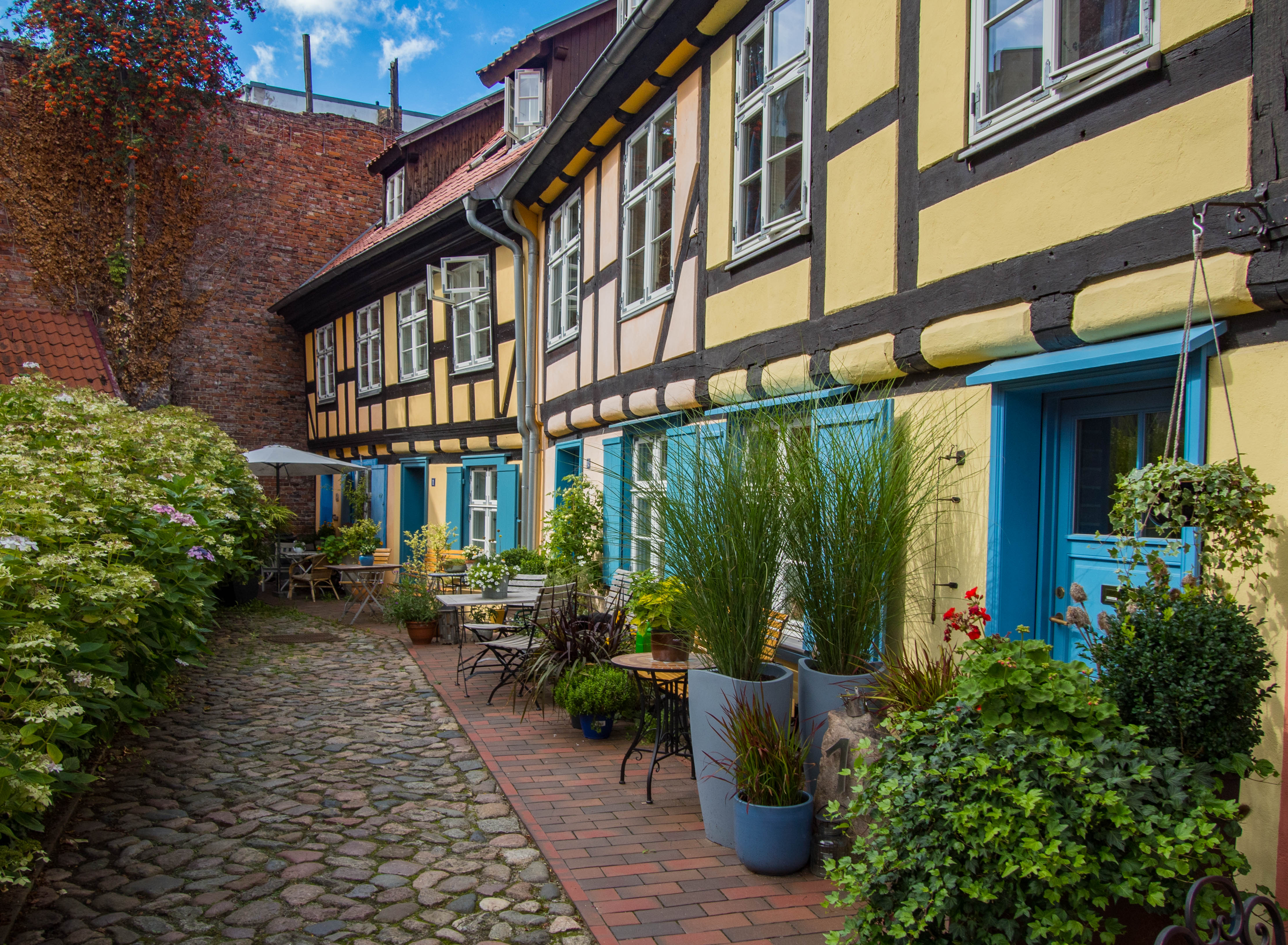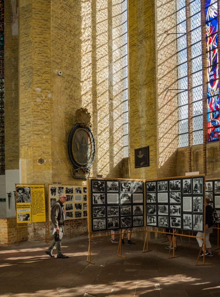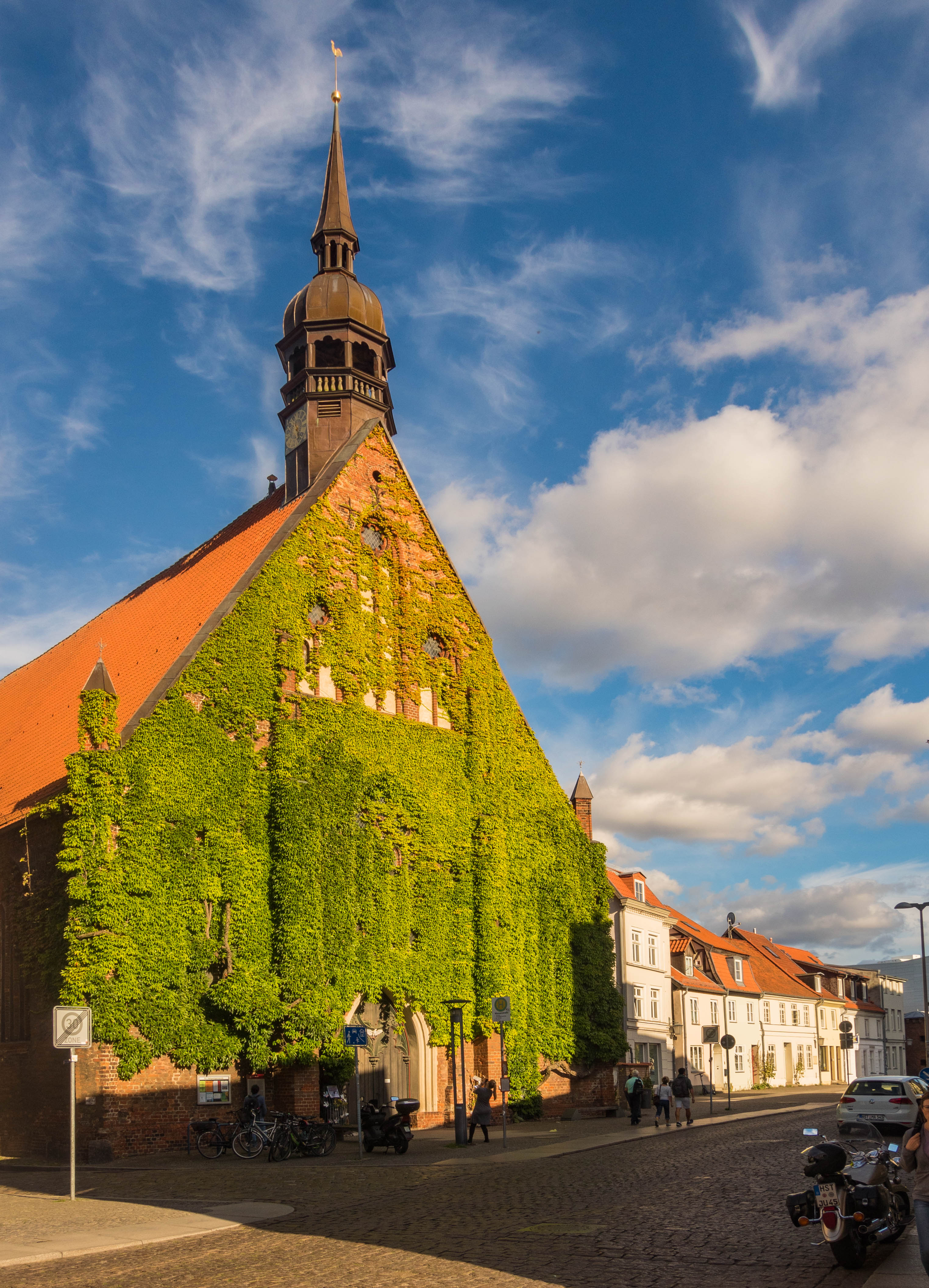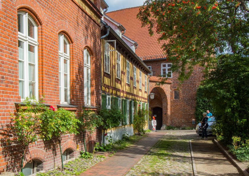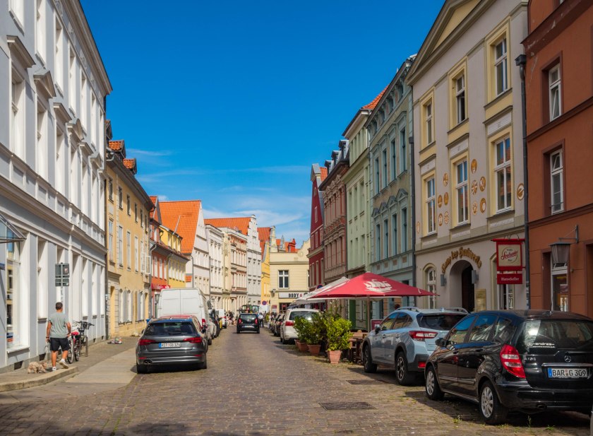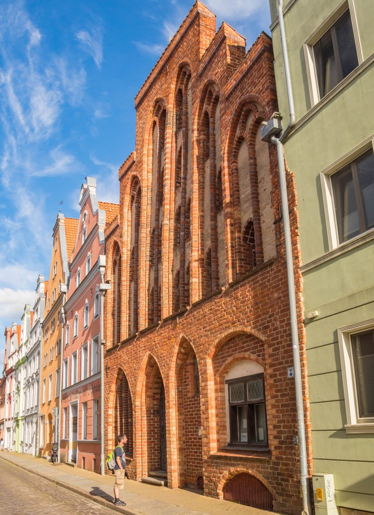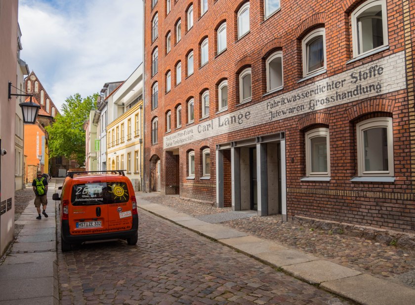 Skręcając w kolejną uliczkę zostawiamy za sobą wysokie kamienice, zmieniając je na towarzystwo zdecydowanie niższych budynków trafiając w jedno z najbardziej urokliwych miejsc w mieście. Placyk i uliczka Am Johaniskloster pełna jest kolorowych, niewysokich domków okraszonych szkieletową konstrukcją z murem pruskim, pięknie okwieconych, stanowiąc oazę ciszy i spokoju. W jednym z domków, mających już na karku przeszło 200 lat można zresztą nocować, i powiem wam, że kusząca to wizja. Z kolei w kolejnym budynku, dla odmiany ceglanym znajduje się biblioteka, będąca częścią miejskiego archiwum. Cóż w niej ciekawego? Zbiór około dwóch tysięcy tomów, które miastu przekazał XVIII-wieczny gubernator Pomorza, Axel Graf von Lowen. Wybitnie cenna to kolekcja.