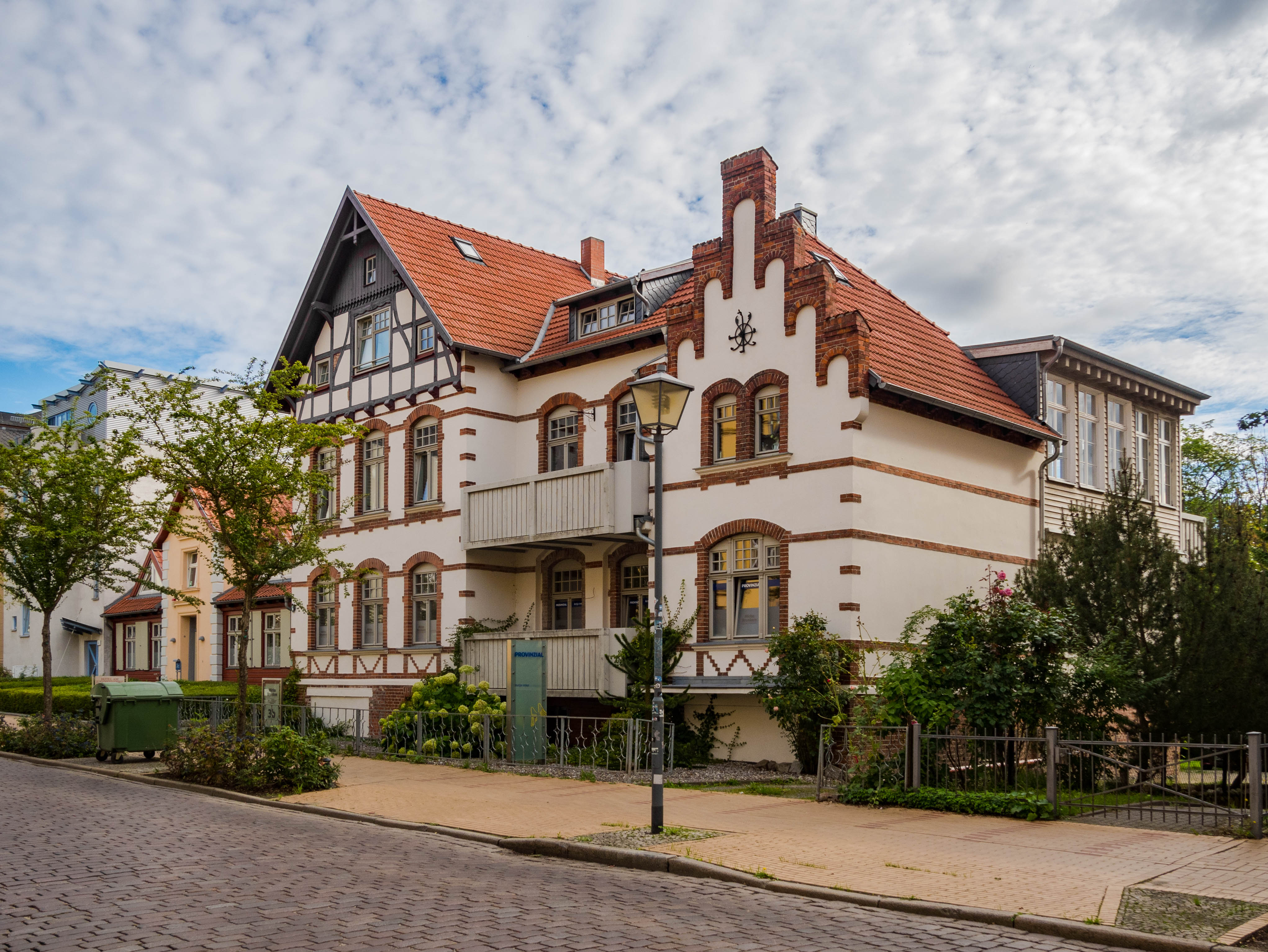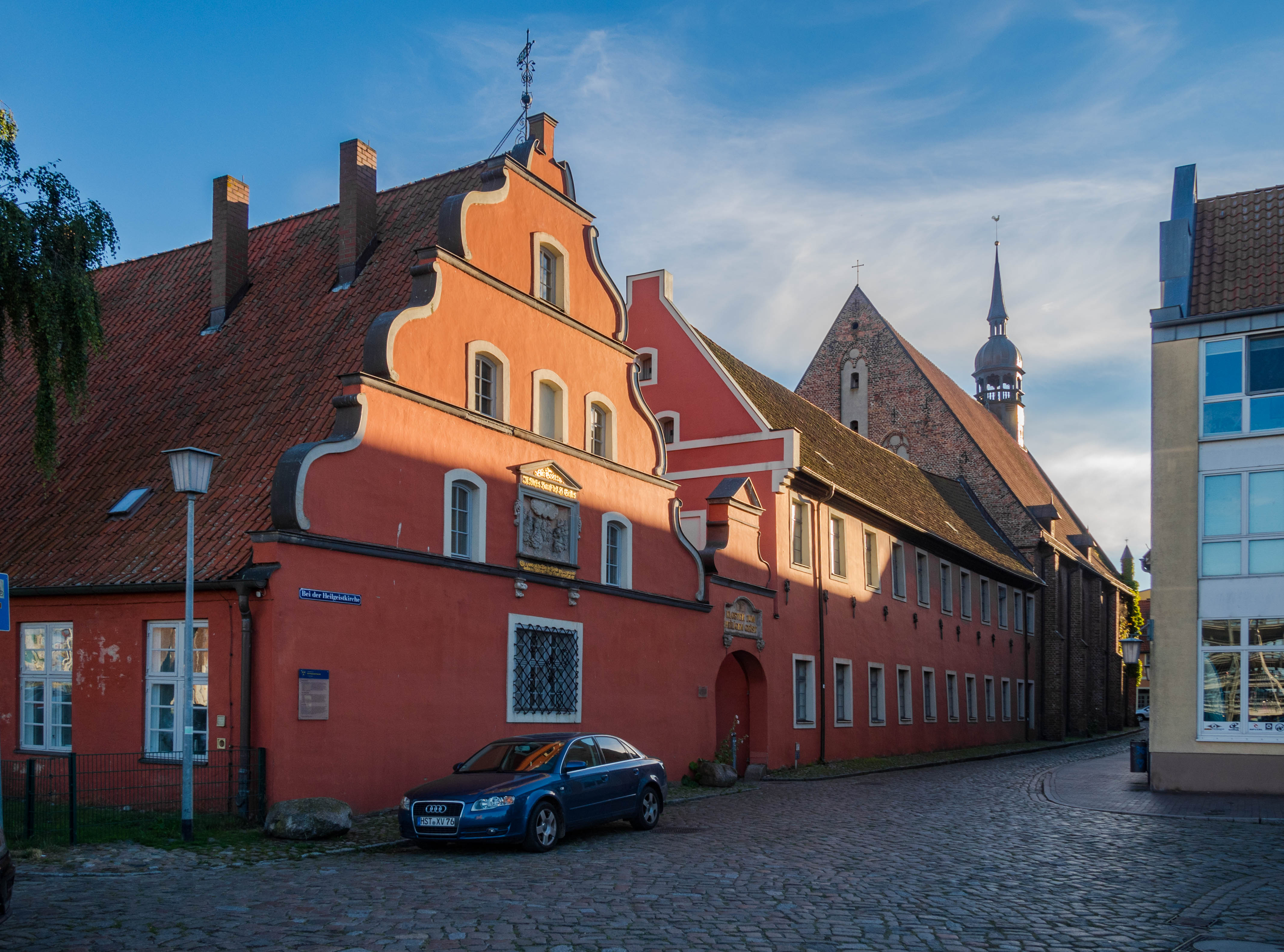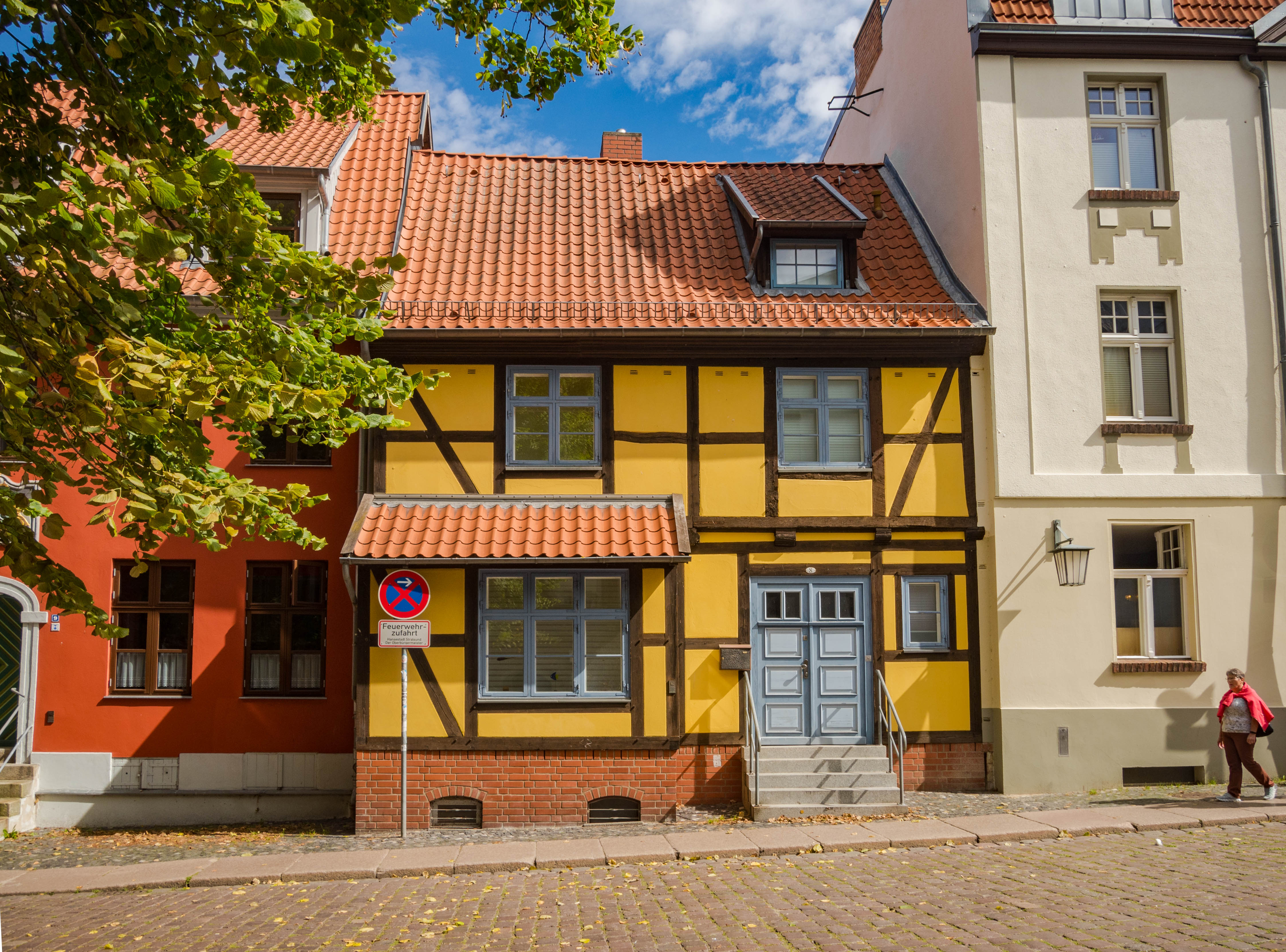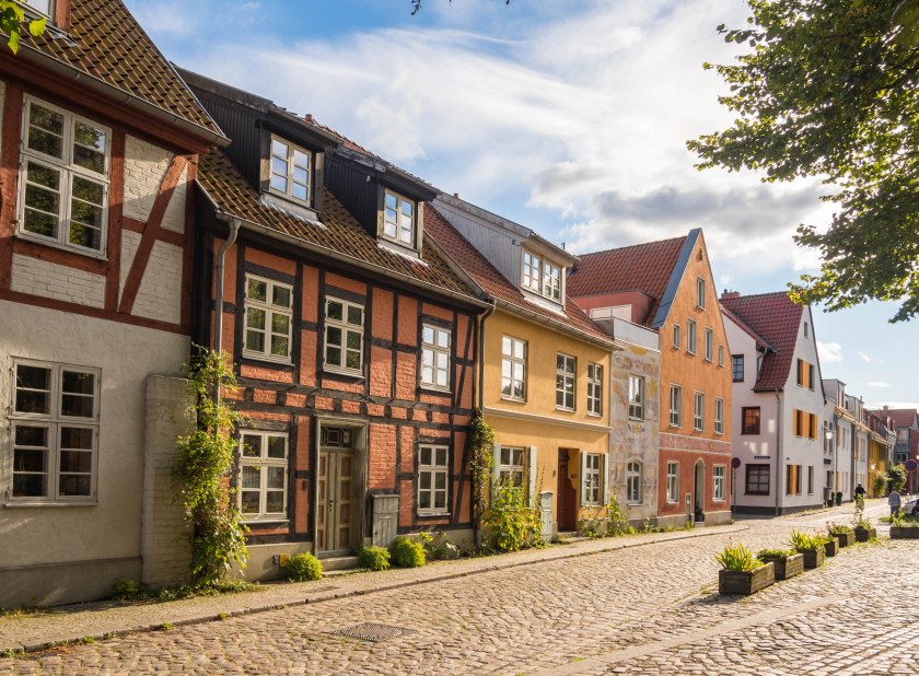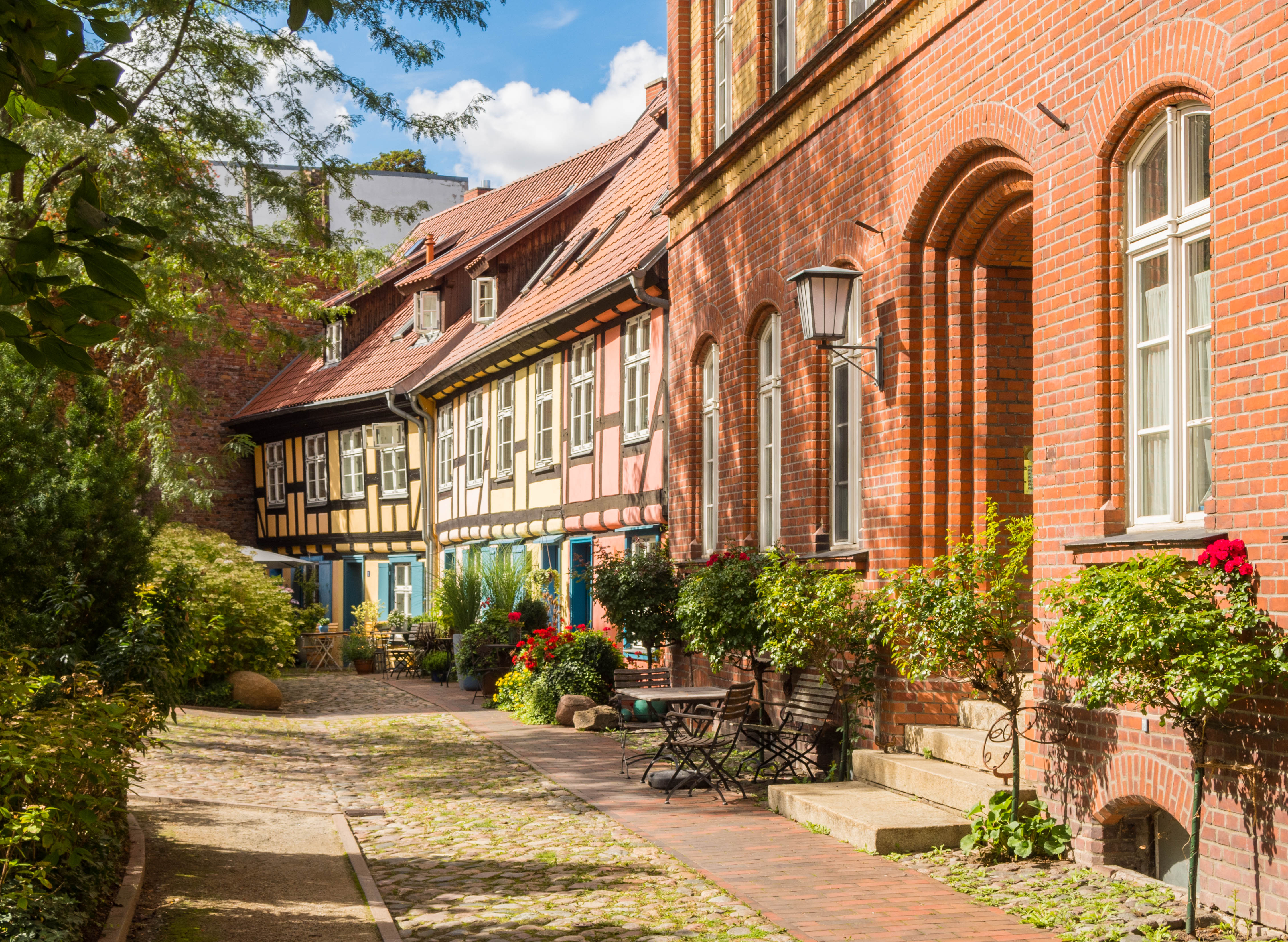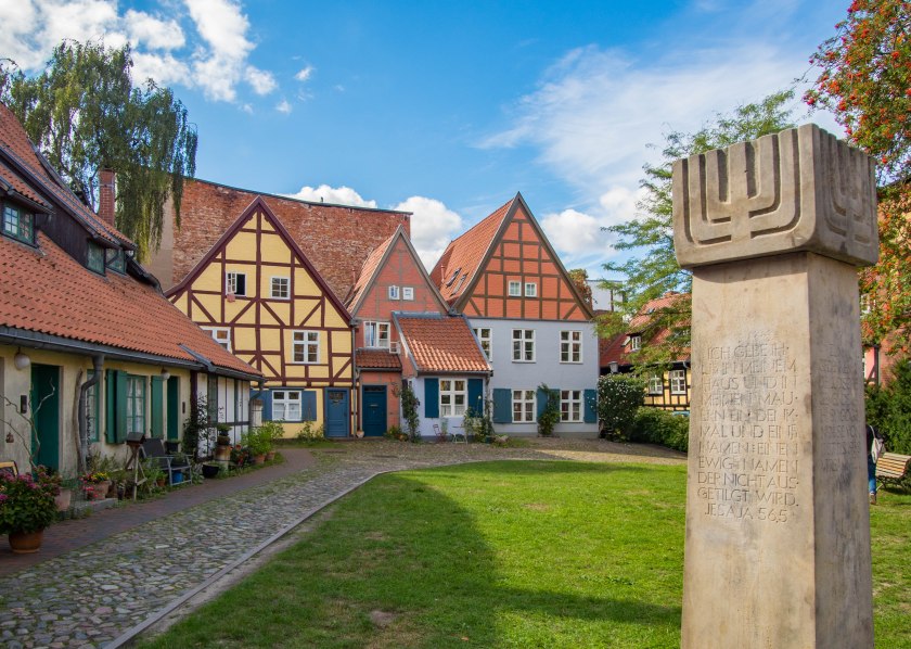 Skręcając w kolejną uliczkę zostawiamy za sobą wysokie kamienice, zmieniając je na towarzystwo zdecydowanie niższych budynków trafiając w jedno z najbardziej urokliwych miejsc w mieście. Placyk i uliczka Am Johaniskloster pełna jest kolorowych, niewysokich domków okraszonych szkieletową konstrukcją z murem pruskim, pięknie okwieconych, stanowiąc oazę ciszy i spokoju. W jednym z domków, mających już na karku przeszło 200 lat można zresztą nocować, i powiem wam, że kusząca to wizja. Z kolei w kolejnym budynku, dla odmiany ceglanym znajduje się biblioteka, będąca częścią miejskiego archiwum. Cóż w niej ciekawego? Zbiór około dwóch tysięcy tomów, które miastu przekazał XVIII-wieczny gubernator Pomorza, Axel Graf von Lowen. Wybitnie cenna to kolekcja.