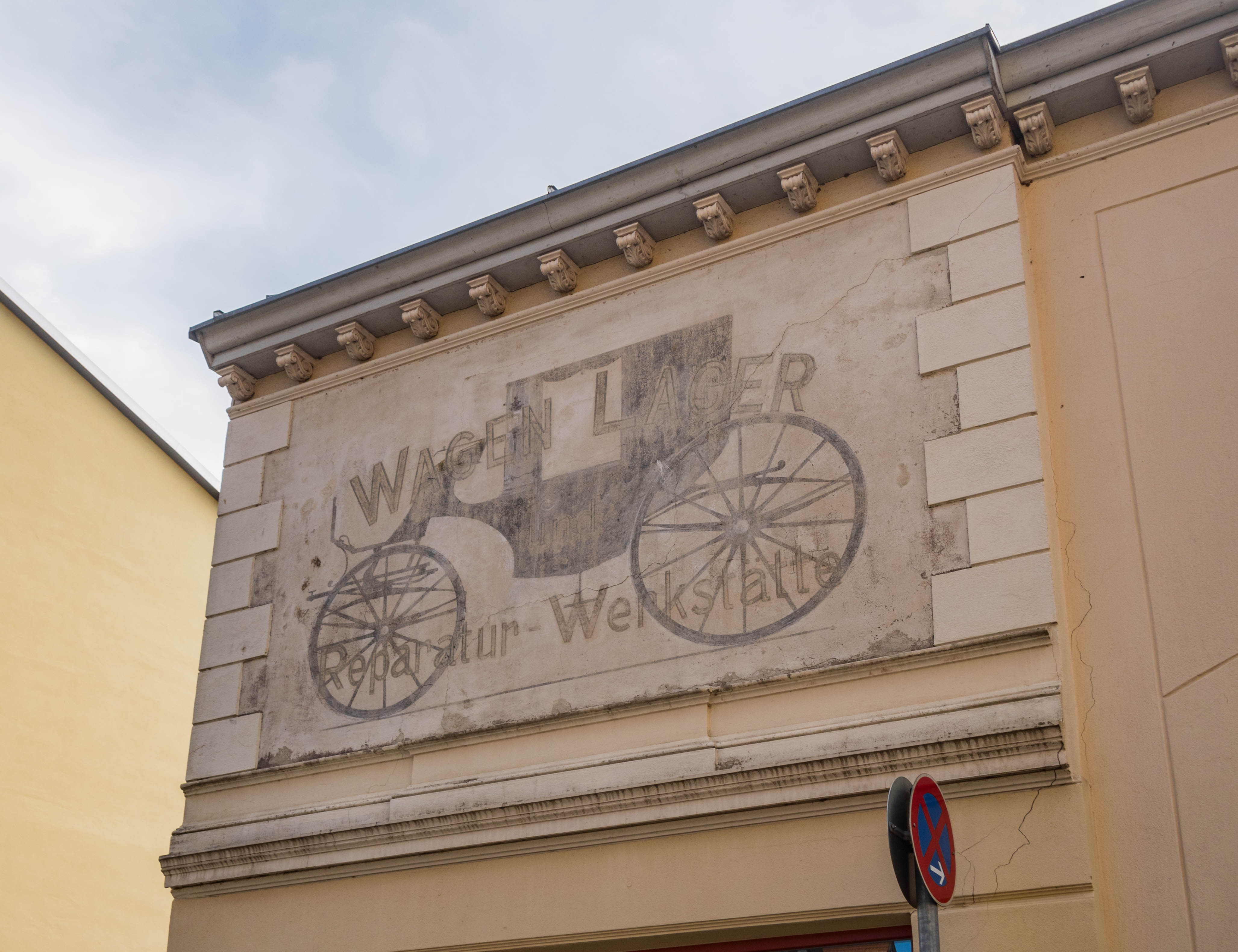 Na wielu budynkach zachowały się dawne napisy, ślady po przeszłości. Niektóre dość mocno już zatarte, inne specjalnie odrestaurowane by przypominać o wcześniejszych właścicielach.