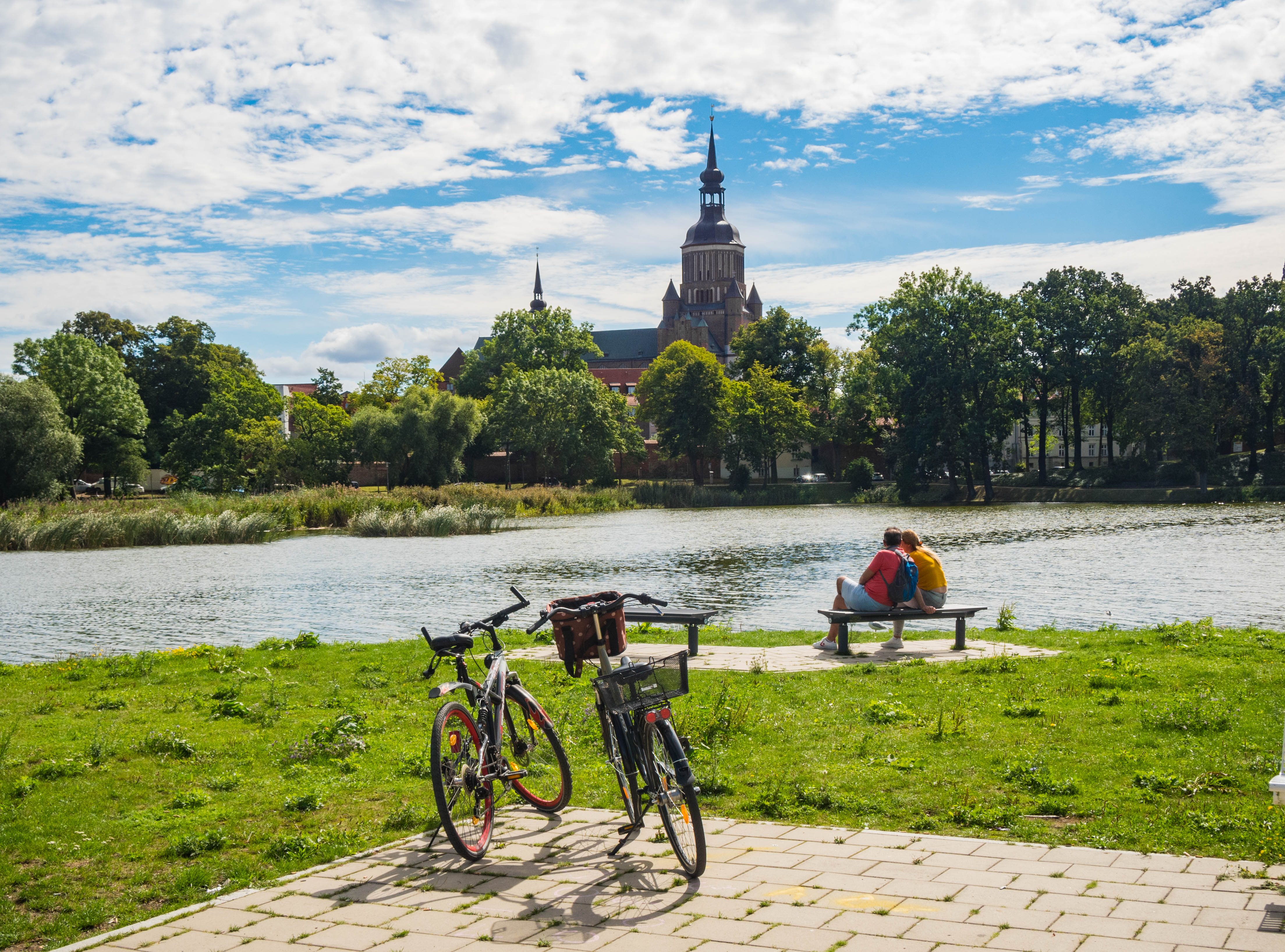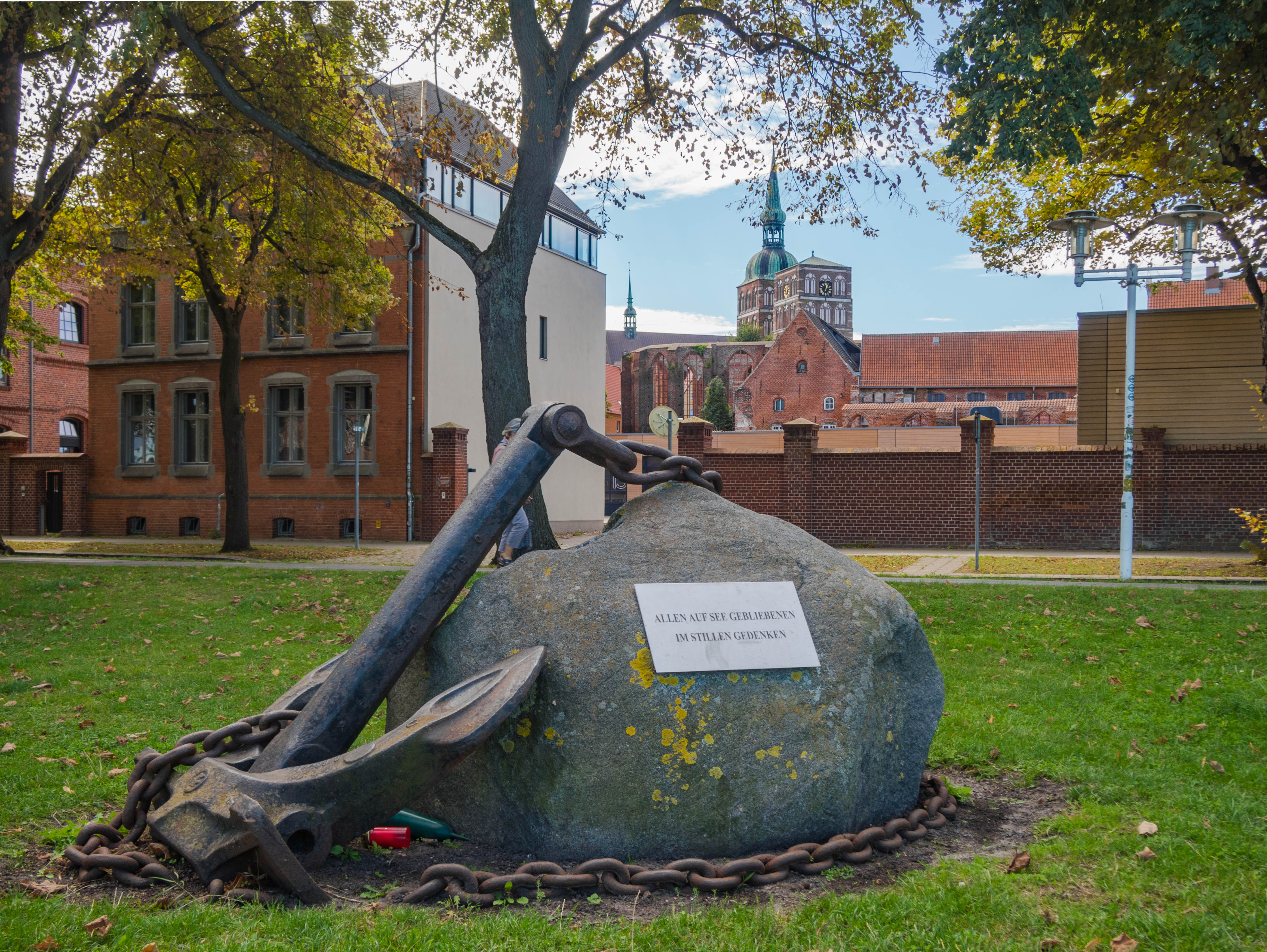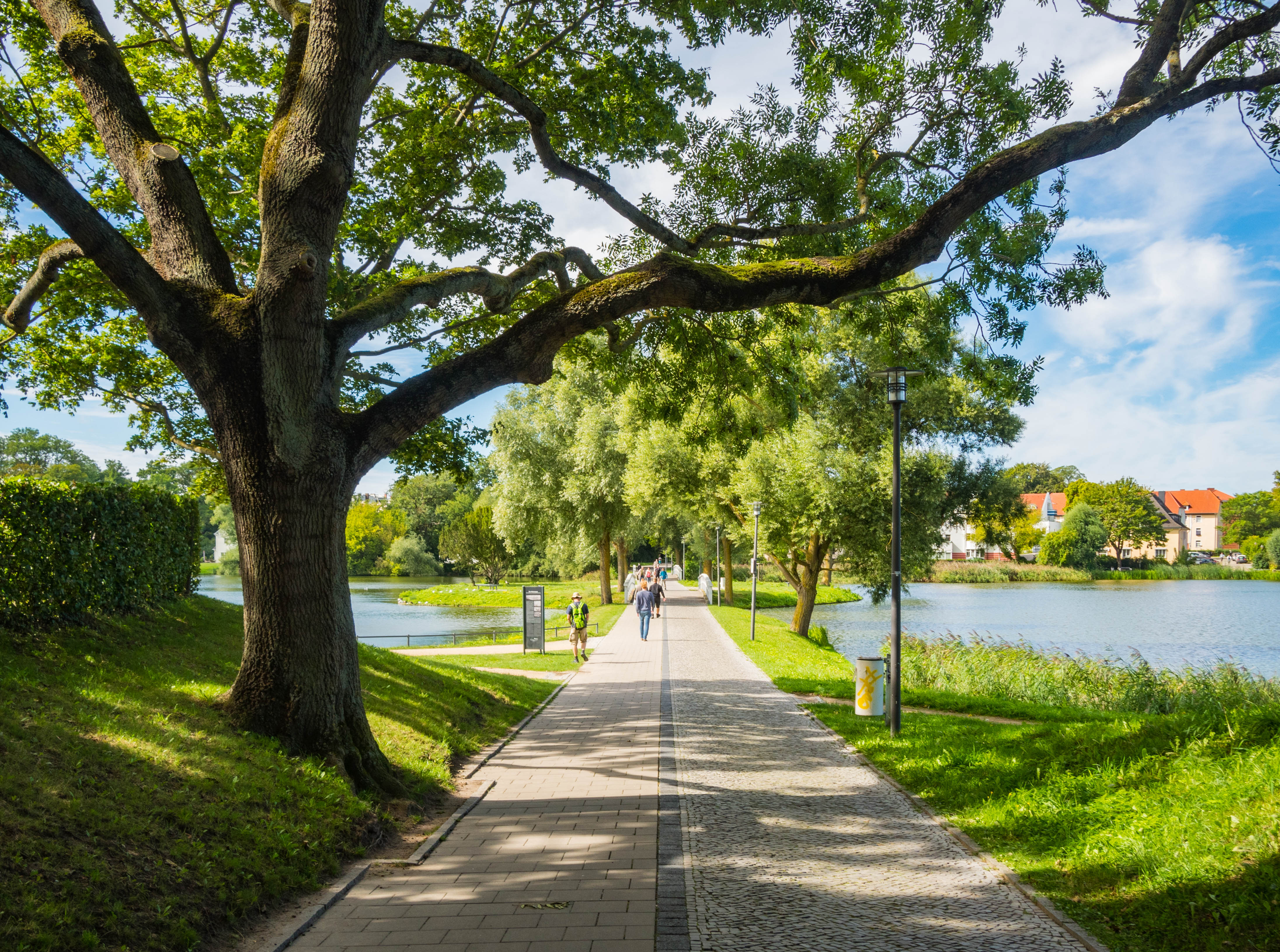 Starówka otoczona jest trzema stawami i rzecz jasna od strony Bałtyku wąską cieśniną Strelasund. Frankenteich, Grossen Frankenteich oraz Knieperteich tworzą bardzo fajne zielone sąsiedztwo. Pośrodku tego ostatniego znajduje się niewielka wysepka połączona z brzegami białymi pomostami (zwanymi… badum tss Białymi). Polecam spacer w to miejsce bo primo jest ono całkiem urokliwe a po drugie primo można stamtąd upolować całkiem fajne kadry miasta.