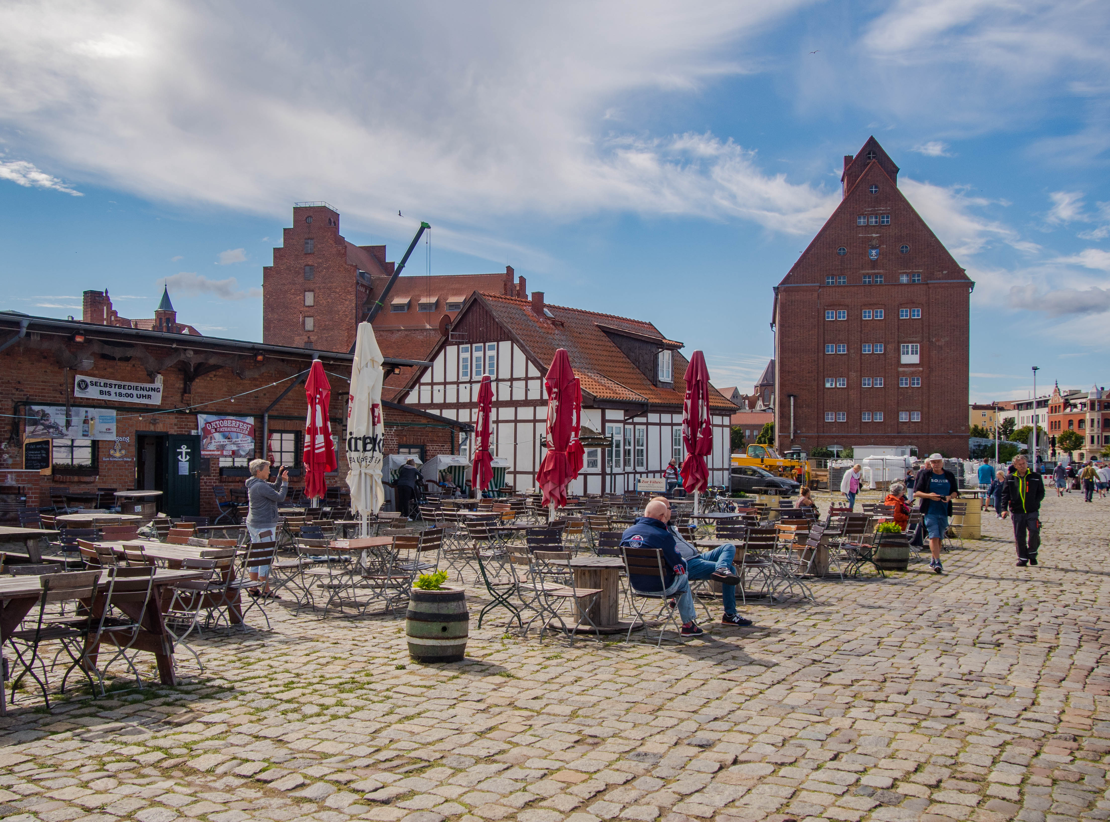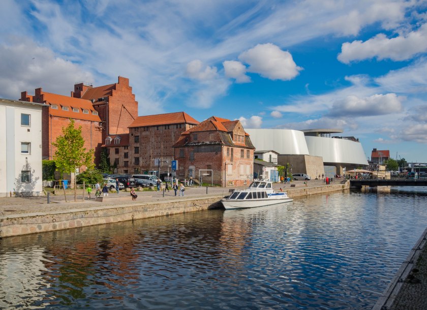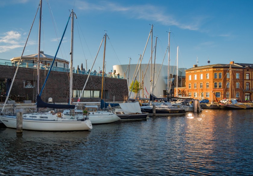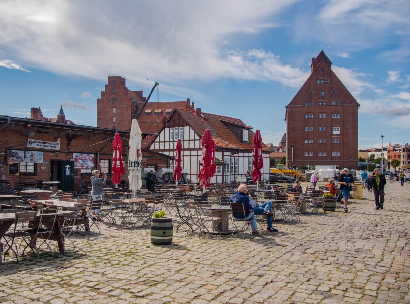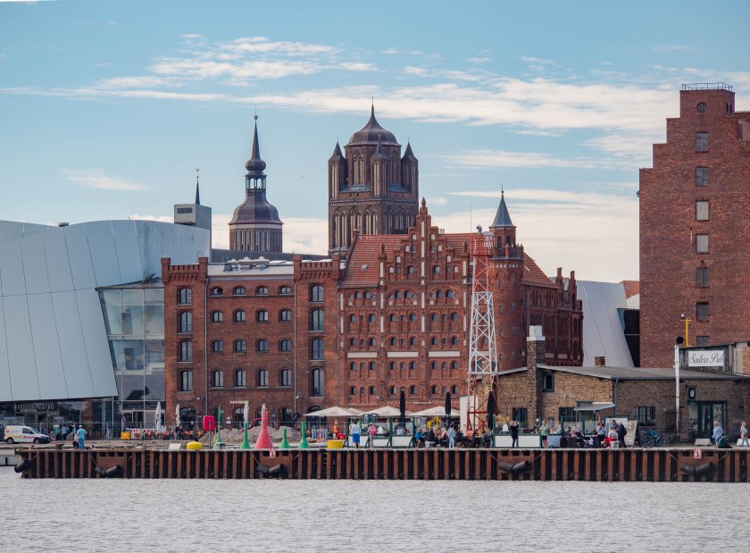 Na wiele knajpek cień rzucają potężne spichlerze, ceglane pochodzące z przełomu XIX i XX wieku, jedne proste inne o wyglądzie bardziej wymyślnym. Dziś mieszczą się tam restauracje czy galerie sztuki. Bądź też… nic. Tak też niestety może być. Pomiędzy dawnymi magazynami miejsce dla siebie odnalazło Ozeaneum. Sądząc po opinii wielu znajomych jest to za wszech miar interesujące Oceanarium, które w dużej mierze skupia się na Bałtyku i Morzu Północnym. Kusiło wejść, ale ostrzegano nas, że jak się wejdzie to szybko się nie wyjdzie. Taka to kradnąca czas atrakcja i tym razem opuściliśmy skupiając się na Starówce 😉 Zainteresowanych odsyłam na stronę tegoż.