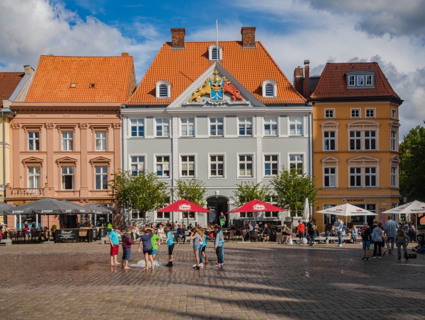 Co zatem mamy? Dom Komendanta, barokowy, ładny, schludny. Poznacie go po niecodziennych barwach umieszczonego nań herbu miasta – jest tam tak pomorski gryf jak i szwedzki lew z niebieskim tłem w tarczy nawiązujący do czasów obecności tych ostatnich w mieście, wszak budynek wtedy powstał i do szwedzkiego komendanta właśnie należał. Po jego bokach kupieckie kamienice, a na parterach wszystkich trzech znajdziecie dziś restauracje i kawiarenki.
