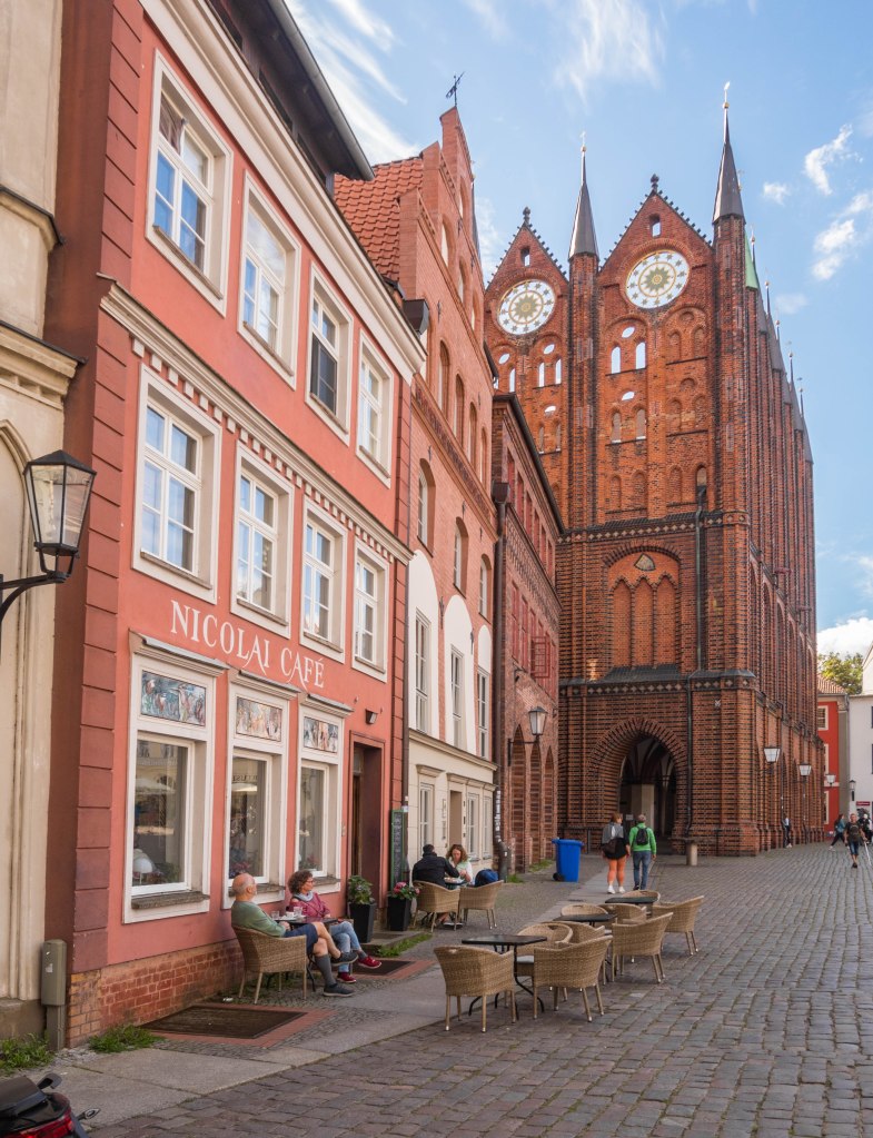 Stralsundzki rynek to taki trochę sklep ze słodyczami. Ok, jest łyżka dziegciu w postaci brukozy, która jakkolwiek jest kontynuacją wielowiekowego stanu rzeczy. I jakoś jestem w stanie to przeżyć. Tym bardziej, że w „okresie gorącym” można się schować w jednym z WIELU ogródków piwnych/kawowych. A i ratusz z kościołem przez długą część dnia dają sporo cienia.