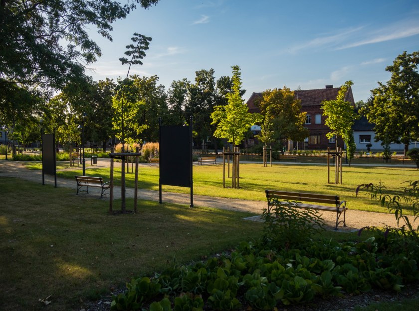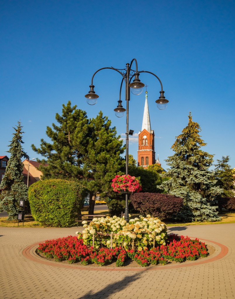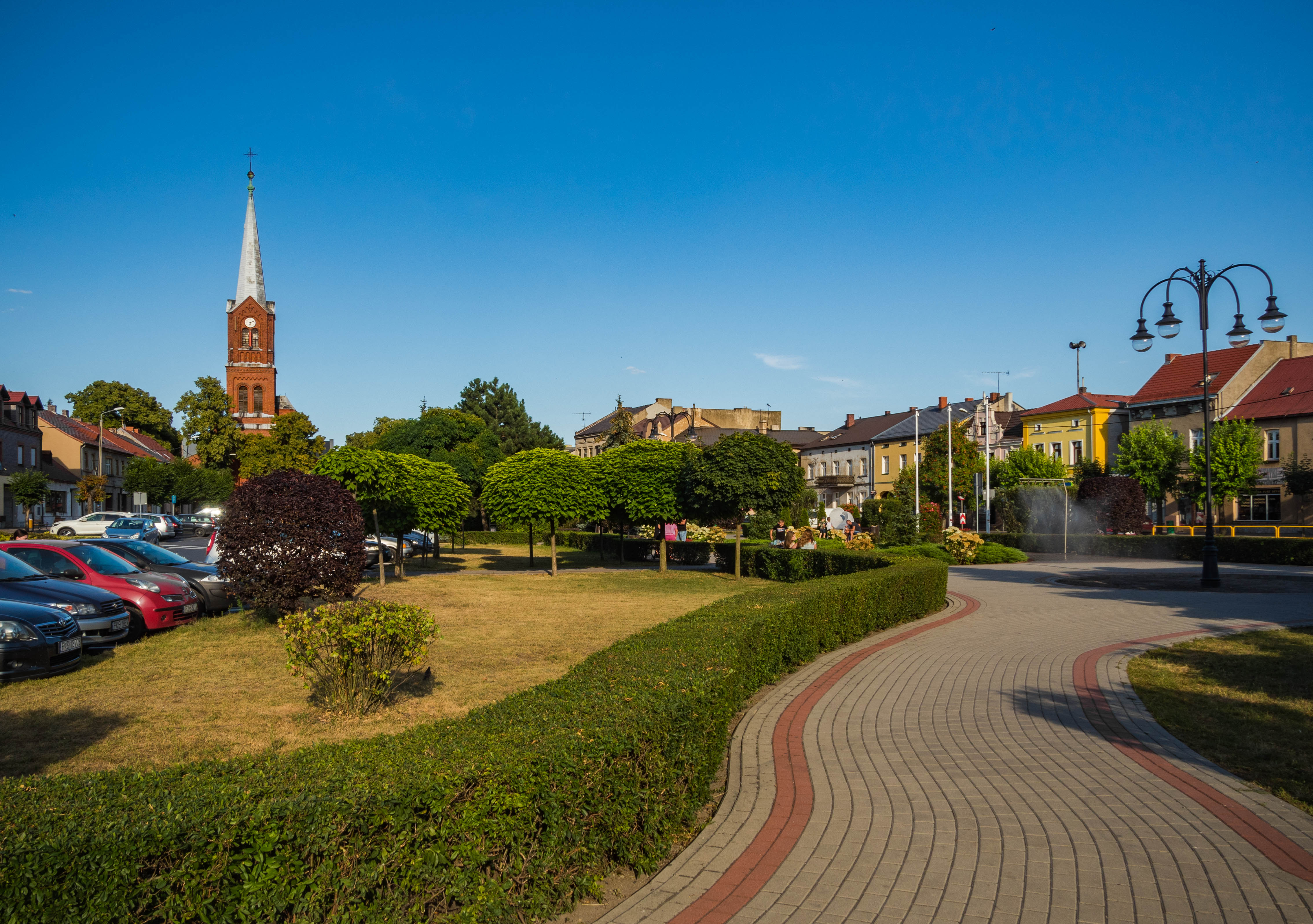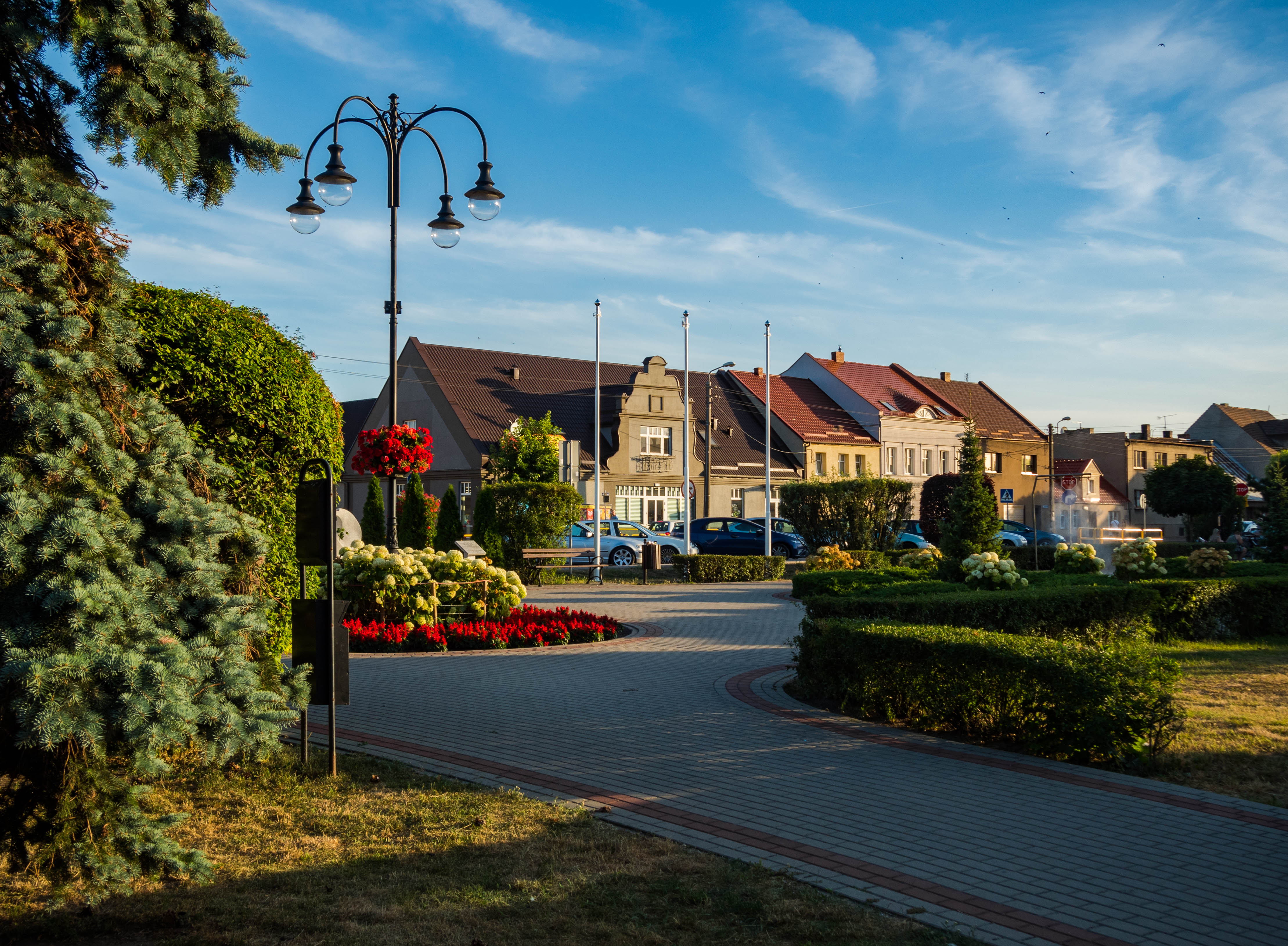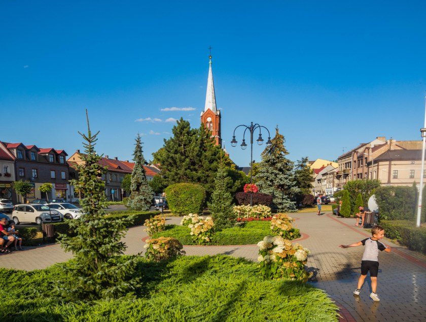 Po chwili spaceru jest i on. Rynek. I od razu muszę wam przyznać, że Czempiń bezczelnie dołącza do tych kilku wielkopolskich miast, które mocno mnie w tym roku zawiodły. No bo jak to może być, że w dobie postępującej krajowej betonozy główny plac miasta wciąż posiada niemałą oazę zieleni? Trawa, kwiaty a na do dodatek – co już jest w ogóle horrendum strasznym – są tam i drzewa, i to niemałe. Kto to widział, no naprawdę tak nie wypada.