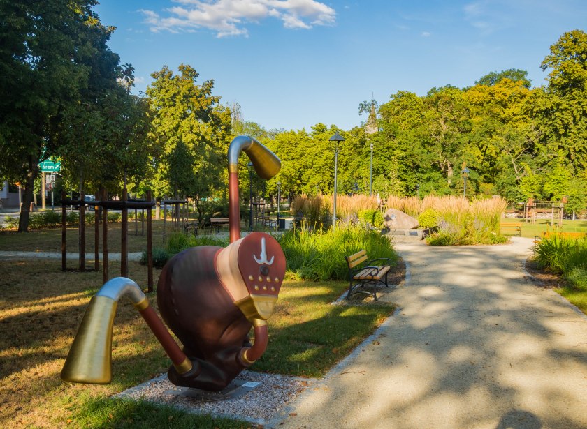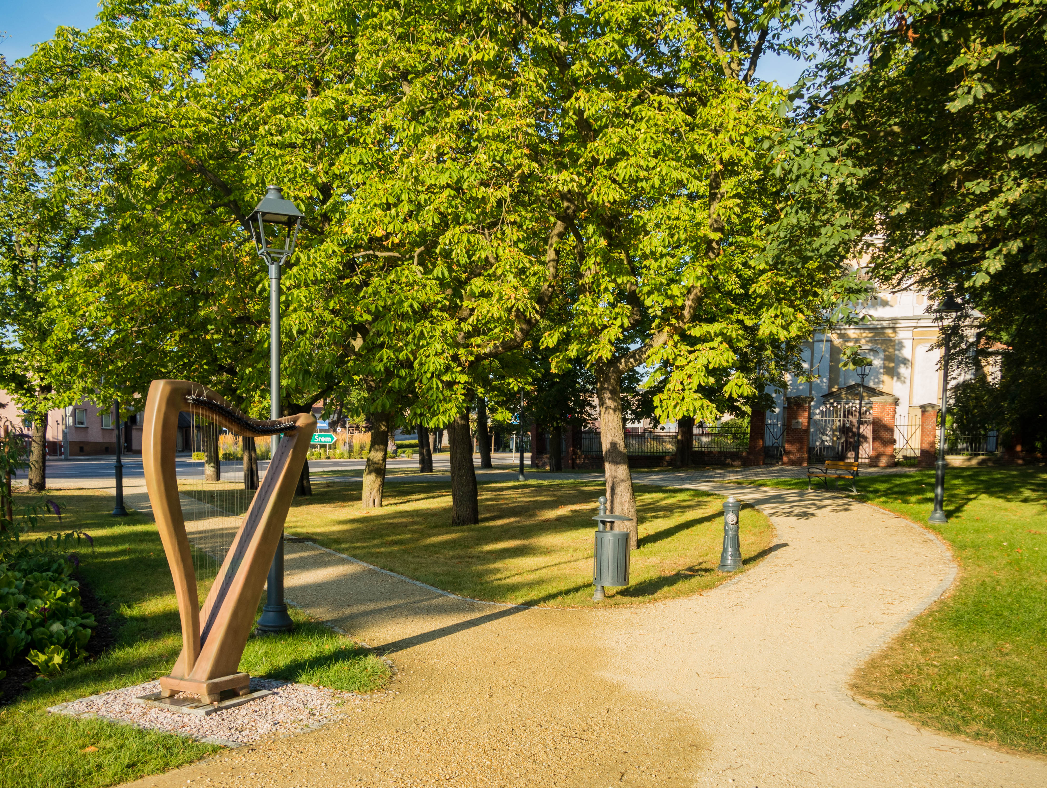 Miłą ciekawostką są rzeźby dud oraz harfy, jednoznacznie kojarzące się z muzycznymi tradycjami okolicy. A te sięgają nawet XVII wieku. Co ciekawe harfę znajdziecie dziś w nazwie jednego z zespołów… choć co może stanowić pewien twist to zespół, a raczej Towarzystwo Śpiewacze. Dudy z kolei od lat z miastem są związane. Od dziesięcioleci Czempiń stanowi jedno z centrów Wielkopolskiej kultury dudziarskiej, stojąc za „zarażaniem” kolejnych pokoleń a raz do roku (zazwyczaj we wrześniu) w mieście oraz Starym Gołębinie i Kościanie dobywa się turniej, w którym udział biorą dudziarze z całej Wielkopolski.