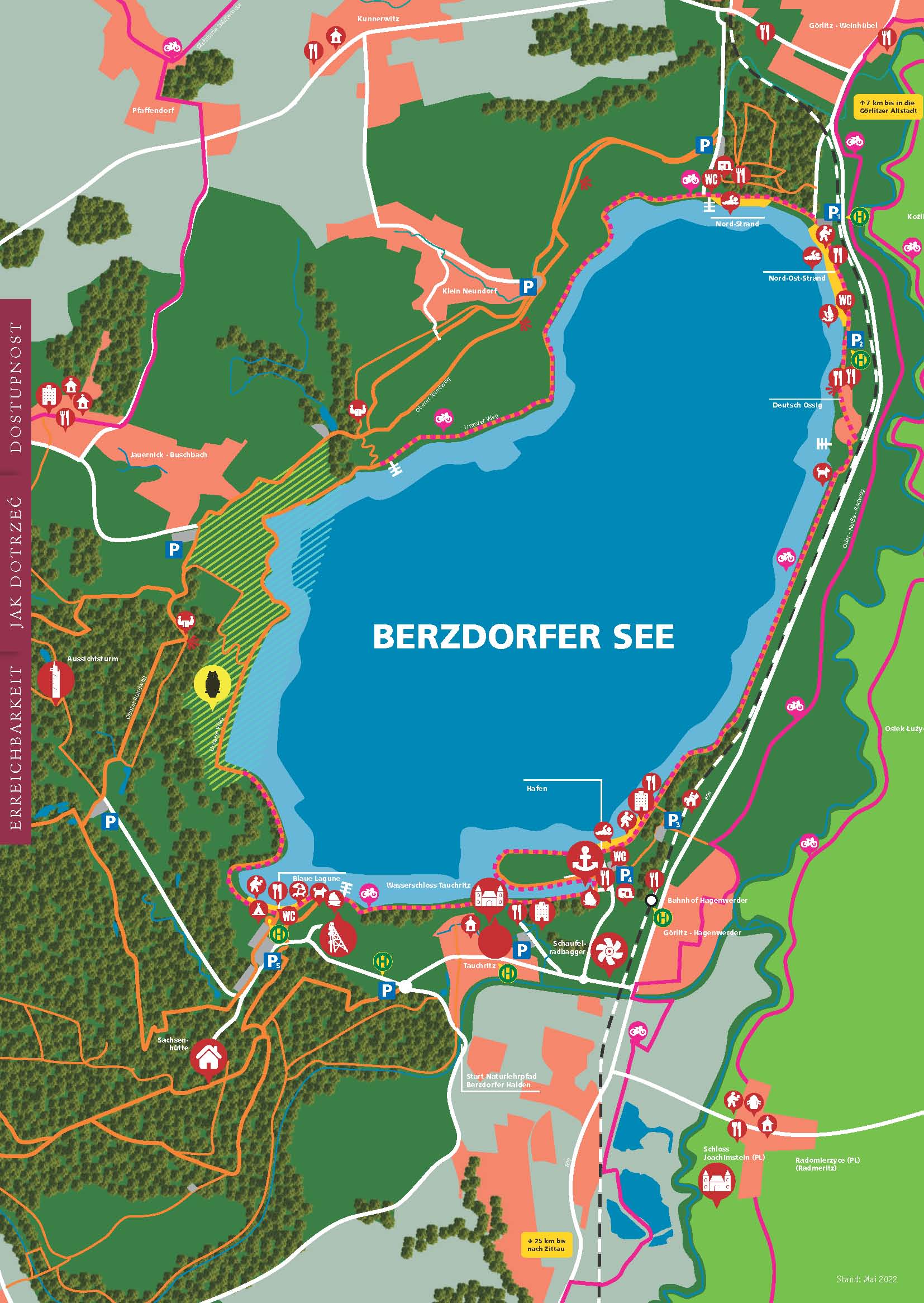 Nad jezioro bez problemu dojedziecie samochodem, tak od północy z Görlitz, zachodu z Raichenbach czy ze wschodu z Radomierzyc. Parkingi znajdziecie w wielu miejscach (rzućcie okiem na mapę, tę następną) więc z planowaniem i własnym dojazdem nie powinniście mieć problemu. Tak samo zresztą jak z dojazdem komunikacją miejską. Kursujący co godzinę pociąg linii Görlitz-Zittau zatrzymuje się w Hagenwerder tuż przy południowym krańcu akwenu.