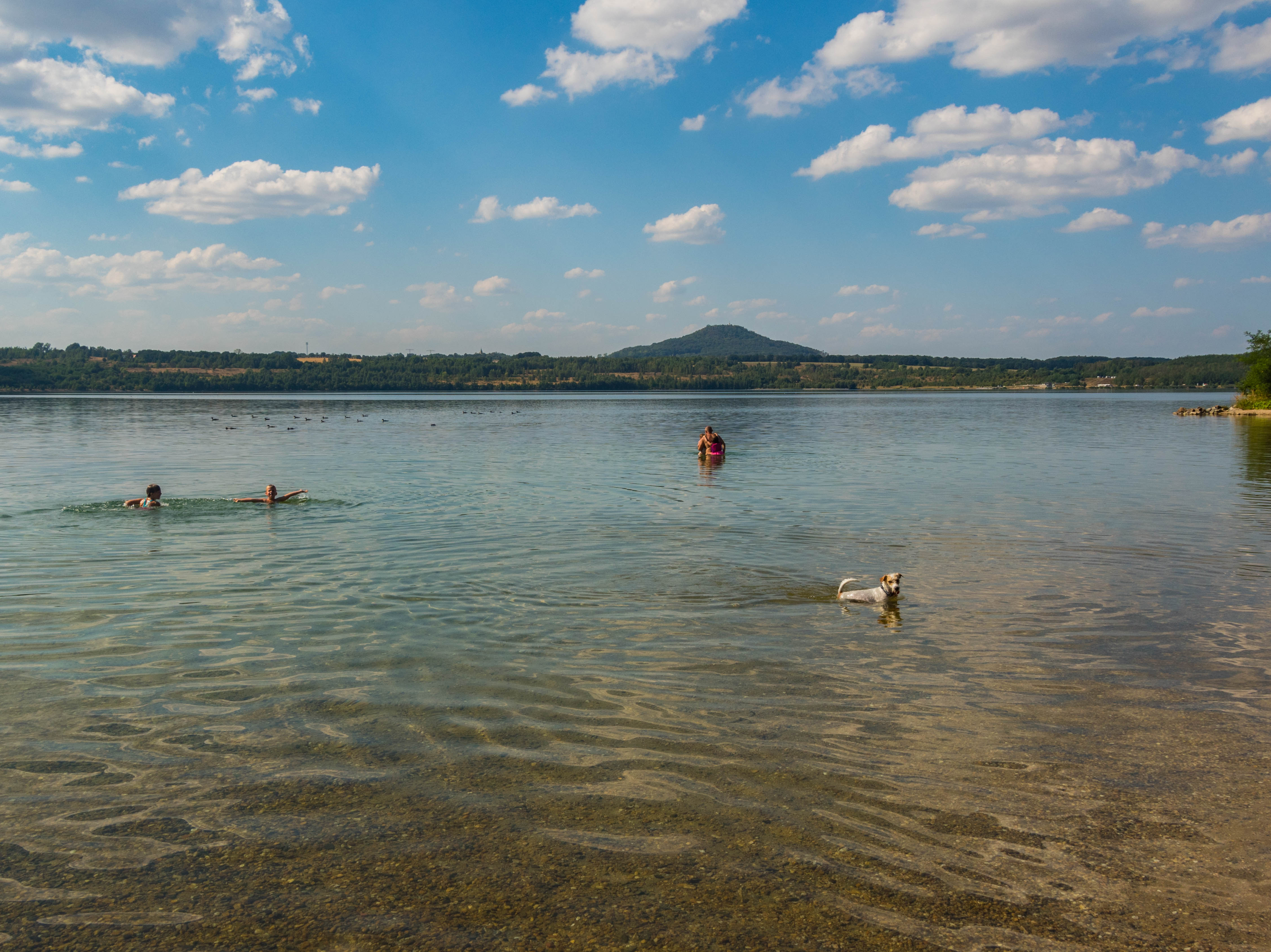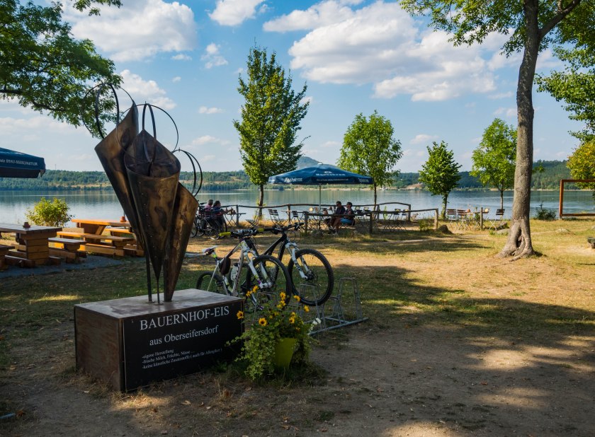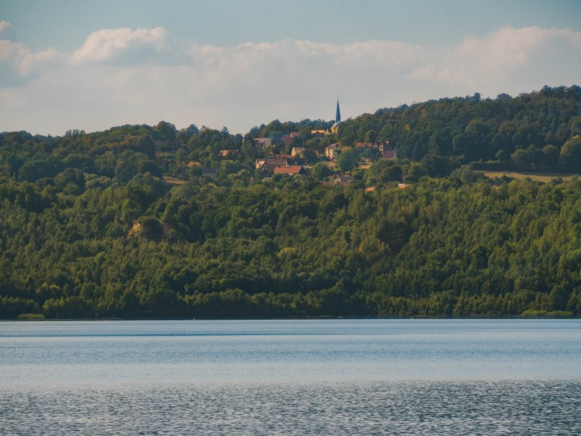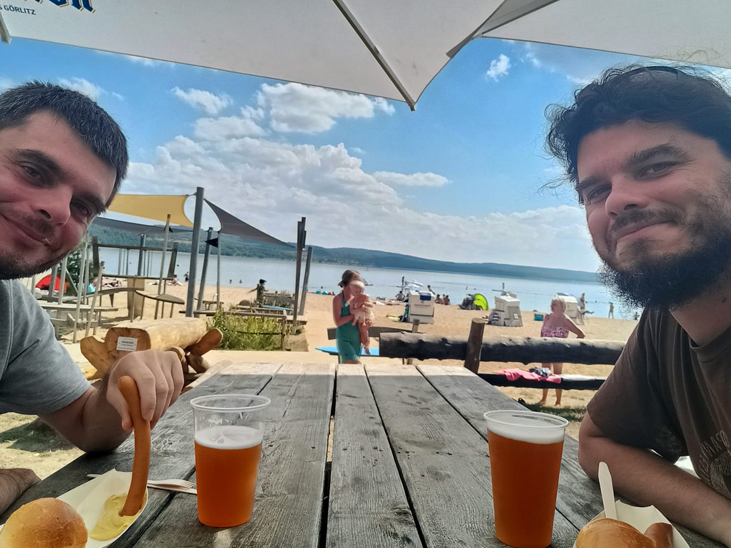 Na miejscu znajdziecie plac zabaw, małe gastro gdzie kupicie lody, miejscowe piwko czy też brat/bockwurtsy (koniecznie z musztardą). My, uzbrojeni w buły z kiełbasą decydujemy się podziwiać okoliczne krajobrazy – najbardziej znany wulkan w okolicy z początku nieśmiało chowa się za horyzontem, z kolei bez większych problemów widać na odległym brzegu wieżę widokową Neuberzdorfer Höhe. W ogóle widoczki podczas całego spaceru: prima sort.