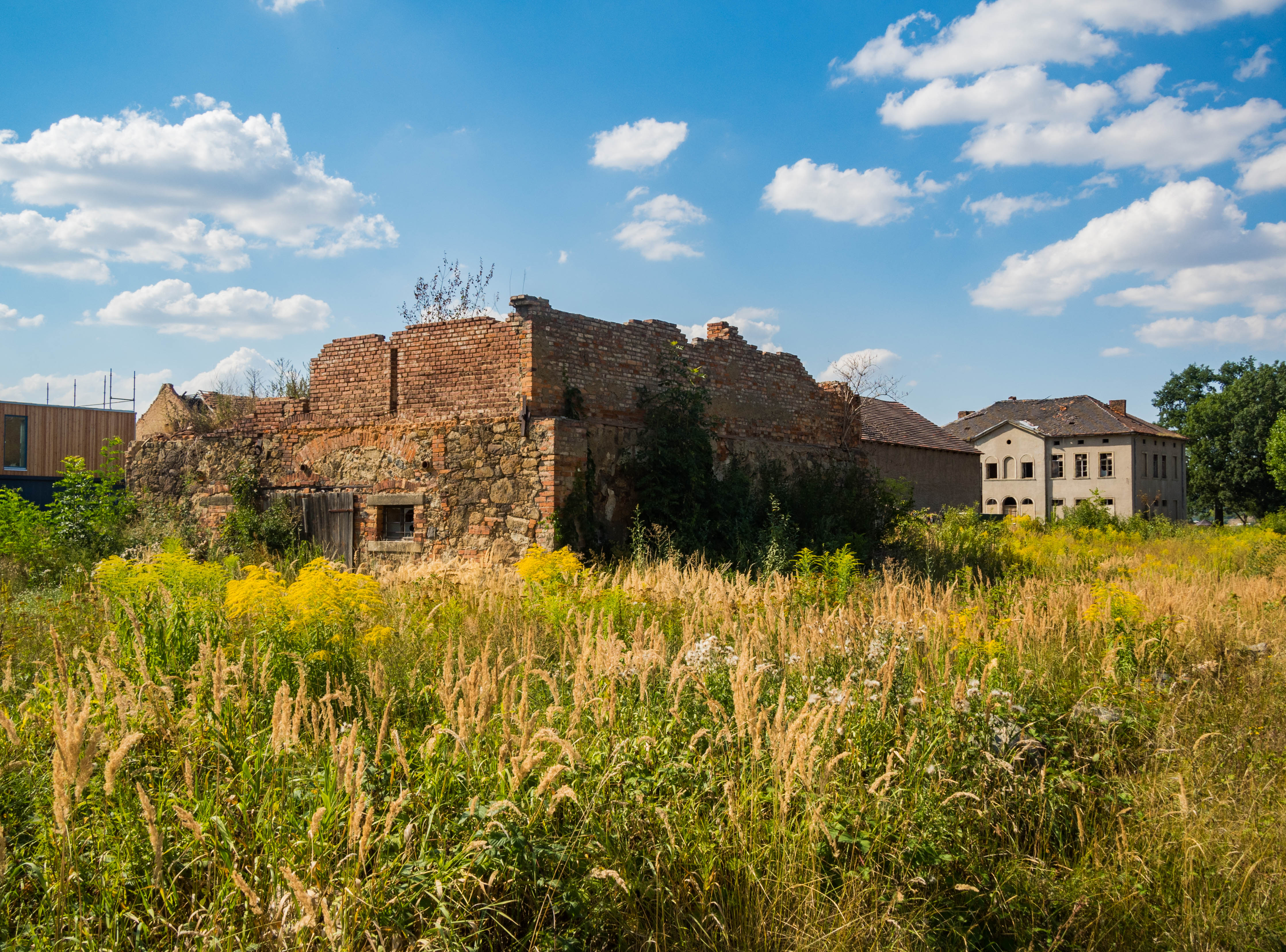 Idąc wzdłuż brzegu na południe powoli zauważamy zmianę jego charakteru. Plaża zostaje za nami, młode równo zasadzone drzewa również. Pojawiają się za to drzewa coraz dorodniejsze i starsze a pomiędzy nimi majaczą szkielety równie wiekowych budynków. Plebania, budynki gospodarcze dawnego majątku, sam piękny choć zdewastowany dwór, relikty ulic a między nimi ulokowane współczesne budki gastronomiczne, przystanki dla rowerzystów, miejsca gdzie można odpocząć. Oto dochodzimy do miejsca zawieszonego między przeszłością a teraźniejszością.