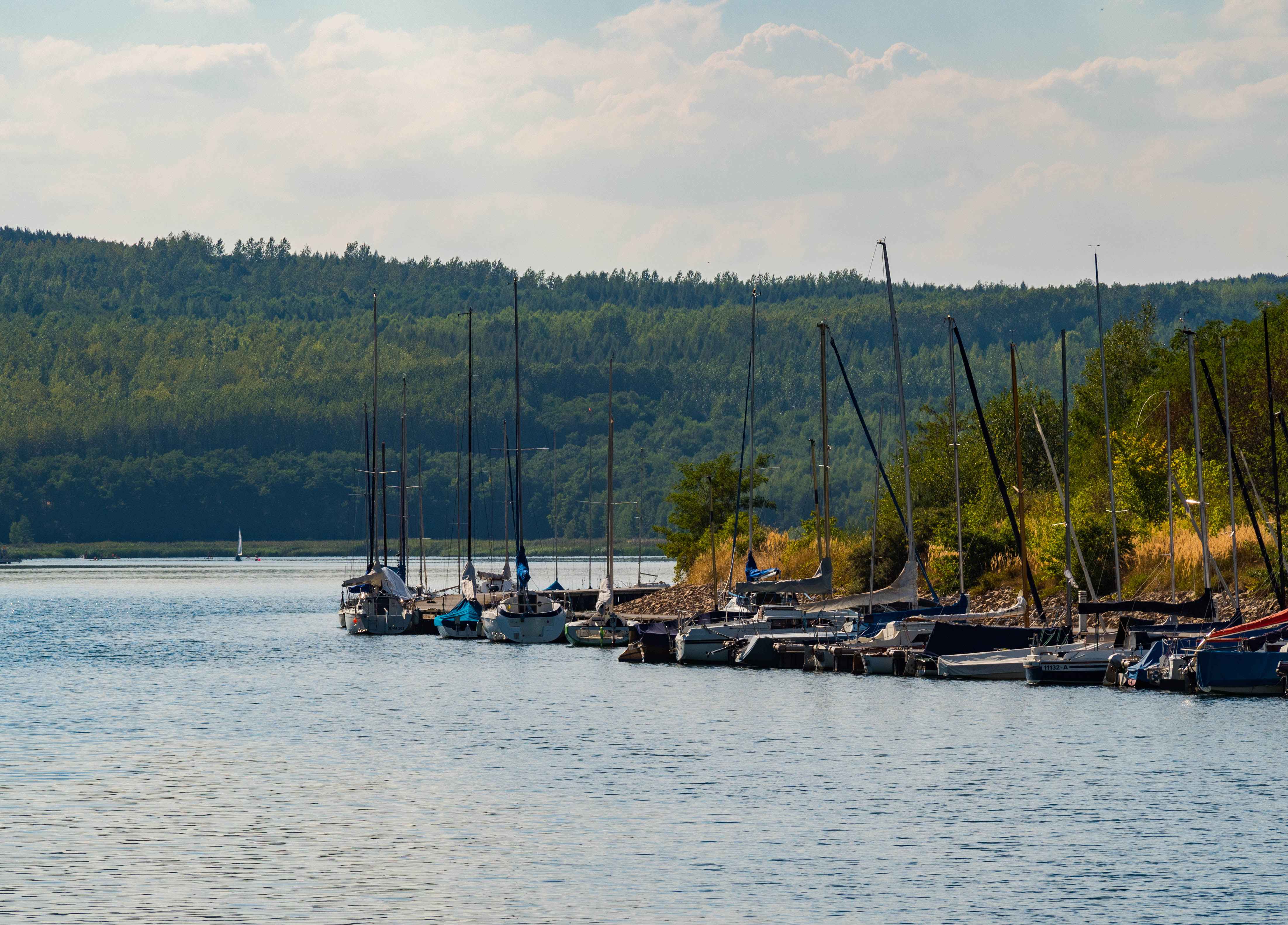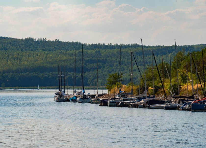 Po chwili wraca cywilizacja. na horyzoncie majaczy sylwetka hotelu, pojawia się kolejna plaża. Docieramy do Hagenwerder, dziś spokojnej miejscowości, niedawno jeszcze mocno związanej z górnictwem a historycznie prawdopodobnie jednej z najstarszych osad serbołużyckich na tych terenach. W mijanej marinie kilkanaście żaglówek, kawiarenka niestety zamknięta we wtorki i tylko witamy się z klamką. Daleko na drugim brzegu pięknie na skarpie prezentuje się wieś, Jauernick-Buschbach. Kiedyś i tam musimy trafić bo z odległości wygląda na diablo ciekawe miejsce.