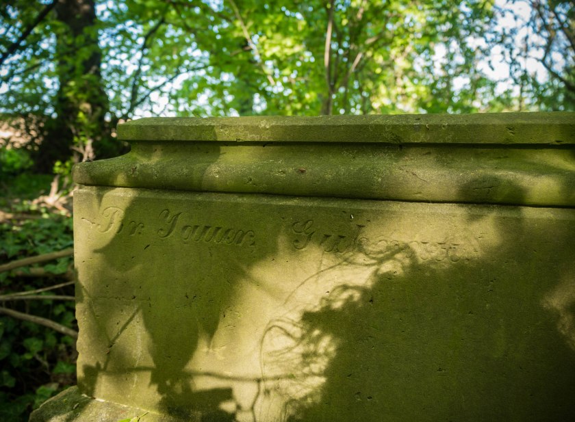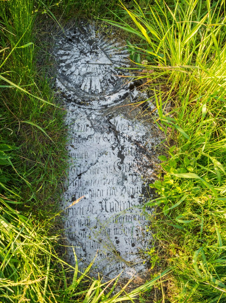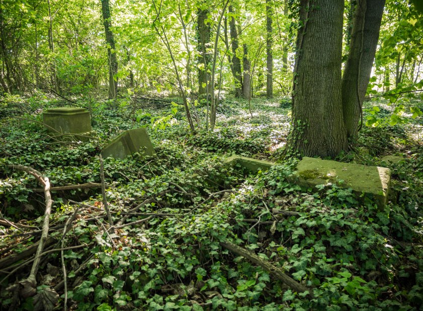 Cmentarz ewangelickiej społeczności, choć bez wątpienia jest jednym z bardziej namacalnych śladów po dawnych mieszkańcach jest też bardzo łatwy do przeoczenia. Nekropolia skrywa się tuż przy drodze ze Szlichtyngowej i przykrywała ją tak gęsta warstwa bluszczu, że nie byłem nawet w stanie ocenić w jakim stanie się znajduje. Pojedyncze nagrobki wychylały się ponad roślinność, gdzieniegdzie widać było zarys grobów. Z jednej strony lekko przygnębiające, że miejsce takie stoi pozostawione bez opieki, z drugiej ponura satysfakcja z niby zwykłego faktu, że nie zostało ono zrównane z ziemią i wciąż trwa (jakkolwiek).