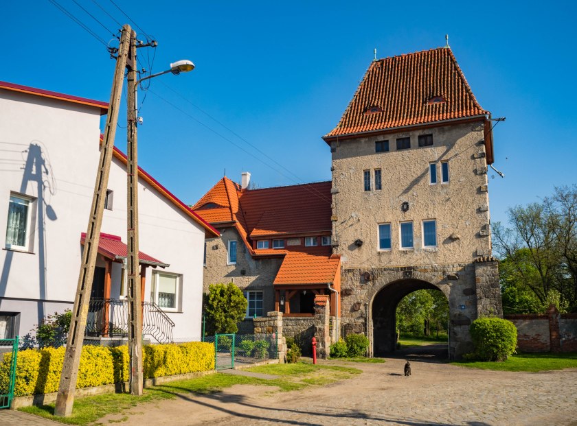Wróćmy do bramy. Ocalała wieża ze stylową dobudówką (częściowo z muru pruskiego) do dziś jest zamieszkała i zadbana. Mieszkająca tam starsza pani wspominała czasy, kiedy pałac „dopiero” co był rozbierany a jedną z zabaw dzieci było eksplorowanie odkrytych podziemi. Było, minęło.