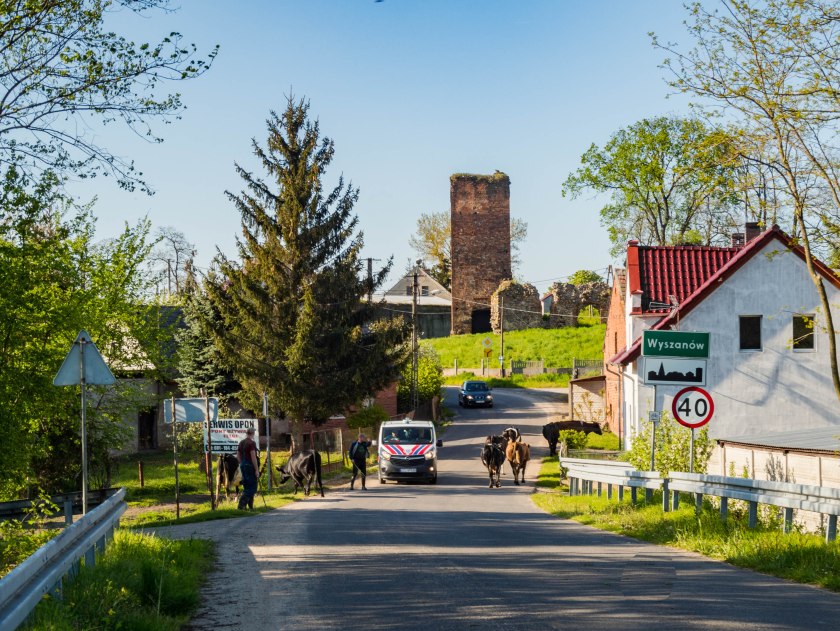 Było wczesne, wtorkowe popołudnie, kiedy to po dość spontanicznej decyzji wysiadałem z busa w Szlichtyngowej i z uśmiechem na twarzy ruszałem w 3 kilometrowy spacer na południe, w stronę Baryczy. Po kilkunastu minutach na horyzoncie pojawiła się wieża strażacka, a za nią zarysy wieży bramnej, dziś chyba najbardziej emblematycznego budynku Wyszanowa. Przy remontowanej drodze krzątali się ostatni robotnicy, na ścieżce rowerowej trzy panie maszerowały z kijkami, a chwilę później przy pierwszych zabudowaniach podbiegł do mnie czarny kundelek, przez chwilę mi towarzysząc. W oddali widać było pracującą w ogródku parę, ktoś wylewnie żegnał się z odwiedzającymi go gośćmi, nad leniwą jeszcze Baryczą w słonku grzały się krowy. Niesamowicie spokojna aura zarażała błogim nastrojem. Rozglądając się wokół próbowałem sobie wyobrazić jak wieś prezentowała się 100 lat temu, kiedy to statki wycieczkowe na rzece wciąż były codziennością a istniejący jeszcze pałac oraz hotel (z kąpieliskiem, salą taneczną i wieżą widokową!) przyciągały tłumy z Głogowa czy Wschowy.