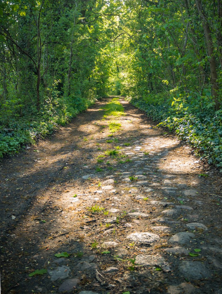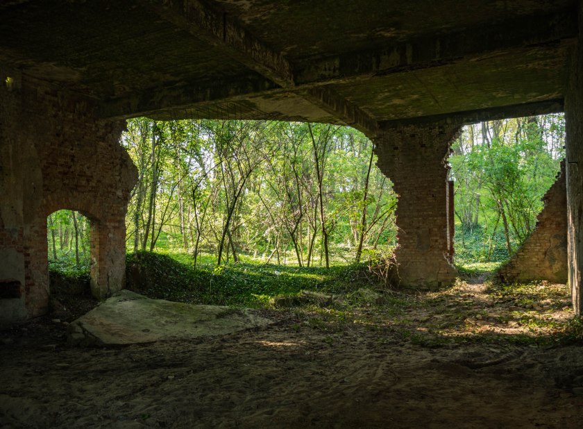 Do jedynej pozostałości po kompleksie docieramy ścieżką rowerową, kierunek wyznaczają kocie łby. Dawna sala taneczna niknie w gęstwinie drzew, jednak jak tylko bliżej się podejdzie to bije od niej ułamek dawnego blasku… nawet jeśli rozpadający się na naszych oczach i czekający na ostatni oddech. Resztki delikatnego detalu wokół okien i drzwi są jakby ostatnim tchnieniem niegdyś popularnego miejsca.