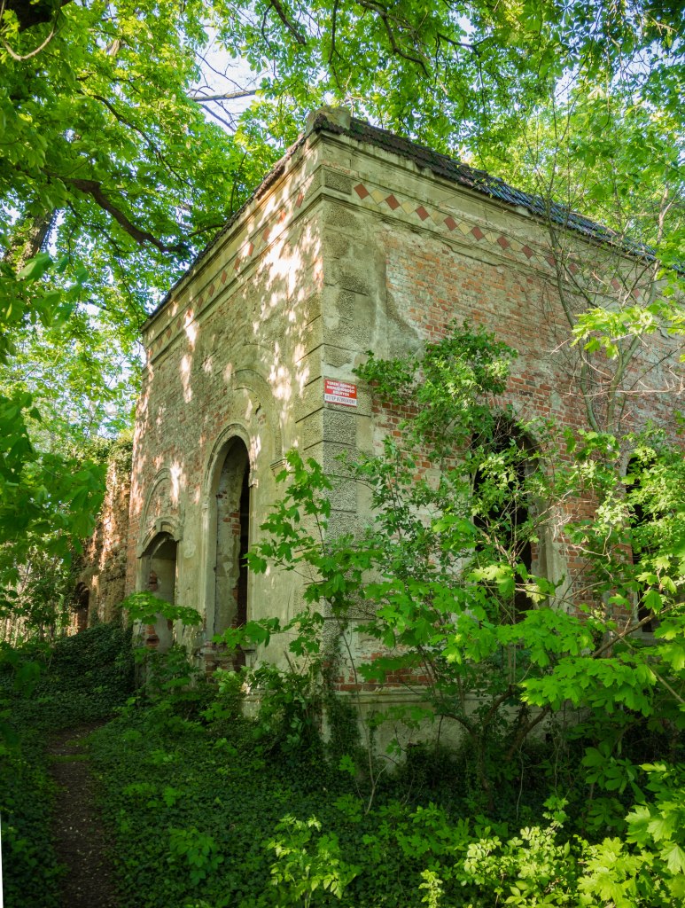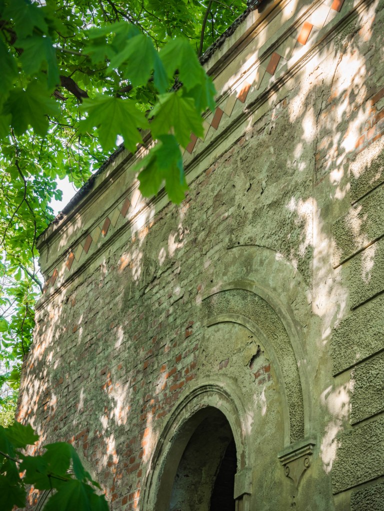 Po pałacu została ziejąca pustką przestrzeń, częściowo zarośnięta, częściowo zagospodarowana… przez najmłodszych i prowizoryczne boisko w nogę. Wokół rozciąga się przepastny park i na spacer po nim was zapraszam. Tam to bowiem, na jego wschodnim krańcu znajdziecie niezwykłe (choć nadszarpnięte zębem czasu i ludzką bezmyślnością) mauzoleum ostatnich właścicieli.
