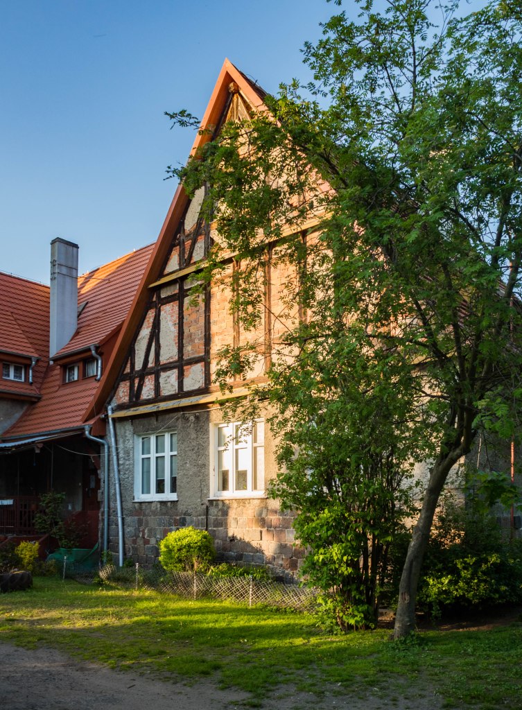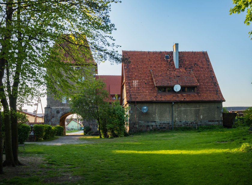 Popołudniowe słońce sprzyja powolnemu spacerowi po wsi. Ten jest dość krótki bo też wiele do zobaczenia nie ma, jednak to co jest sprawia bardzo urokliwe wrażenie. Domy sprzed 100 i więcej lat trzymają się mocno (poza kilkoma wyjątkami), w niektórych można rozpoznać dawny sklep kolonialny (pani Brauer), czworak dziś służący za Salę Wiejską czy gmach poczty. Ciepłe światło pięknie tu pasuje.