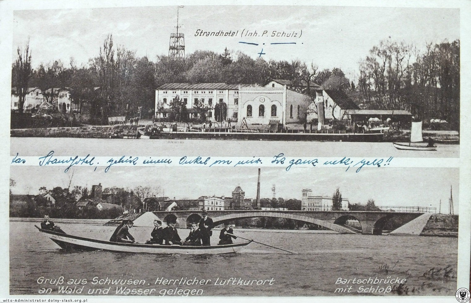 Zaprawdę piękne to okolice i nie powinno nas dziwić, że przeszło 100 lat temu Wyszanów doczekał się zaszczytu awansu na miejscowość letniskową dzięki czemu na brzegu Baryczy wybudowany został całkiem spory kompleks hotelowy. Taki na pełnym wypasie z restauracją, salą taneczną, przystanią dla statków wycieczkowych mniejszych i większych, plażą i w końcu drewnianą wieżą widokową, z której rozpościerać się musiał kapitalny widok na Wzgórza Dalkowskie chociażby. Hotel przyciągał gości z Głogowa, Wschowy i innych większych miejscowości. Ach.