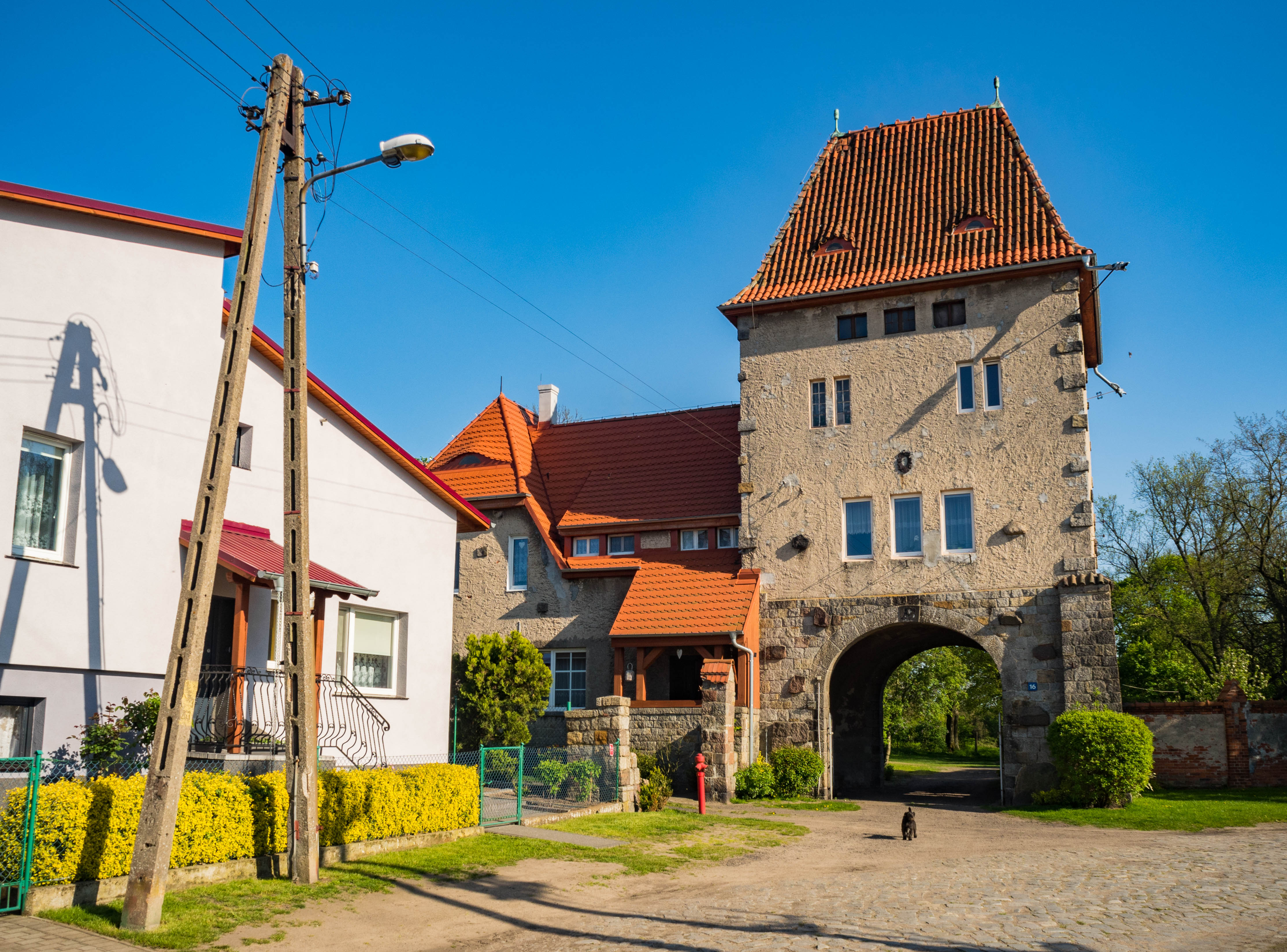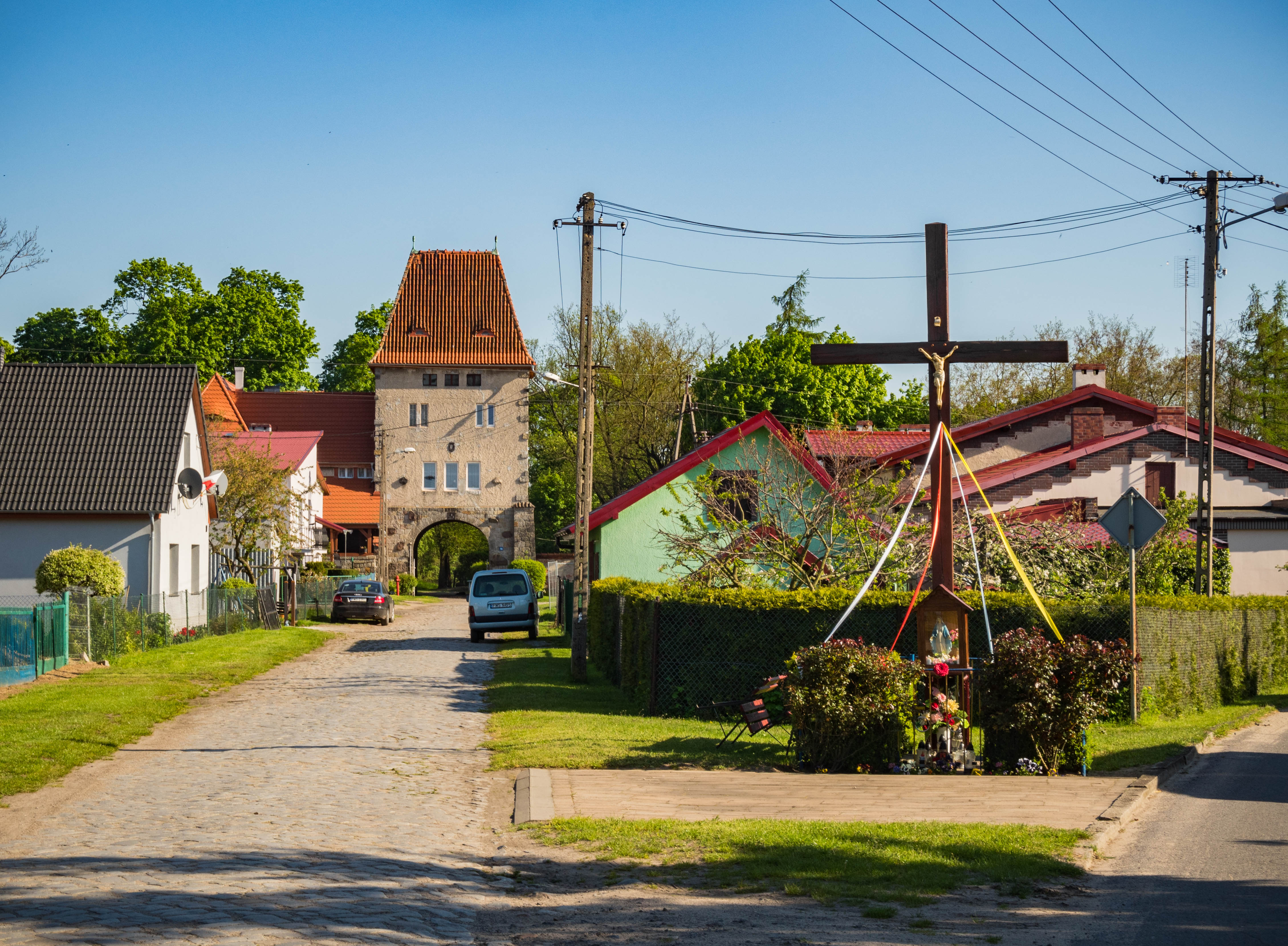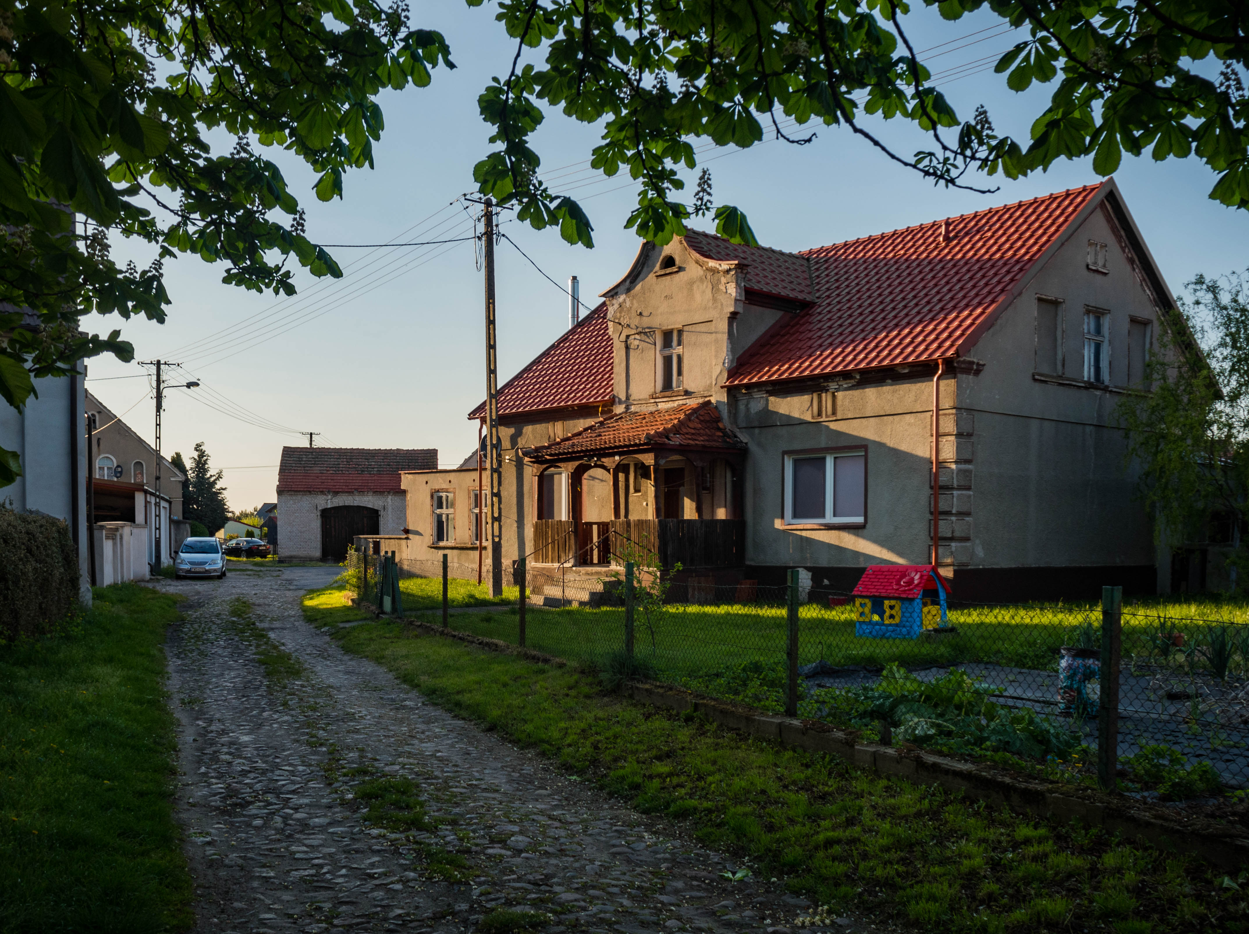 Popołudniowe słońce sprzyja powolnemu spacerowi po wsi. Ten jest dość krótki bo też wiele do zobaczenia nie ma, jednak to co jest sprawia bardzo urokliwe wrażenie. Domy sprzed 100 i więcej lat trzymają się mocno (poza kilkoma wyjątkami), w niektórych można rozpoznać dawny sklep kolonialny (pani Brauer), czworak dziś służący za Salę Wiejską czy gmach poczty. Ciepłe światło pięknie tu pasuje.