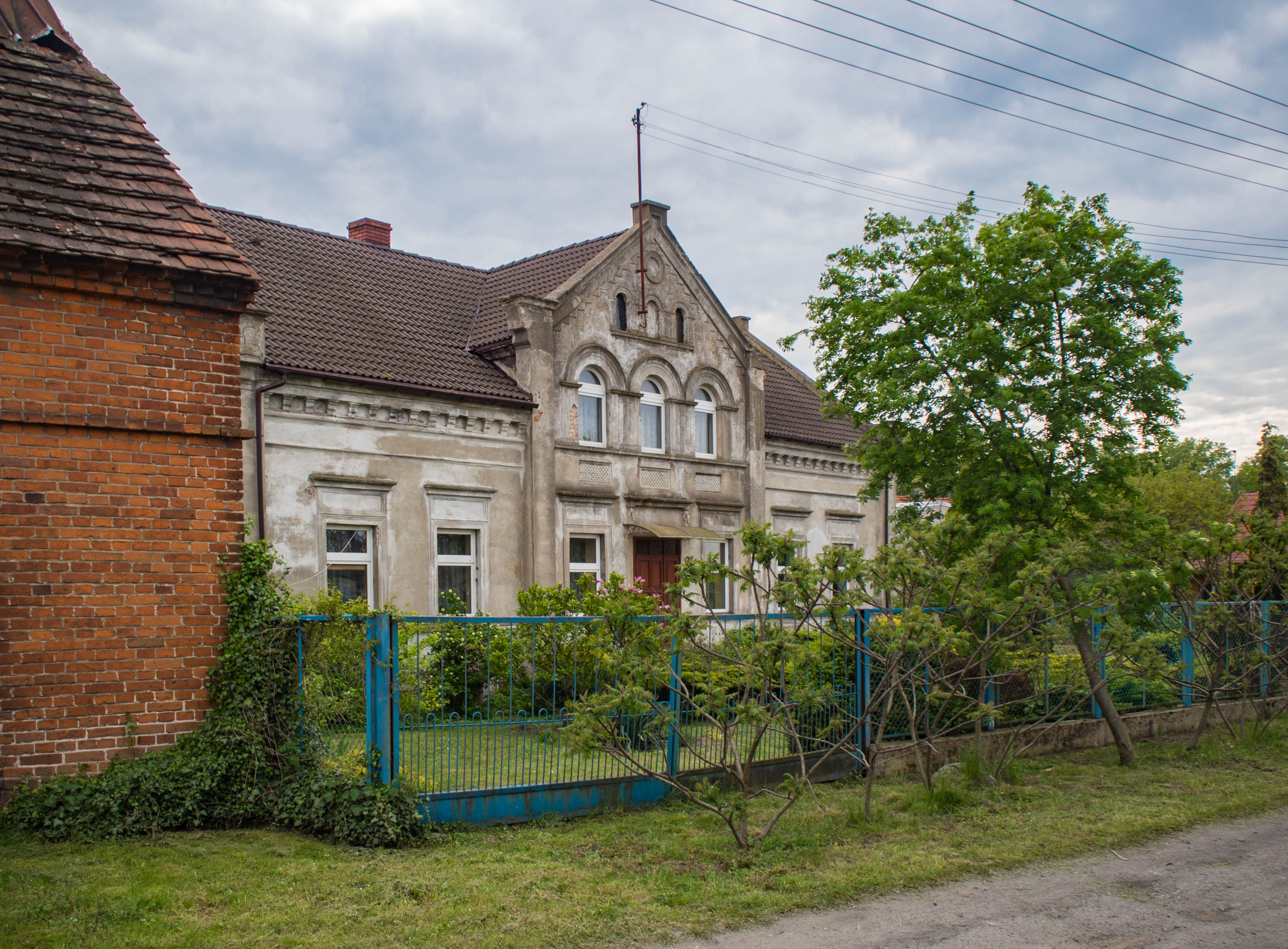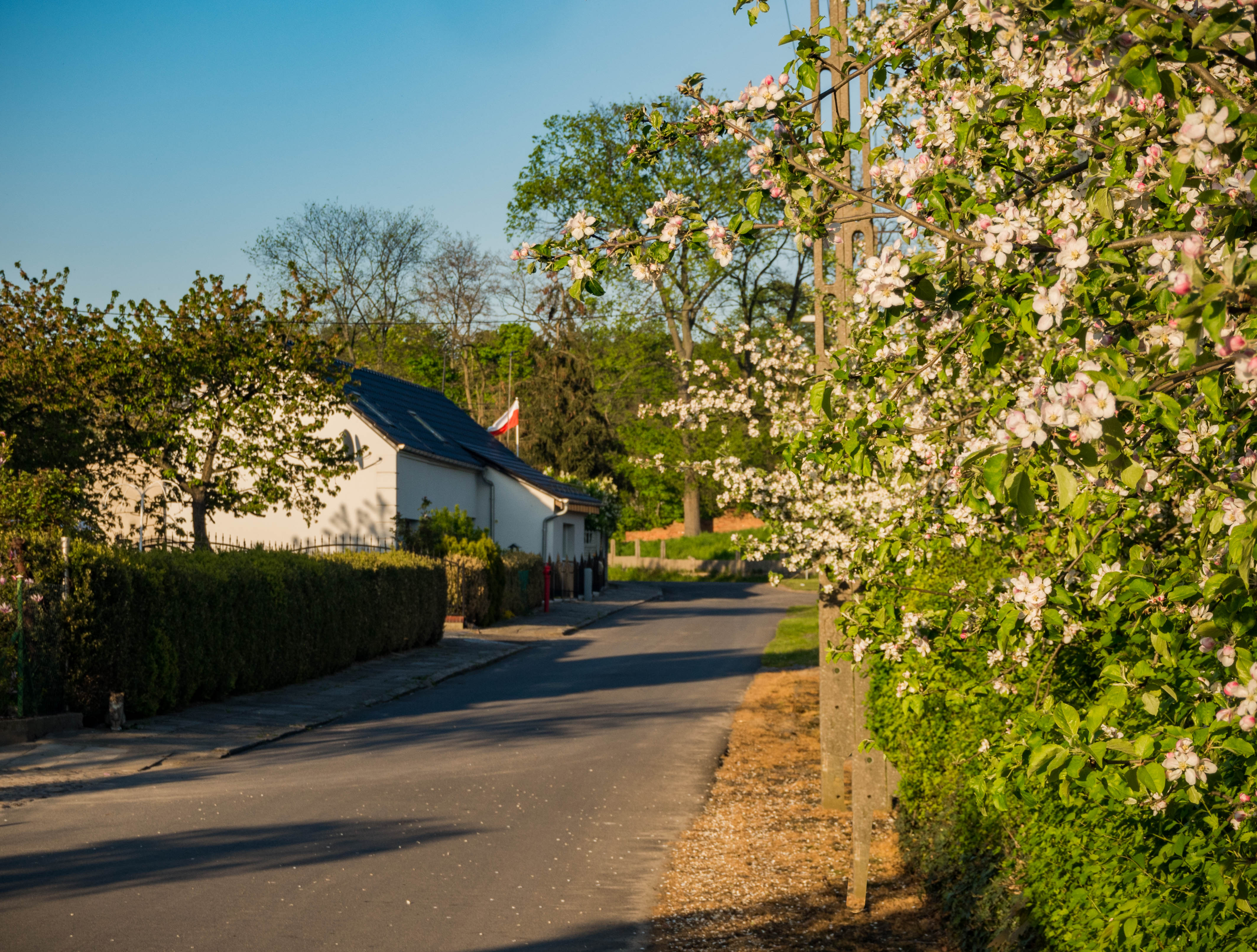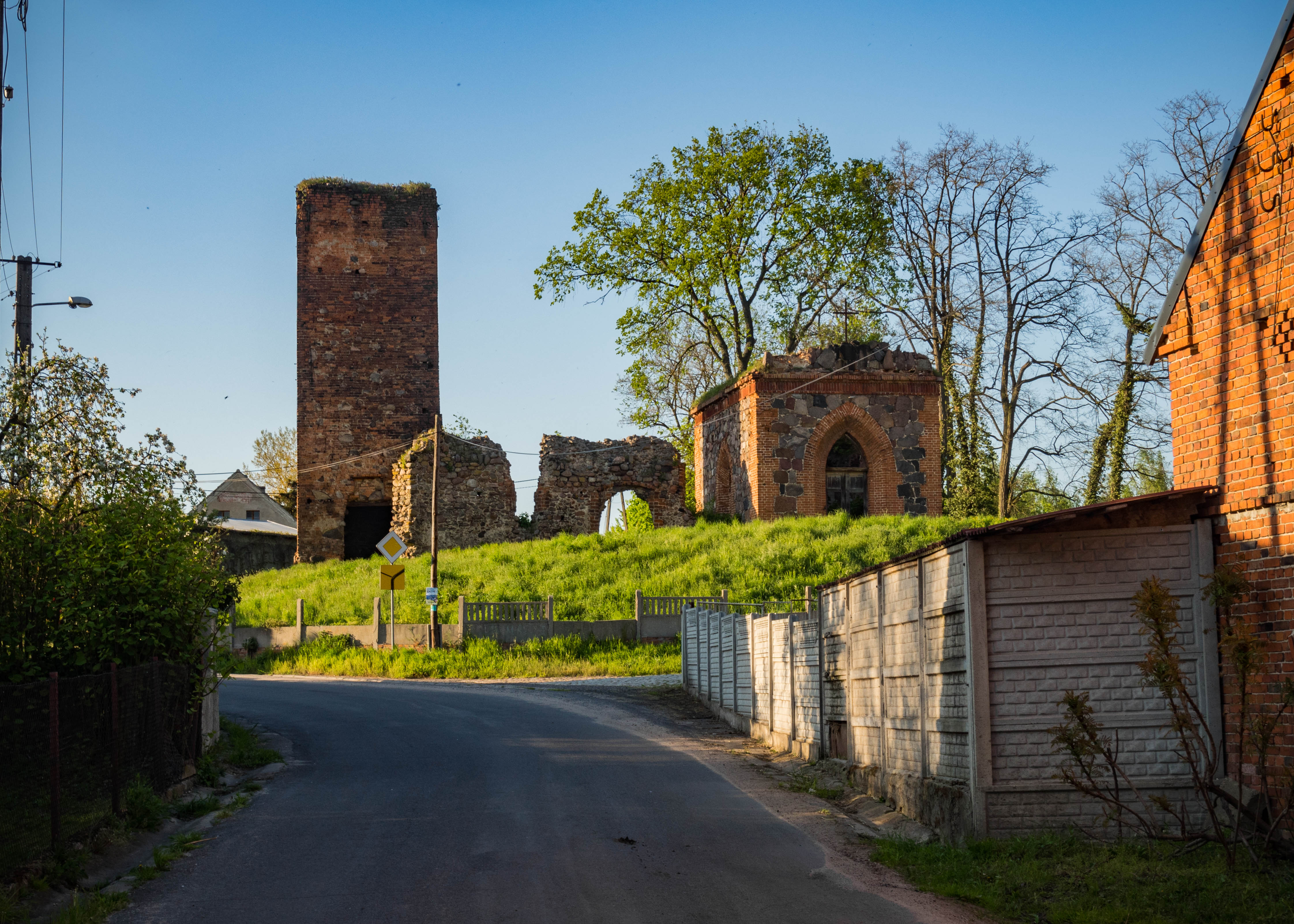 Popołudniowe słońce sprzyja powolnemu spacerowi po wsi. Ten jest dość krótki bo też wiele do zobaczenia nie ma, jednak to co jest sprawia bardzo urokliwe wrażenie. Domy sprzed 100 i więcej lat trzymają się mocno (poza kilkoma wyjątkami), w niektórych można rozpoznać dawny sklep kolonialny (pani Brauer), czworak dziś służący za Salę Wiejską czy gmach poczty. Ciepłe światło pięknie tu pasuje.