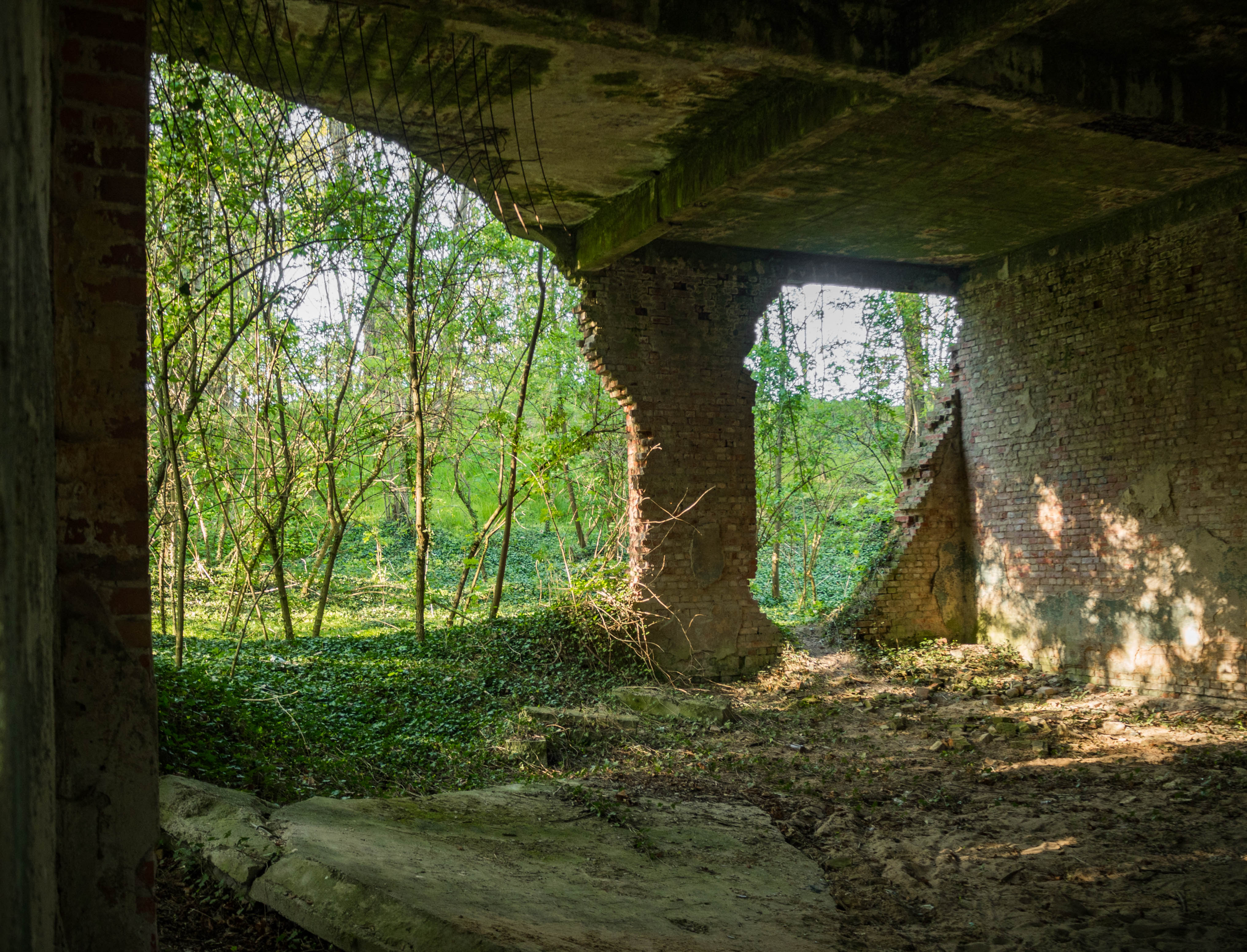 Do jedynej pozostałości po kompleksie docieramy ścieżką rowerową, kierunek wyznaczają kocie łby. Dawna sala taneczna niknie w gęstwinie drzew, jednak jak tylko bliżej się podejdzie to bije od niej ułamek dawnego blasku… nawet jeśli rozpadający się na naszych oczach i czekający na ostatni oddech. Resztki delikatnego detalu wokół okien i drzwi są jakby ostatnim tchnieniem niegdyś popularnego miejsca.