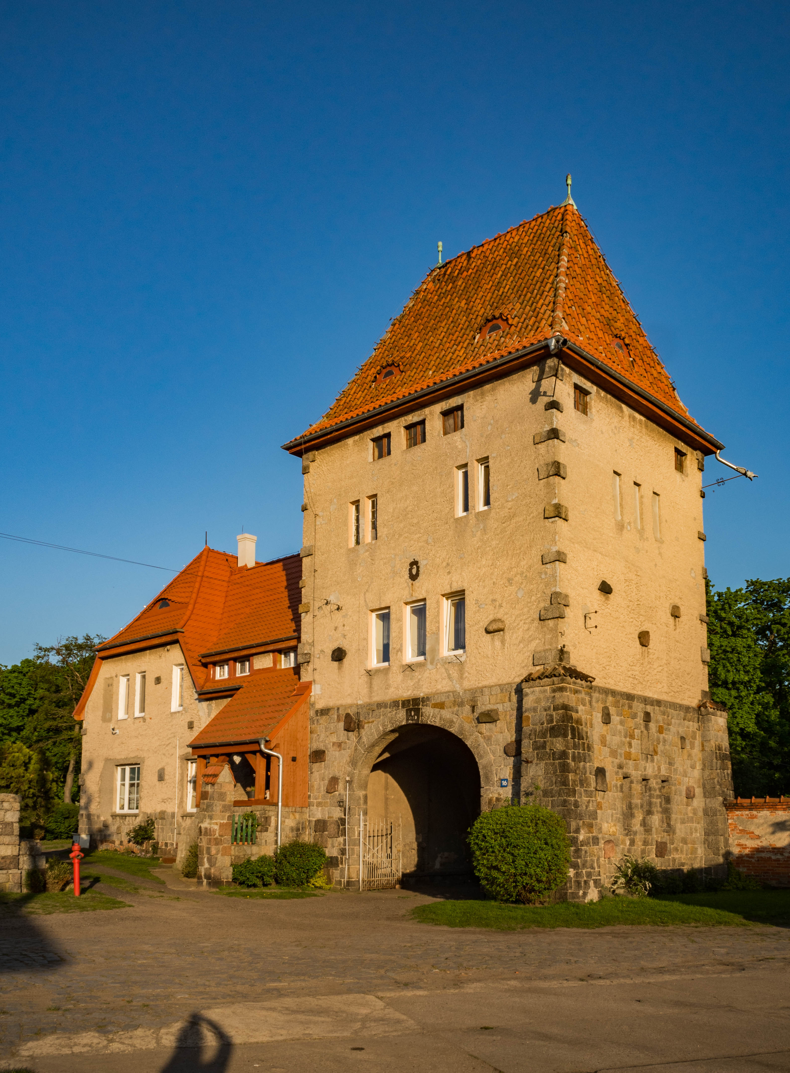 Wróćmy do bramy. Ocalała wieża ze stylową dobudówką (częściowo z muru pruskiego) do dziś jest zamieszkała i zadbana. Mieszkająca tam starsza pani wspominała czasy, kiedy pałac „dopiero” co był rozbierany a jedną z zabaw dzieci było eksplorowanie odkrytych podziemi. Było, minęło.