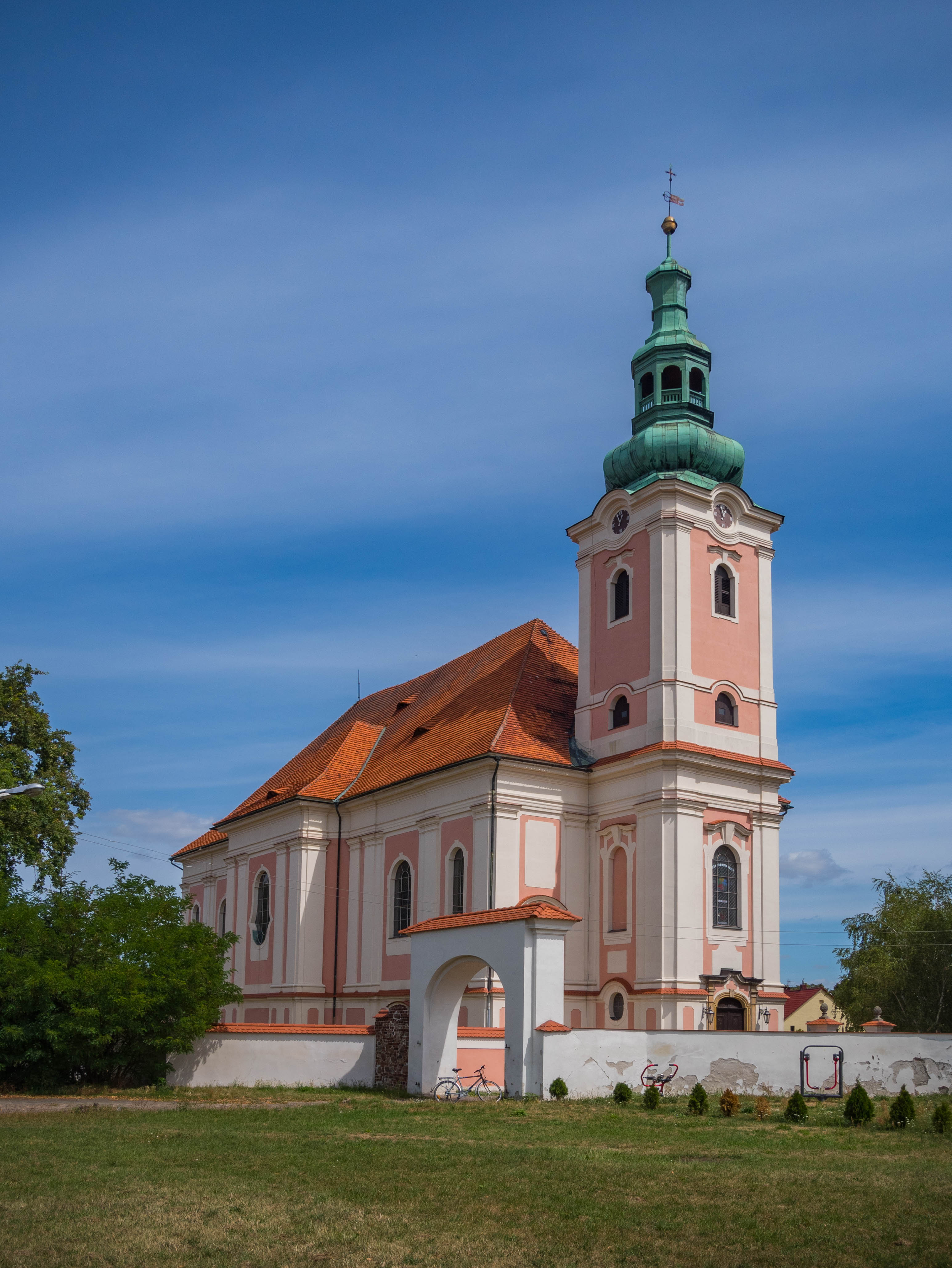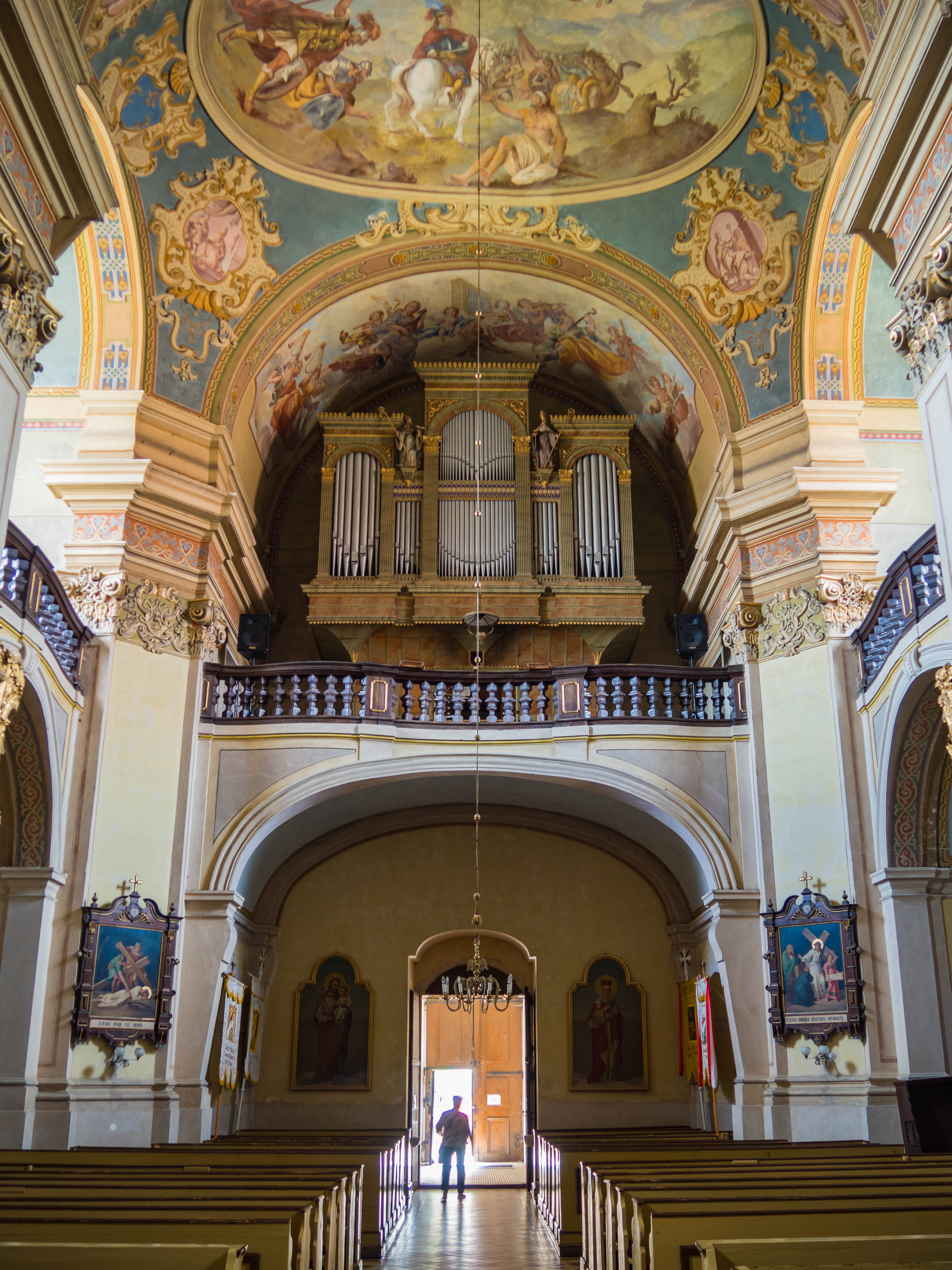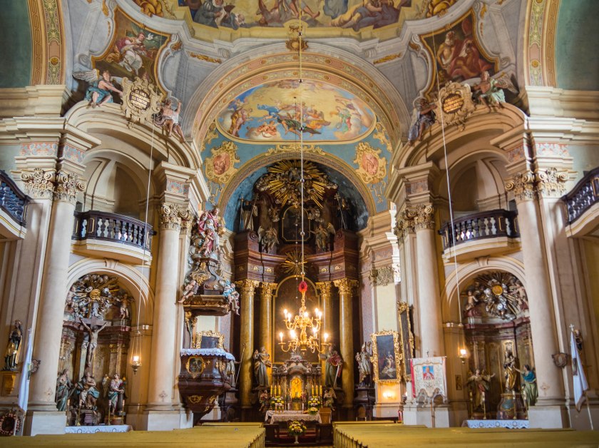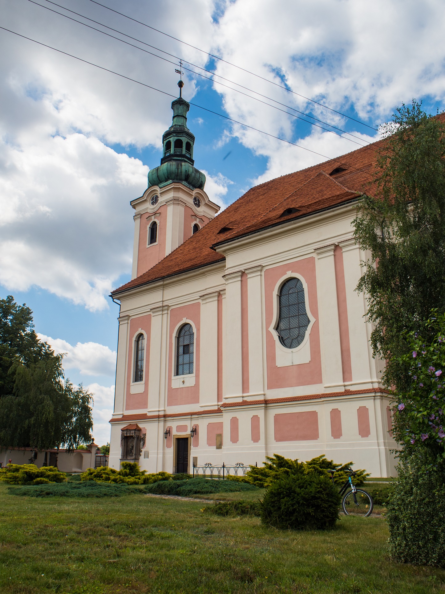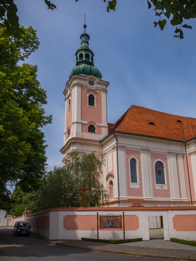 Z zewnątrz ładna, ale dość zachowawcza jak na barok bryła, trochę przypominająca kościół Św. Krzyża w Lesznie, a wedle mądrzejszych ode mnie mocno zainspirowana czeskimi architektami Dientzenhoferami (co po wyguglaniu stwierdzam trafnym jest porównaniem). Szybko okazuje się, że skojarzenie z Lesznem finalnie znajduje uzasadnienie – w pracach nad oboma kościołami udział brał Karal Marcin Frantz, nadworny budowniczy Augusta III, postać dla wielkopolskiej i dolnośląskiej architektury dość znaczna.