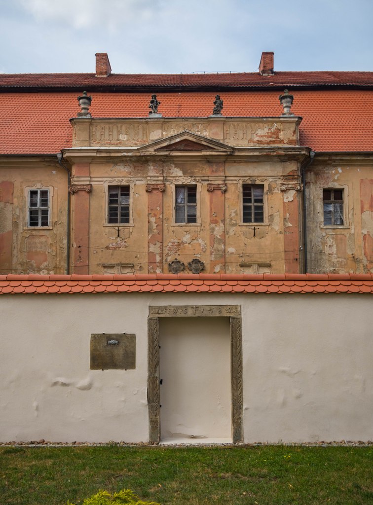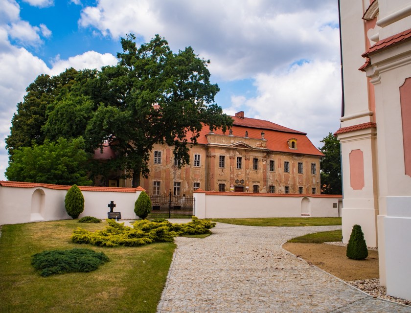 Trochę w cieniu kościoła znajduje się powstały w tym samym czasie pałac prepozyta lubiąskiego opata. O jego zakonnej proweniencji do dziś zaświadczają znajdujące się nad drzwiami dwa kartusze, samego opata oraz całego zakonu. Pałac pochwalić się mógł dość prostą bryłą za to okazałą fasadą… I cóż, niezbyt długo znajdował się w rękach cystersów.