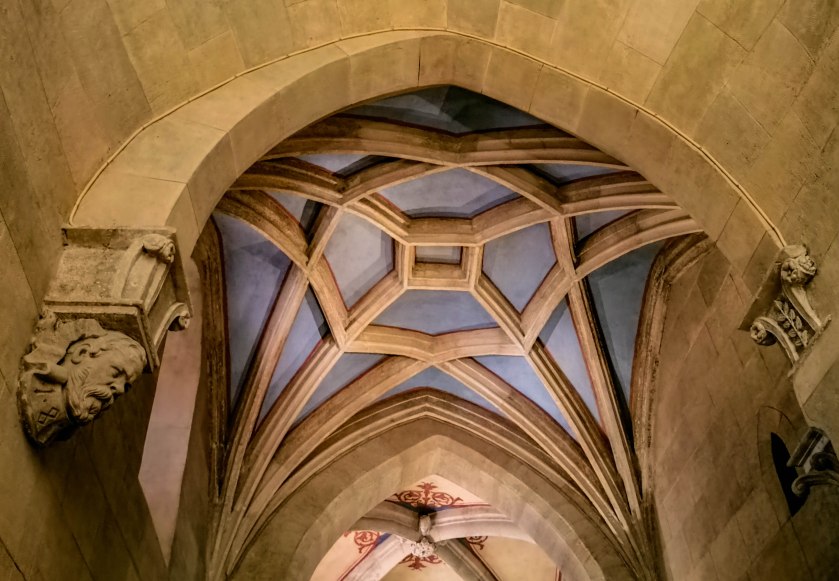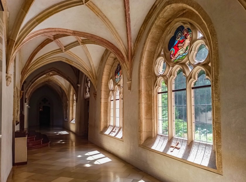 Wielbiciele gotyku powinni poczuć się tu jak ryby w wodzie. Oto wchodzi się na absolutnie zjawiskowy XV-wieczny krużganek, z żebrowymi (choć nie tylko) sklepieniami i oknami maswerkowymi zwieńczonymi witrażami, będącymi przystankami Drogi Krzyżowej. Co i rusz, u podnóża sklepień oko w oko spotkać się można z rzeźbami ludzkich twarzy, wedle przewodnika jaki czytałem mają one symbolizować ludzkie przywary. A skoro jest ich tylko 25 znaczy się, że ktoś nie przyłożył się do swojej pracy 😛