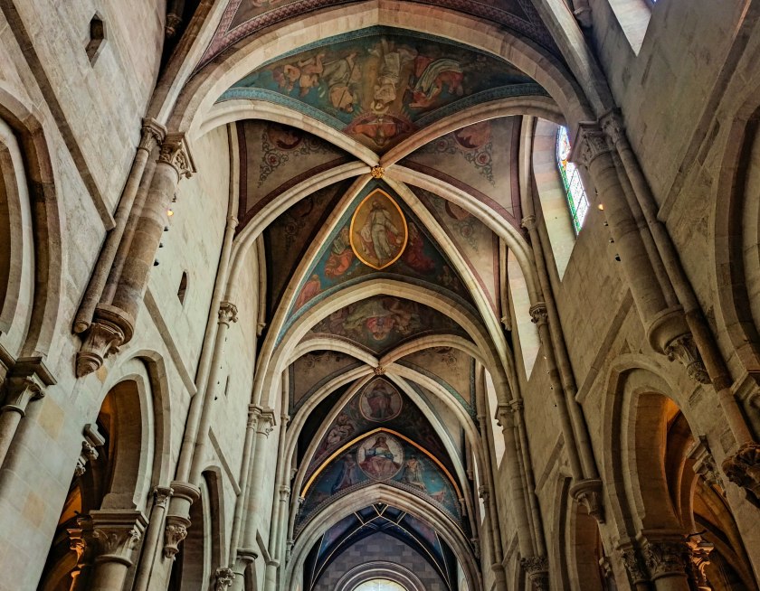 Surowość znika kiedy skierujemy wzrok w górę. Sklepienia robią niesamowite wrażenie, tak te nawy głównej, ale i naw bocznych a dokładniej ołtarzy się w nich znajdujących. Śmiem twierdzić, że tak pięknych, dopieszczonych i wymyślnych sklepień i polichromii dawno nie widziałem. Dodajmy do tego gotyckie drewniane ołtarze, piękne witraże i mamy bingo dla wielbicieli architektury sakralnej.