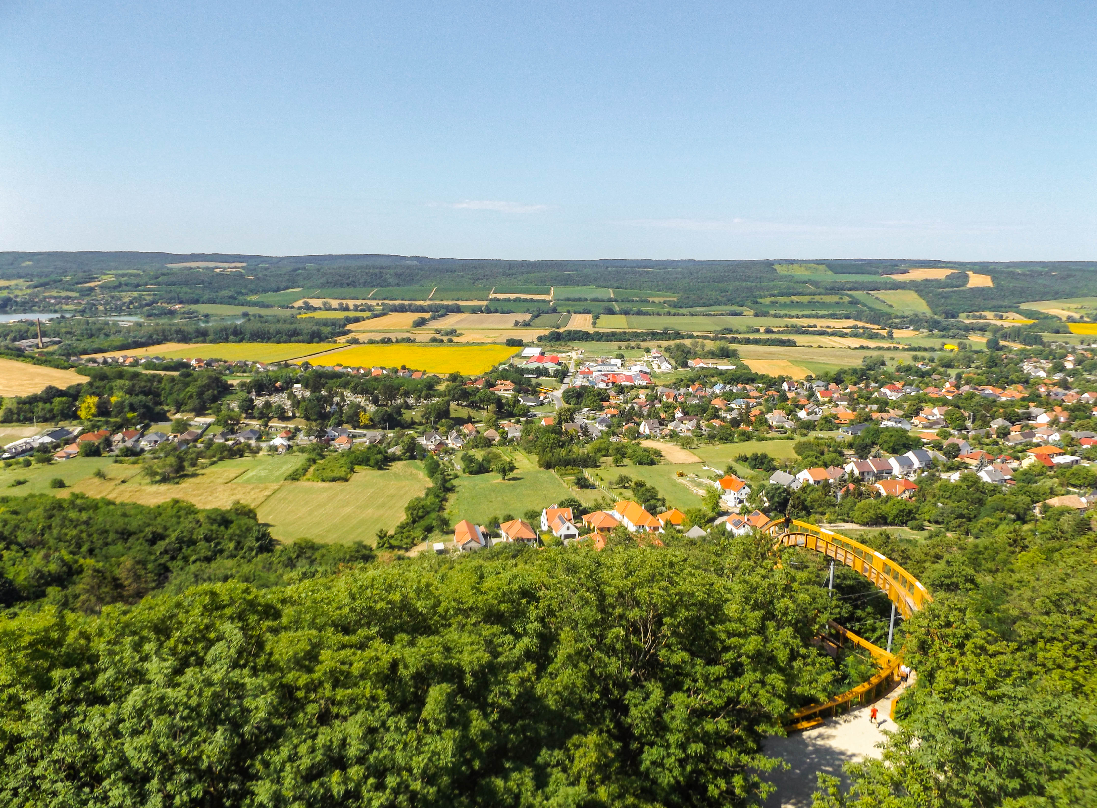 Tak z wieży jak i zakręconej platformy wśród drzew rozciąga się fantastyczna panorama Małej Niziny Węgierskiej urozmaicona wzgórzami ponad miejscowością Nyul. Dopiero stąd też widać jak niemałym miasteczkiem jest Pannonhalma, rozciągająca się u stóp wzgórza. W ogóle takie małomiasteczkowe, rolniczo-leśne krajobrazy wpływają na człowieka uspokajająco. No absolutnie fajne i szybkie do zobaczenia miejsce.