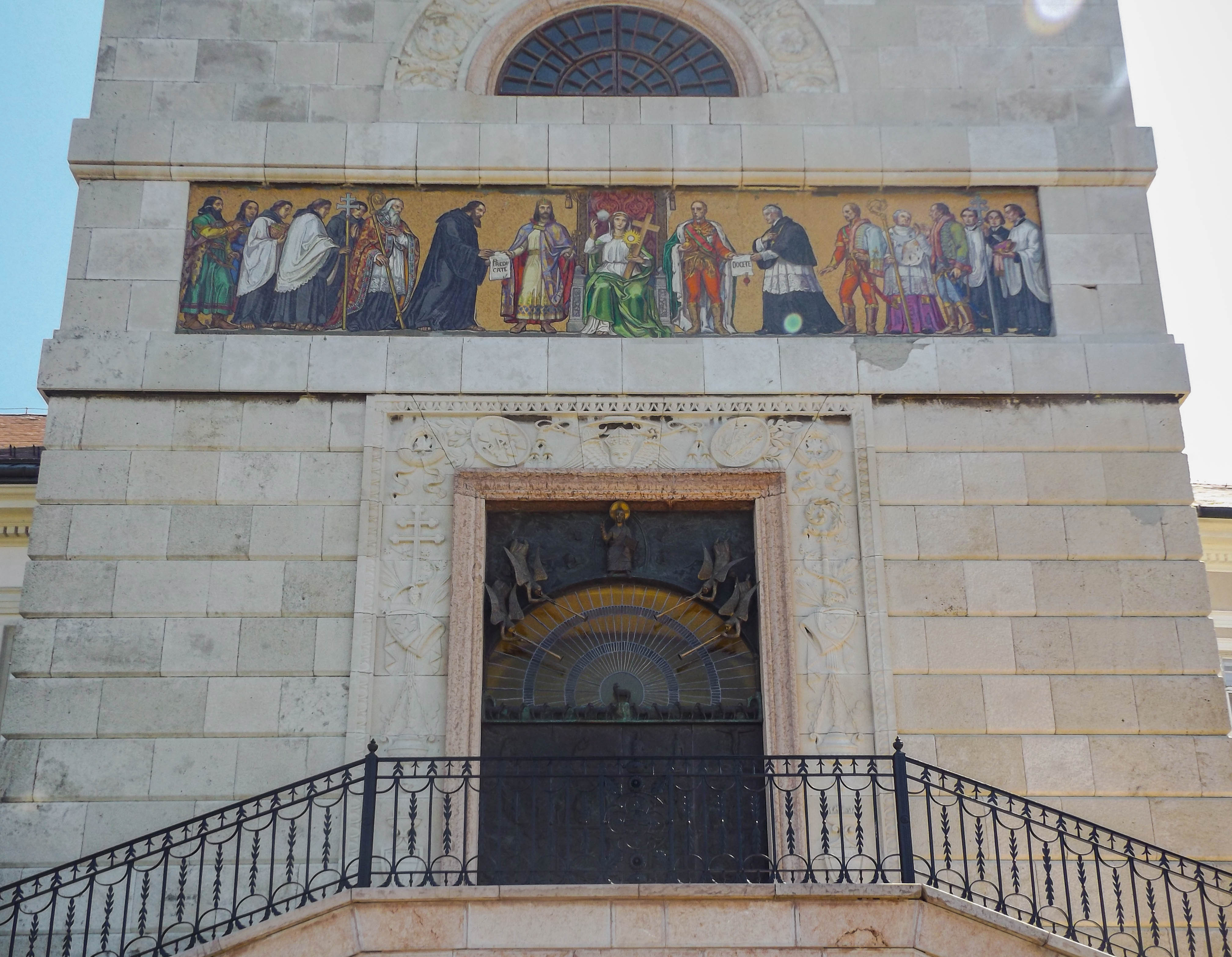 Z zewnątrz najbardziej zadowoleni będą miłośnicy klasycyzmu. Monumentalna przeszło 50 metrowa wieża-dzwonnica widoczna jest już z wielu kilometrów. Ciekawy jest jej portal, brama i taka półrozeta wzdłuż której pociągnięto szereg zdobień, a daty tam umieszczone przypominają o początku opactwa, pierwszej poważnej przebudowie… i w sumie nie wiem o czym, poszukiwanie odpowiedzi co przyniósł rok 1938 nie dało odpowiedzi. Co jednak najbardziej przyciąga wzrok? Mozaika autorstwa Miksy Rotha, węgierskiego mistrza art-nouveau, tu jeszcze w dość stonowanym wydaniu. Zdecydowanie będę musiał odwiedzić Budapeszt i wybrać się jego śladem. Wam też polecam.