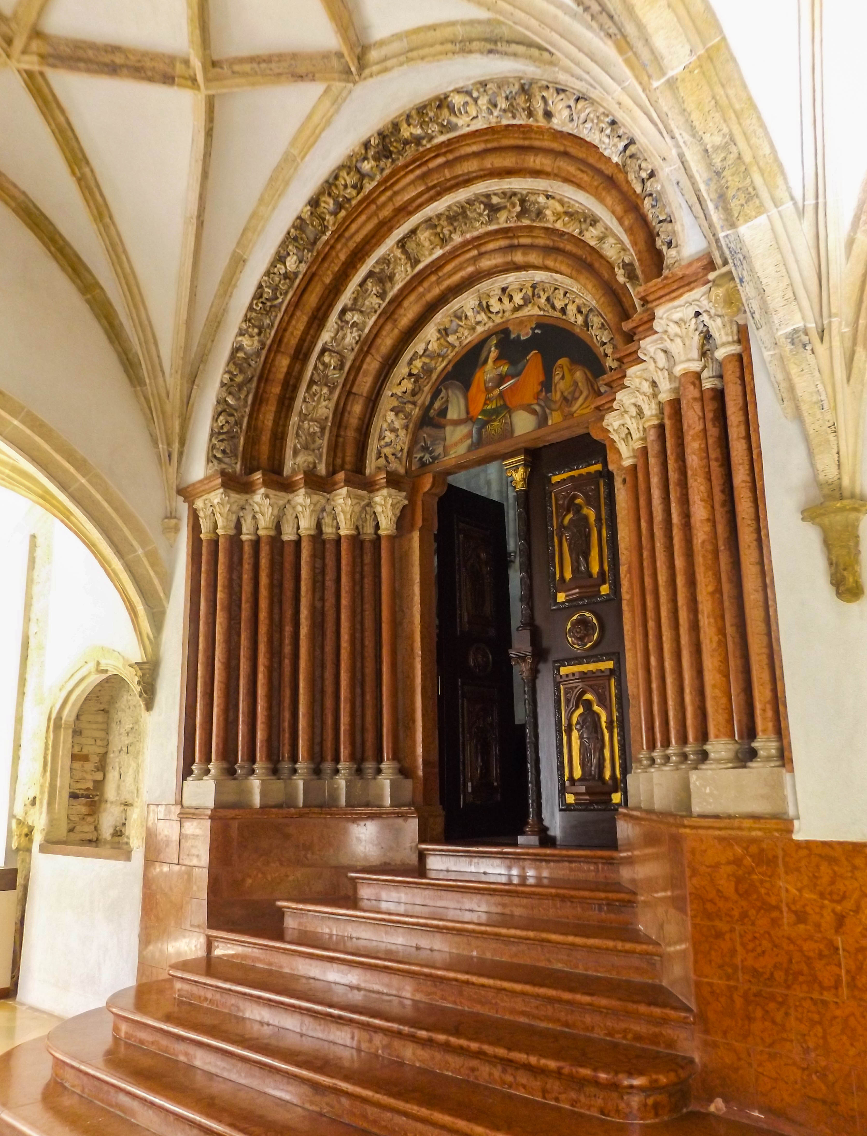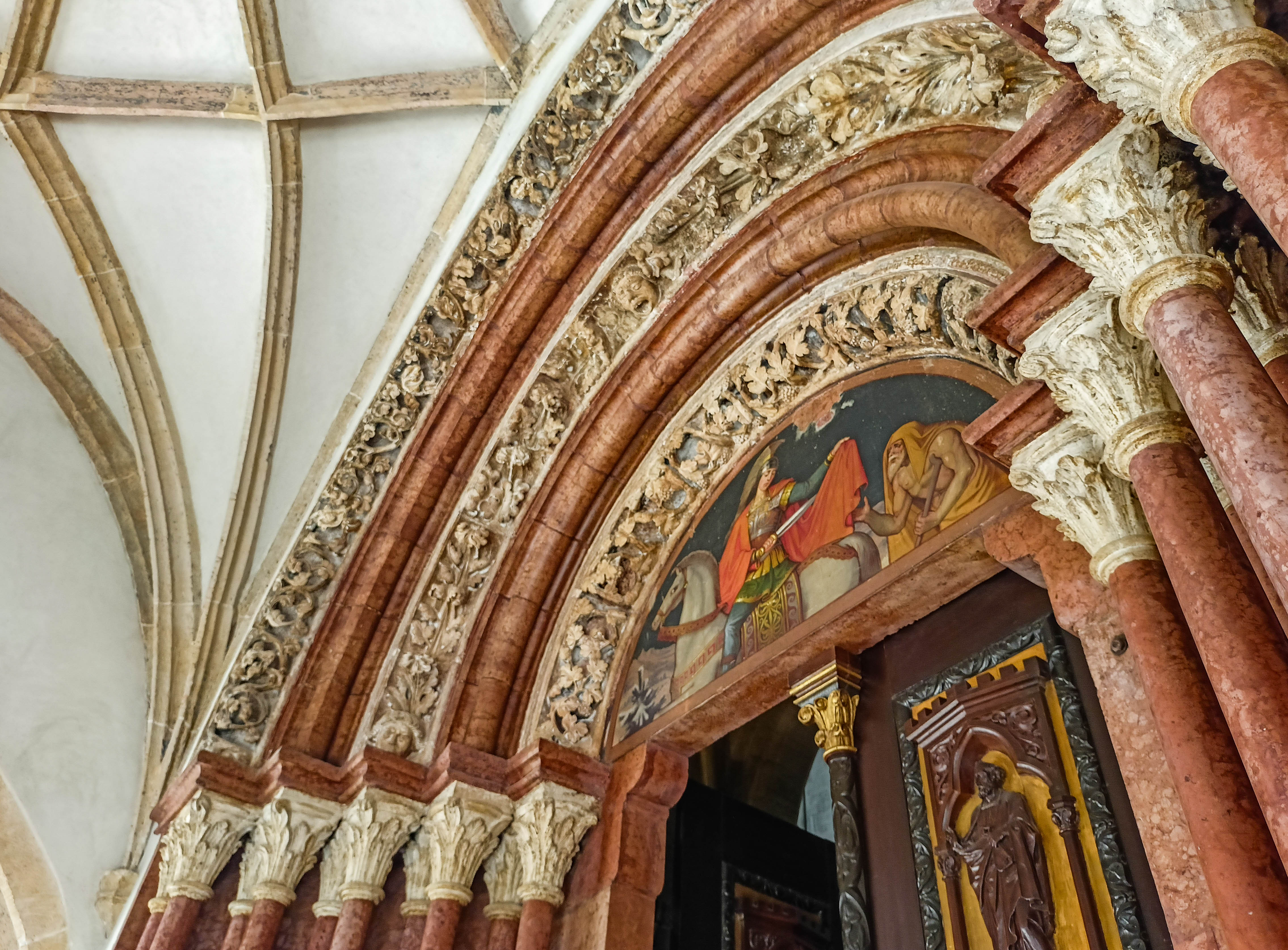 Największym cudem jaki tam znajdziecie jest jednak romańsko-gotycki portal, Porta Speciosa prowadząca do jednej z naw schowanego głębiej kościoła klasztornego, bazyliki Św. Marcina. O ludzie, cóż to za piękna robota. Pięć par podwójnych kolumn z czerwonego marmuru, zamkniętych misternymi archiwoltami na przemian marmurowymi i wapiennymi. Do tego równie okazale ozdobione drzwi i wieńczący całość obraz Św. Marcina dzielącego się ubraniem z ubogim. No proszę państwa: kawał Sztuki przez duże S.