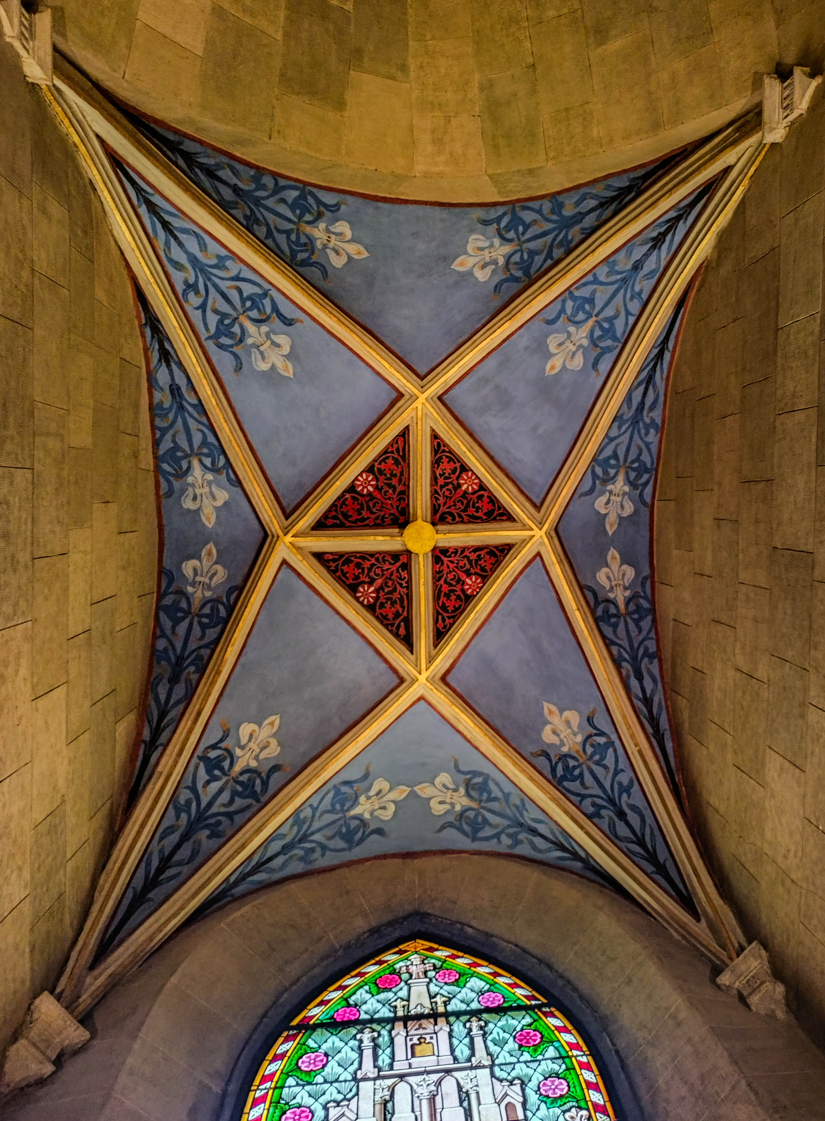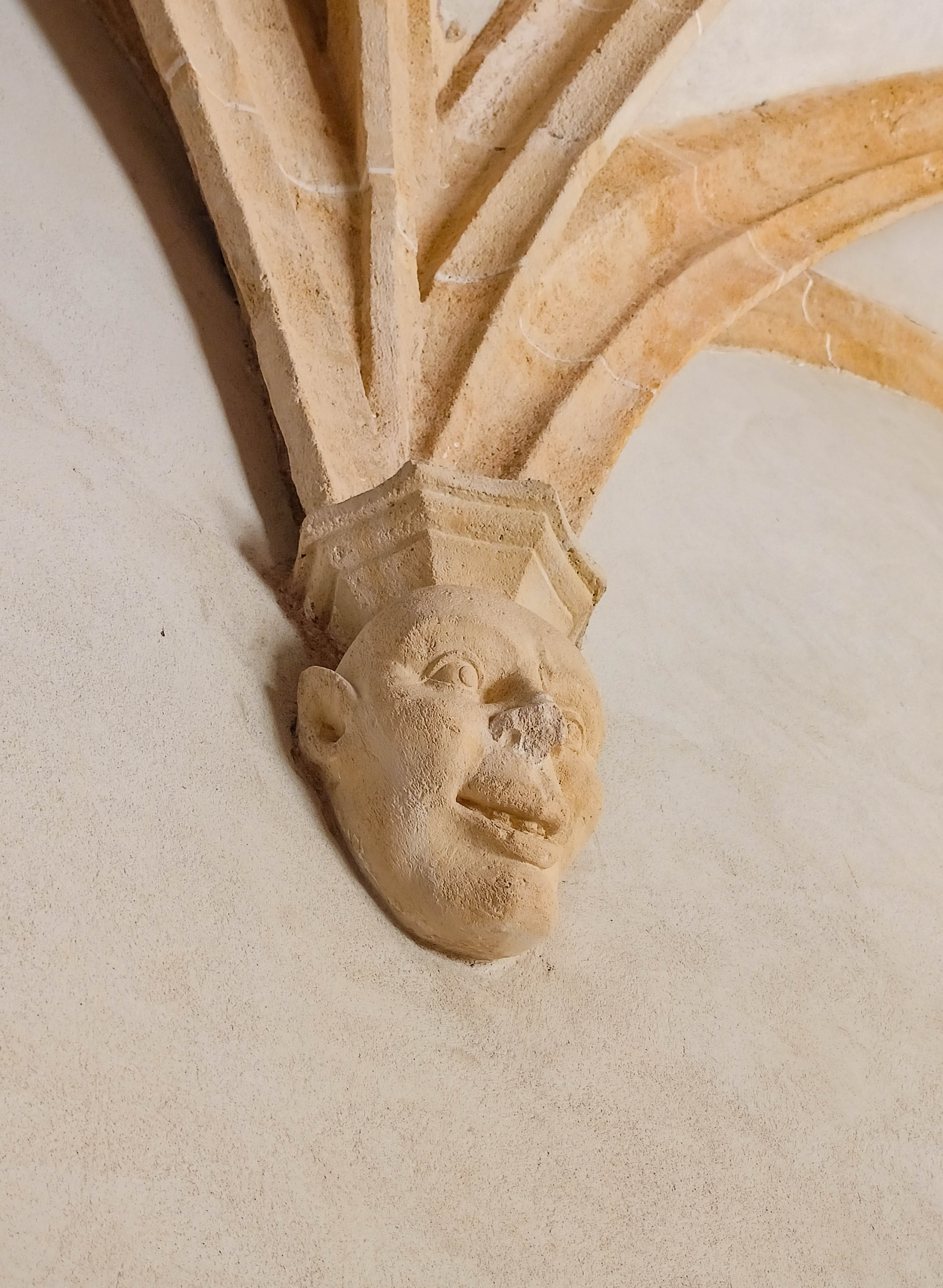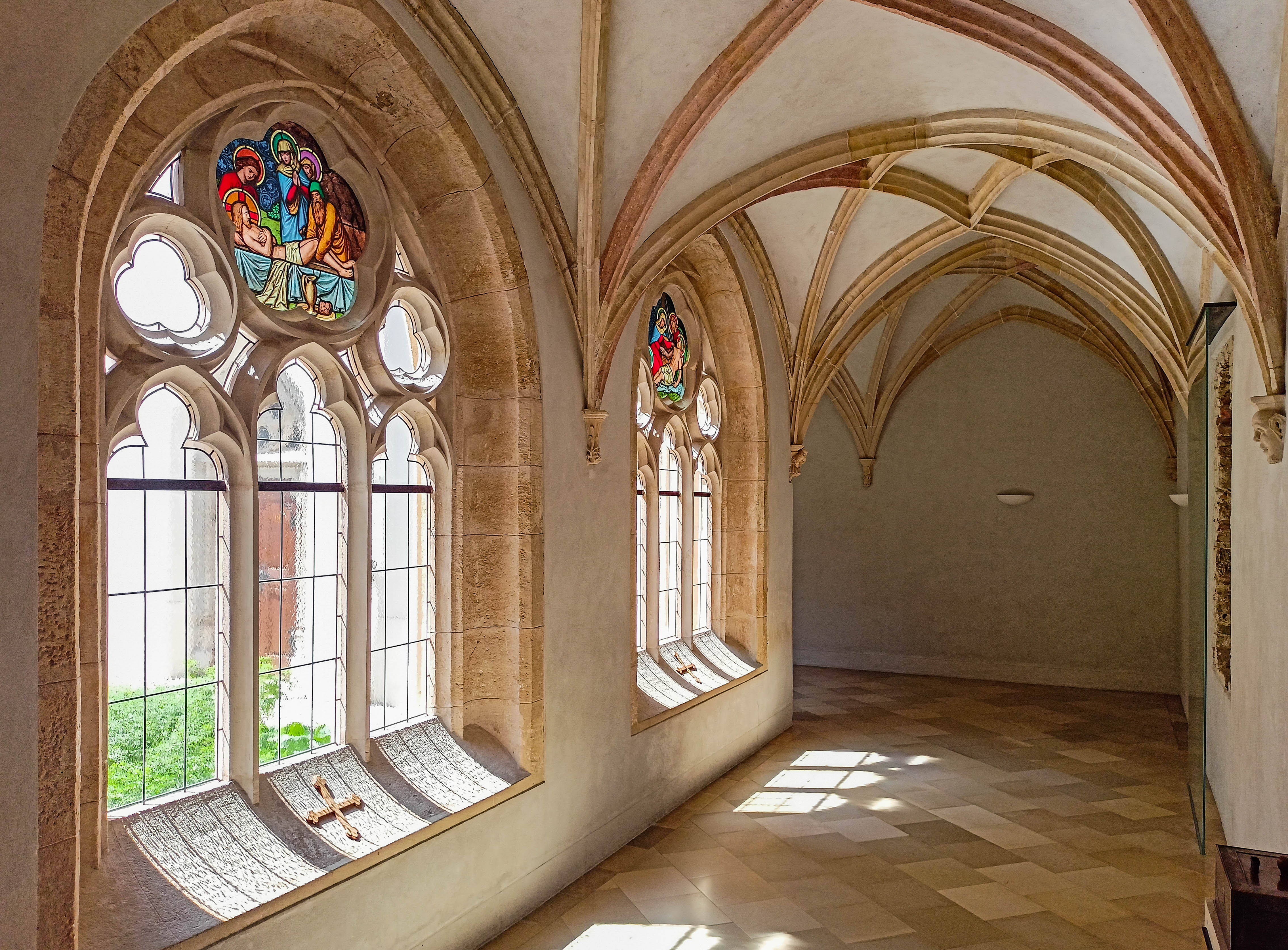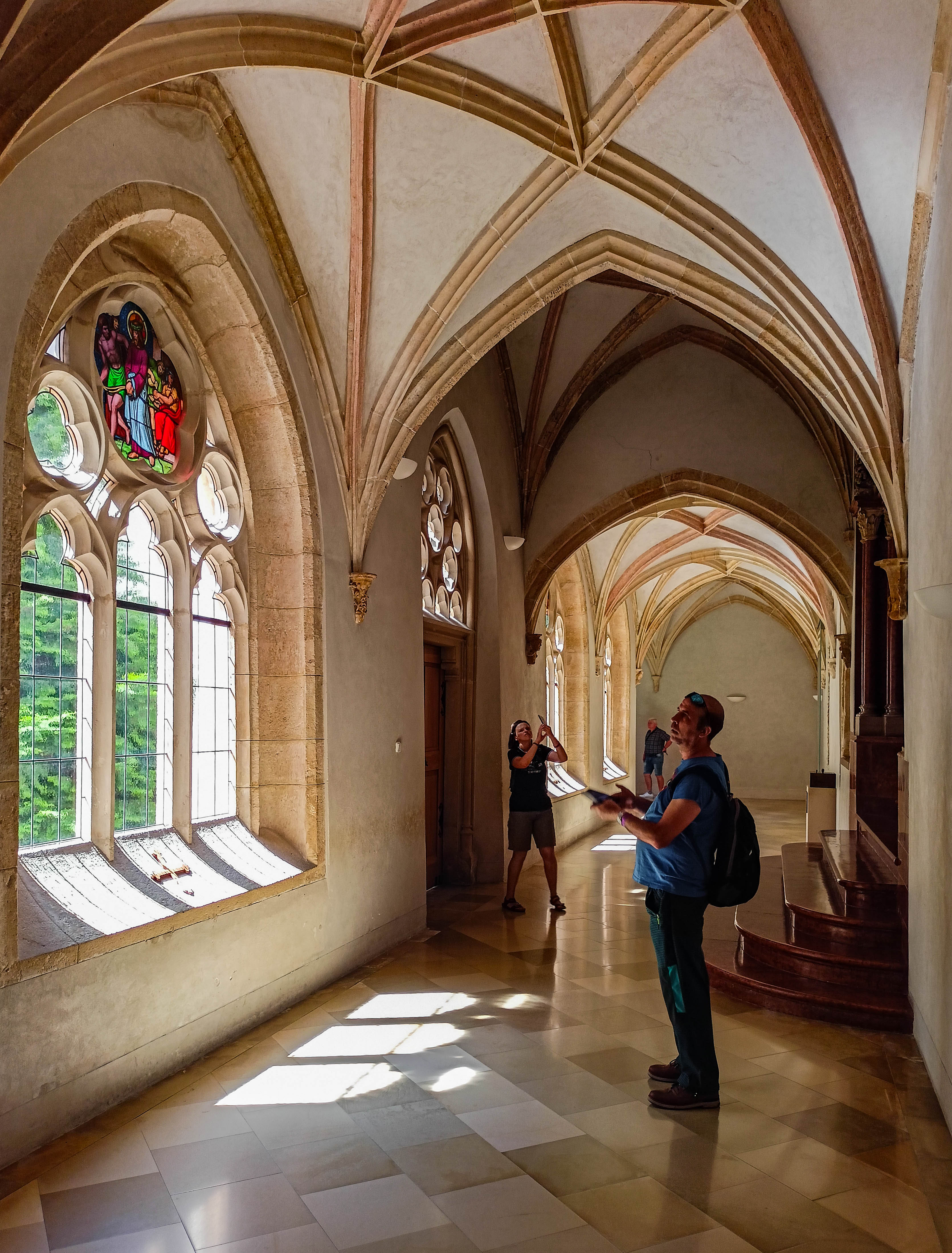 Wielbiciele gotyku powinni poczuć się tu jak ryby w wodzie. Oto wchodzi się na absolutnie zjawiskowy XV-wieczny krużganek, z żebrowymi (choć nie tylko) sklepieniami i oknami maswerkowymi zwieńczonymi witrażami, będącymi przystankami Drogi Krzyżowej. Co i rusz, u podnóża sklepień oko w oko spotkać się można z rzeźbami ludzkich twarzy, wedle przewodnika jaki czytałem mają one symbolizować ludzkie przywary. A skoro jest ich tylko 25 znaczy się, że ktoś nie przyłożył się do swojej pracy 😛