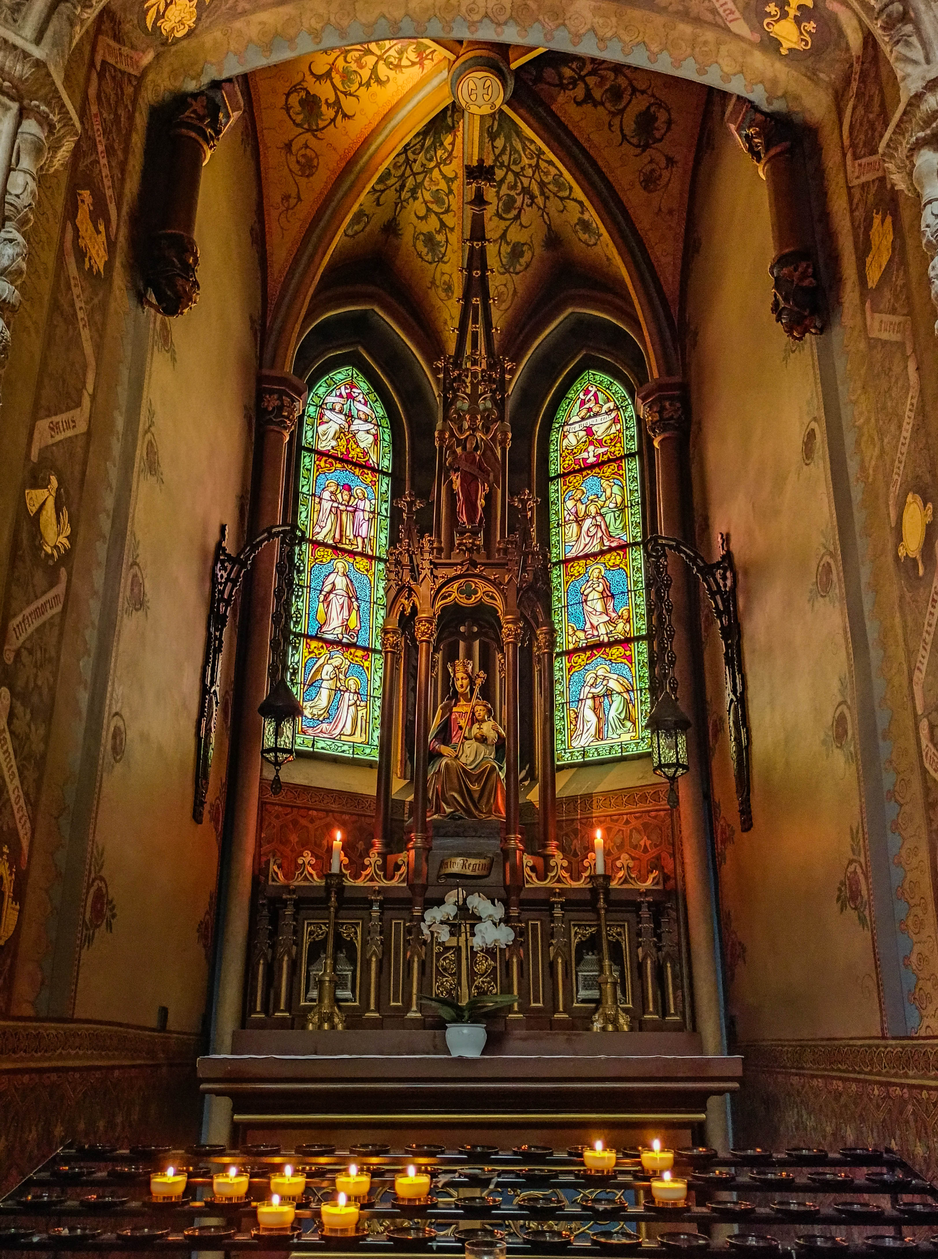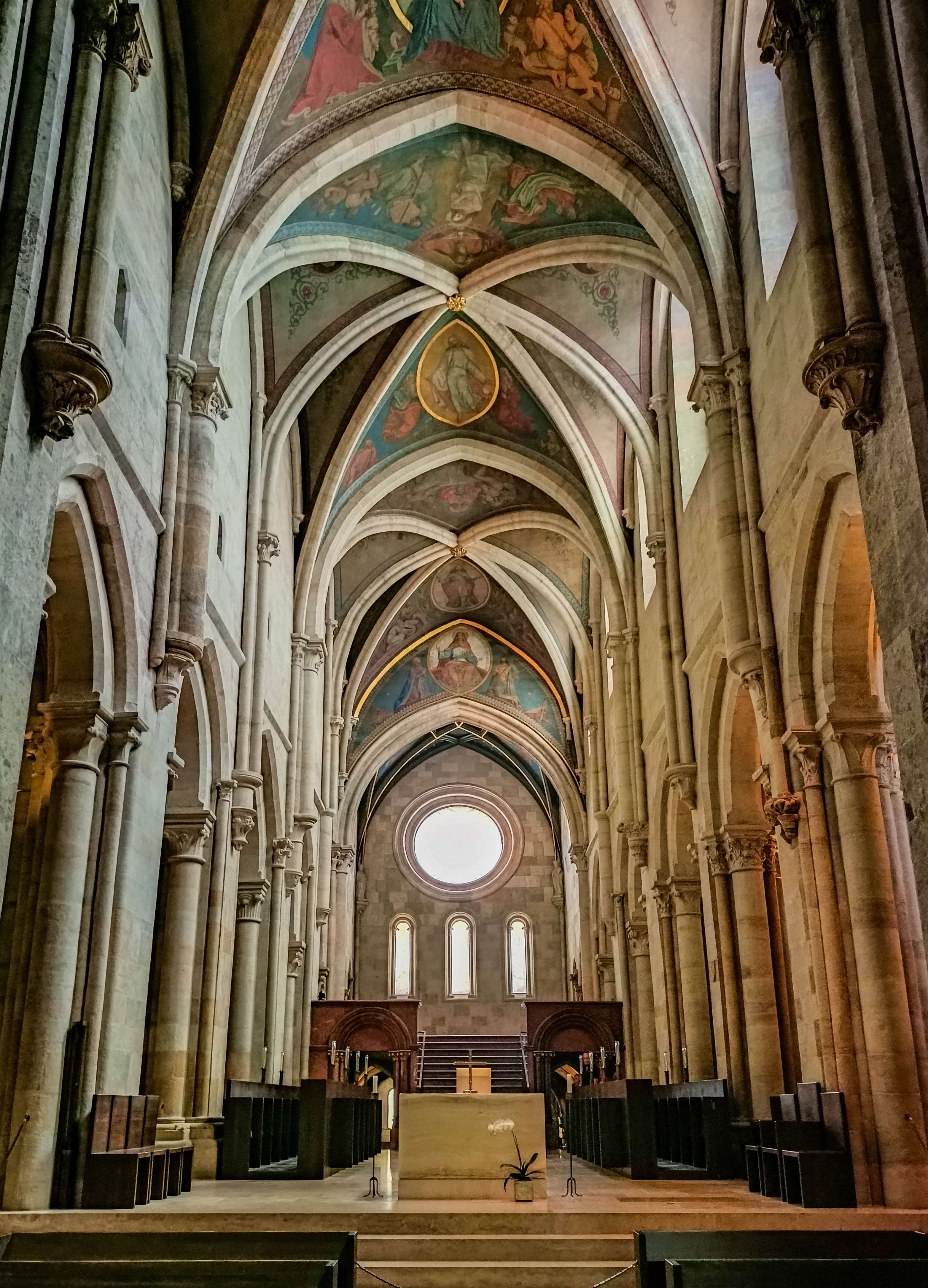 Surowość znika kiedy skierujemy wzrok w górę. Sklepienia robią niesamowite wrażenie, tak te nawy głównej, ale i naw bocznych a dokładniej ołtarzy się w nich znajdujących. Śmiem twierdzić, że tak pięknych, dopieszczonych i wymyślnych sklepień i polichromii dawno nie widziałem. Dodajmy do tego gotyckie drewniane ołtarze, piękne witraże i mamy bingo dla wielbicieli architektury sakralnej.