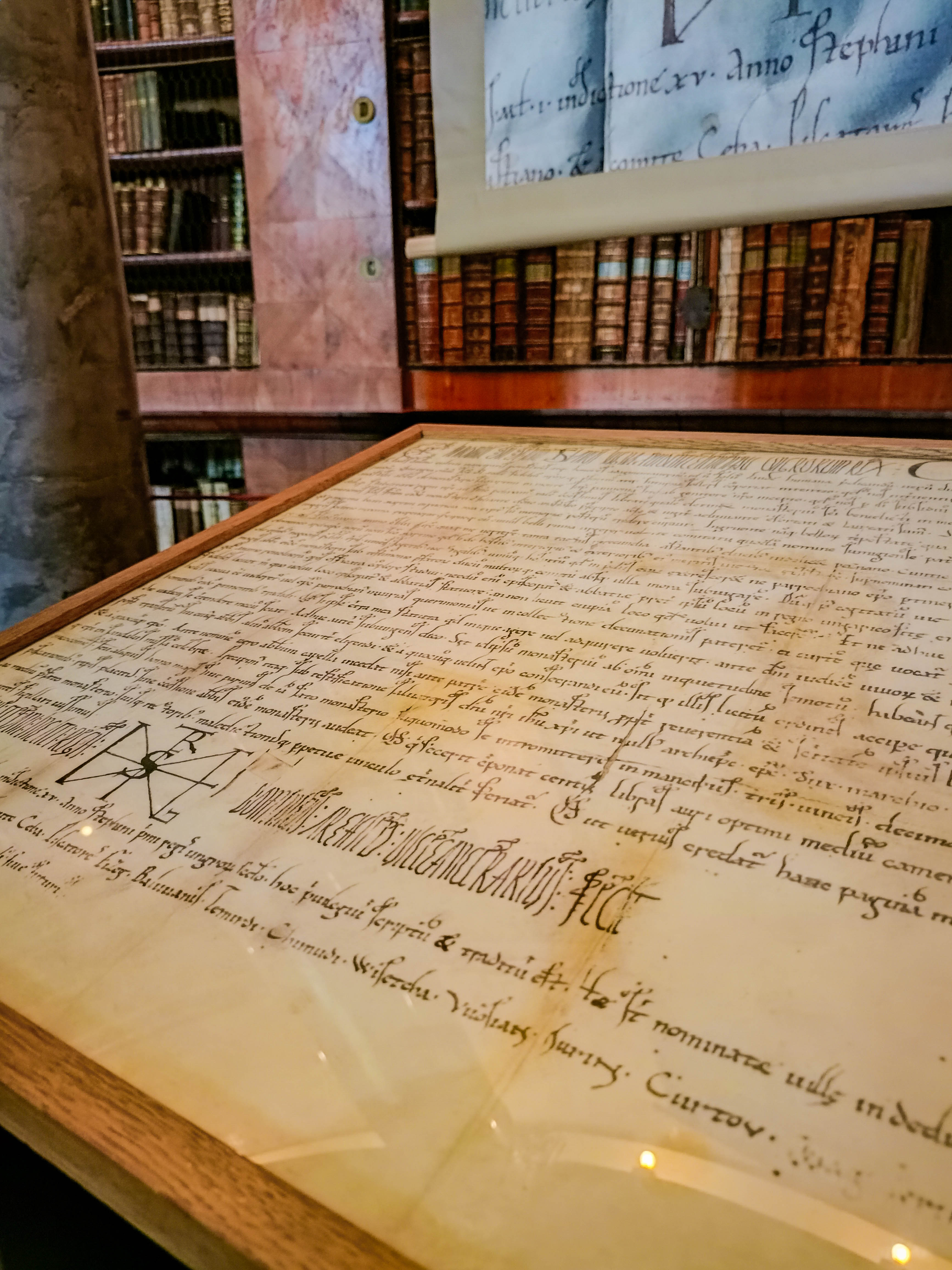 Czy jest to jedna z najważniejszych bibliotek na Węgrzech? Oczywiście. Spośród niemal 400 000 zebranych dzieł jest chyba to jedno najważniejsze, list fundacyjny zakonu w Tihany z bagatela 1050 roku! To najstarsze pismo przedstawiające język węgierski! Są średniowieczne kodeksy, jest pięknie zdobione, pełne iluminacji XVi-wieczne Pannonhalmi Evangelistarium. A to tylko szczyt góry lodowej.