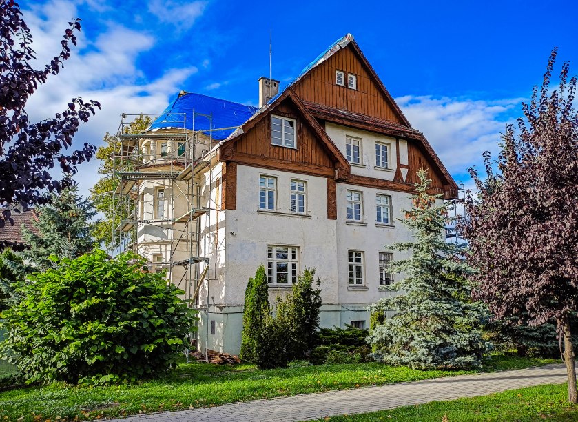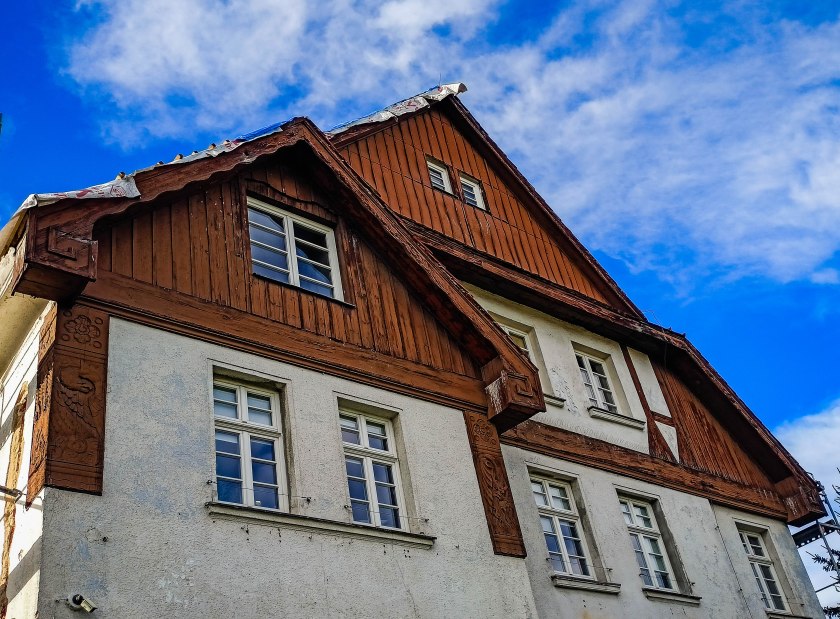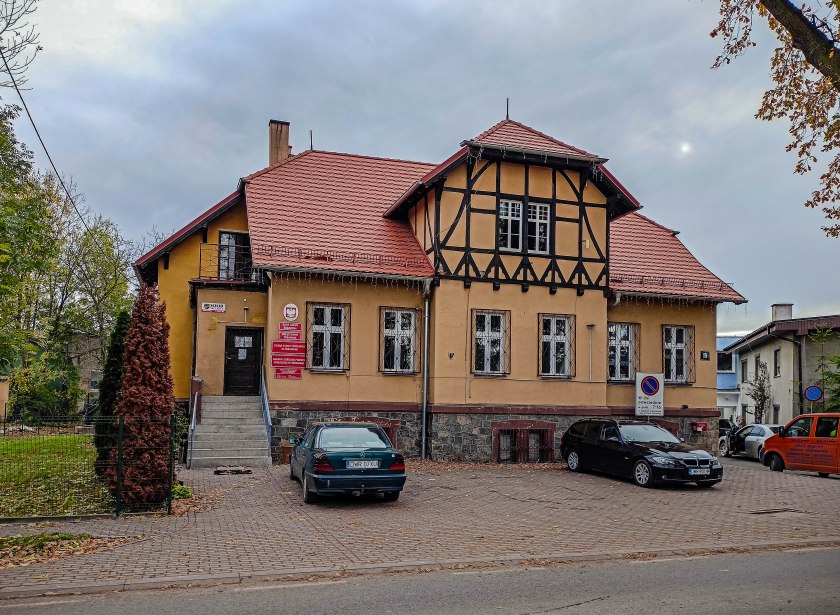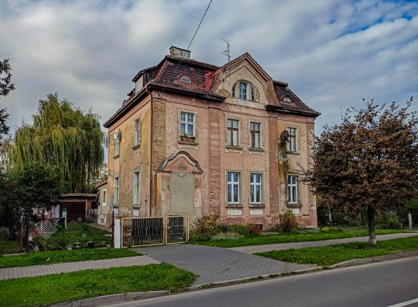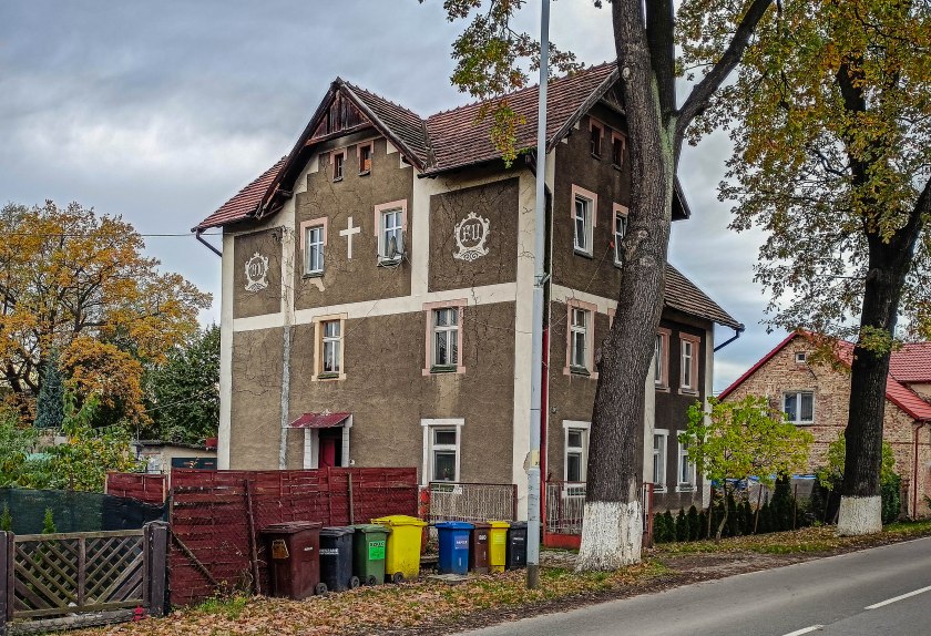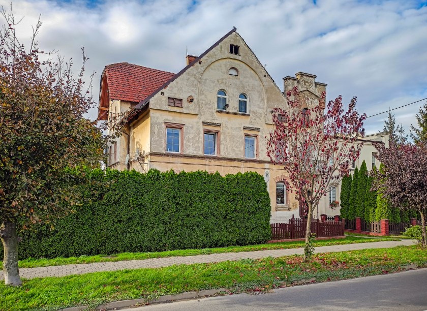 Mając trochę czasu poszwendałem się też po wsi szukając innych śladów po przeszłości. Nie ma ich dużo, ale było warto. Ot bardzo ciekawym przypadkiem jest Ulica Kolejowa, będąca śladem po przemysłowym rozwoju miasta w XIX wieku, kiedy to we wsi powstawały fabryki, m.in. cygar czy mebli. A jak fabryki to i fabrykanckie wille. Jedna z nich, należąca do Augusta Assiga to dziś siedziba Urzędu Gminy. Bardzo fajny budynek z drewnianymi elementami. Po sąsiedzku dawna siedziba poczty a zaraz obok… siedziba trochę młodsza.